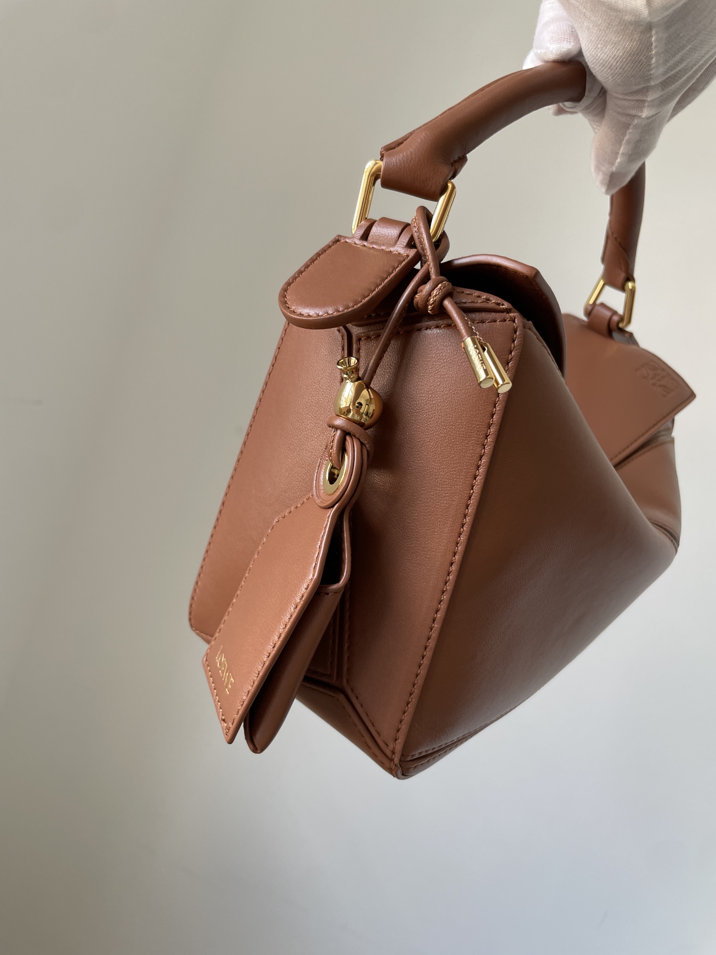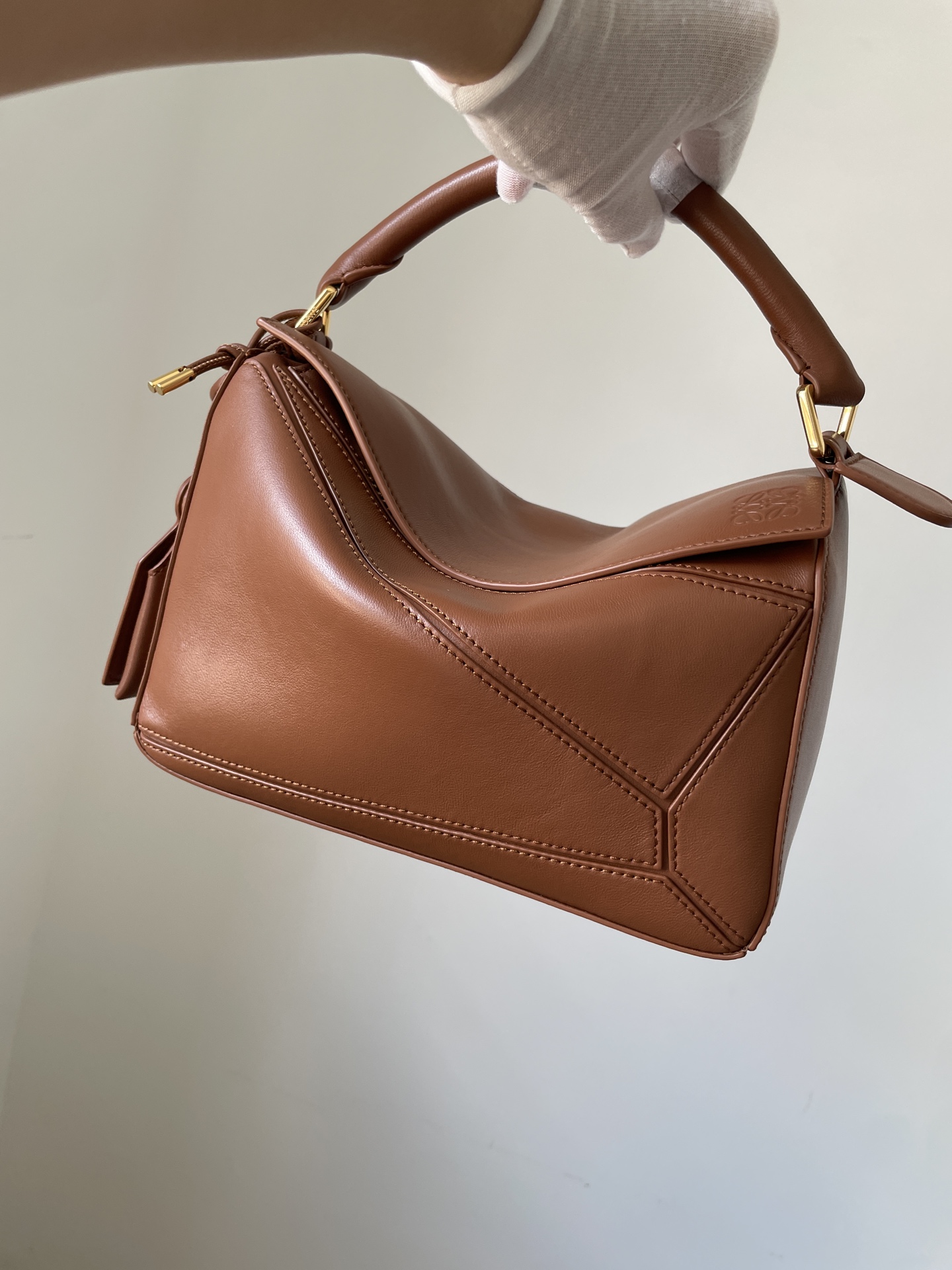 LOEWE Puzzle small bag in brown lambskin leather — soft, lightweight, and refined.