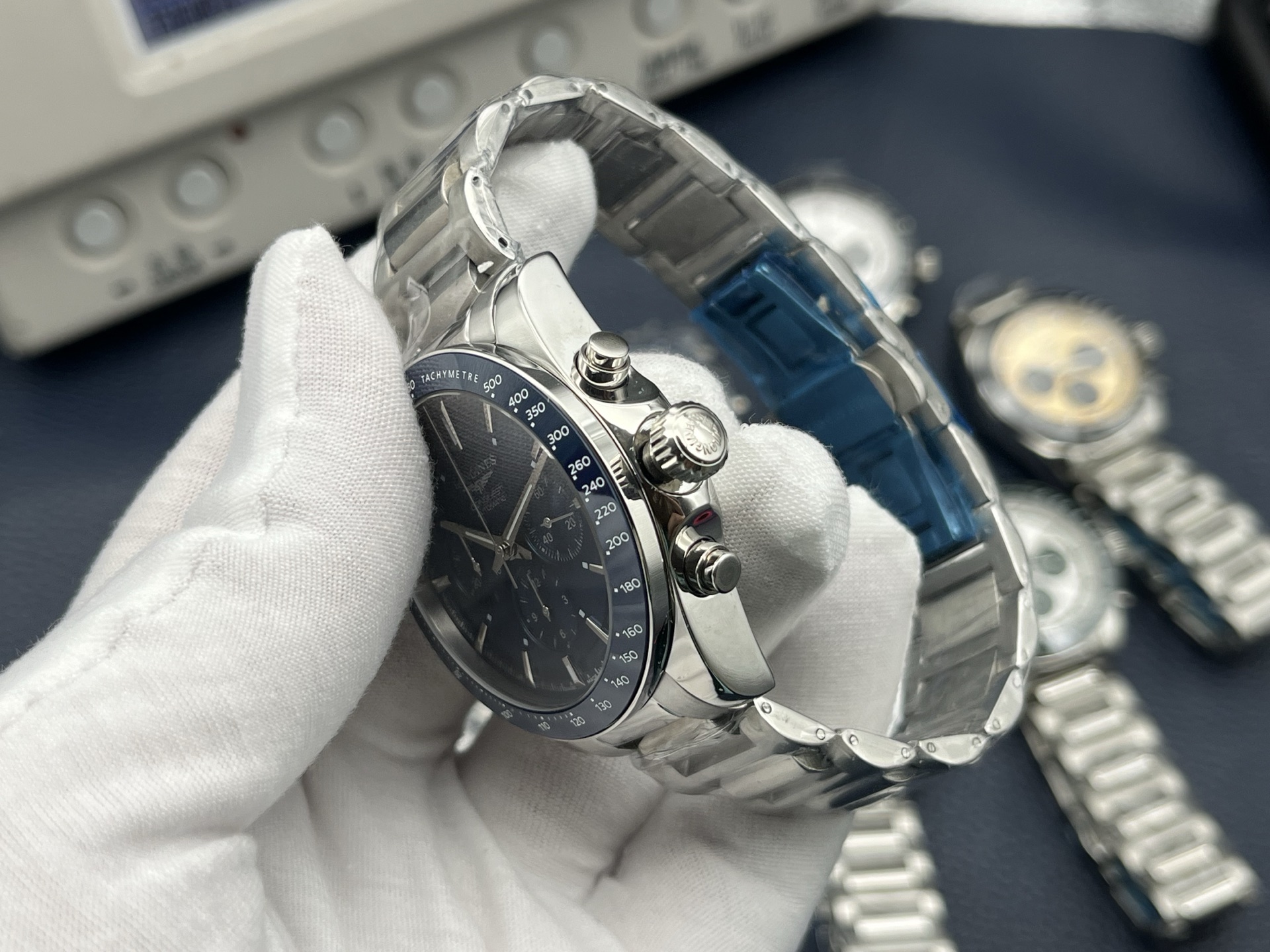 **Dial:** Blue sunburst dial with three sub-dials and luminous hands.