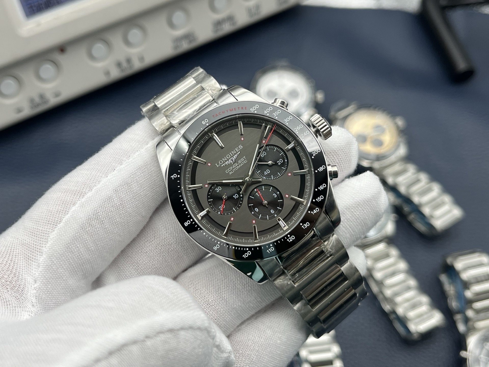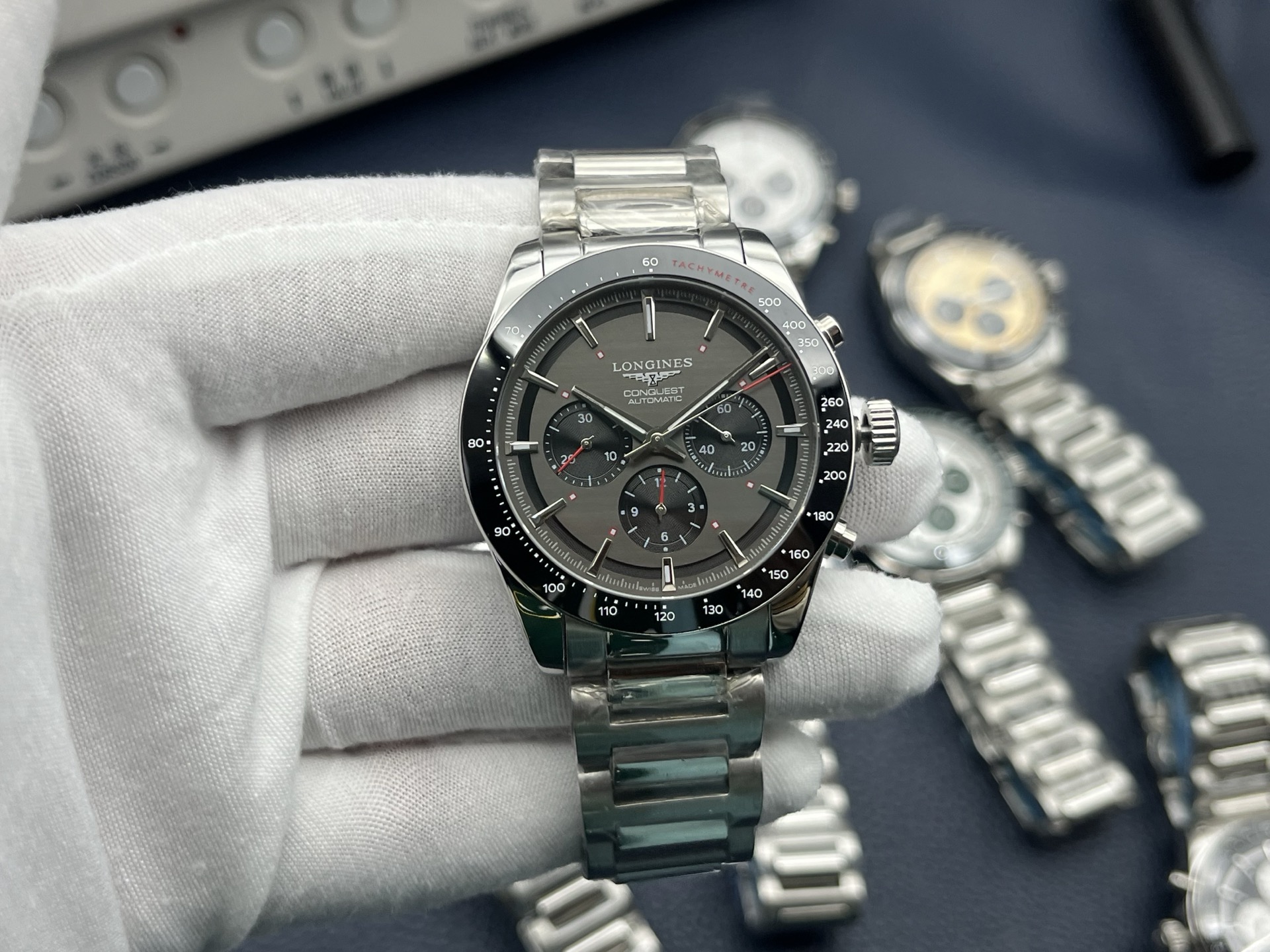 **Bezel:** Grey ceramic bezel with engraved tachymeter scale.