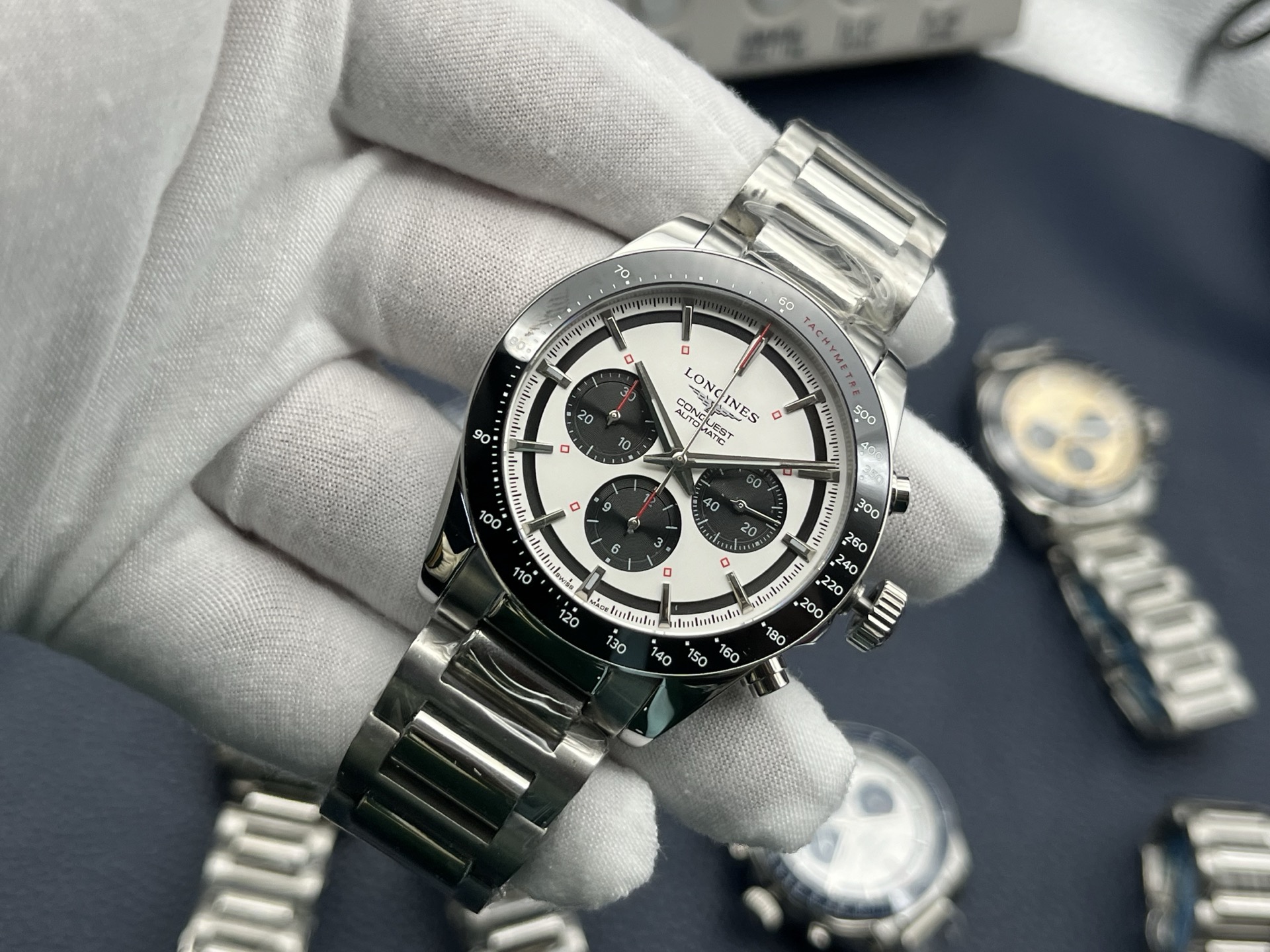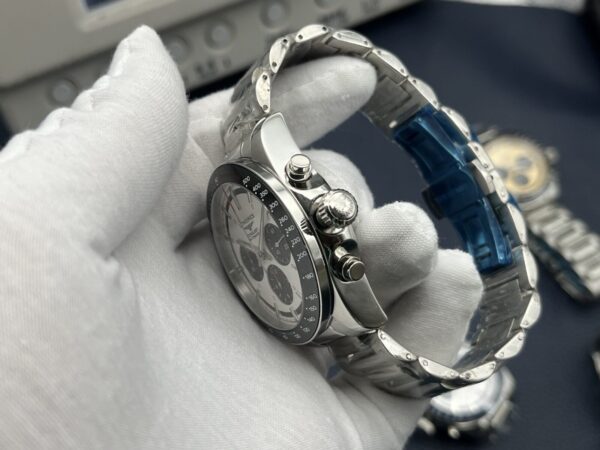 **Dial:** White dial with black sub-dials, luminous hands, and date display.