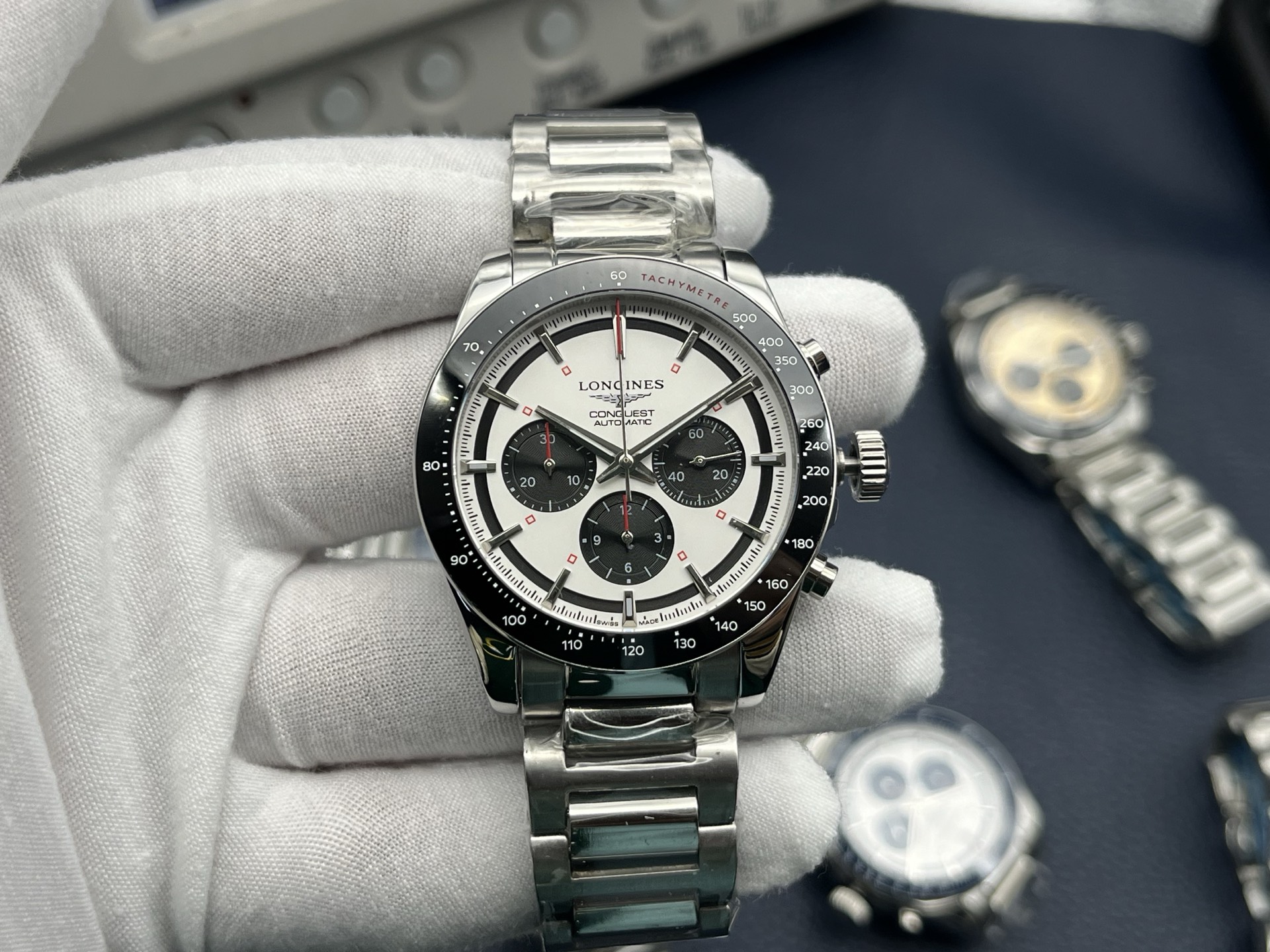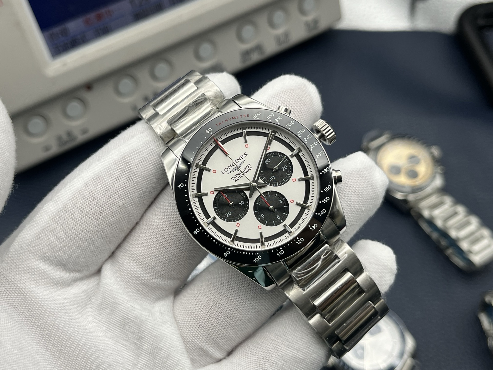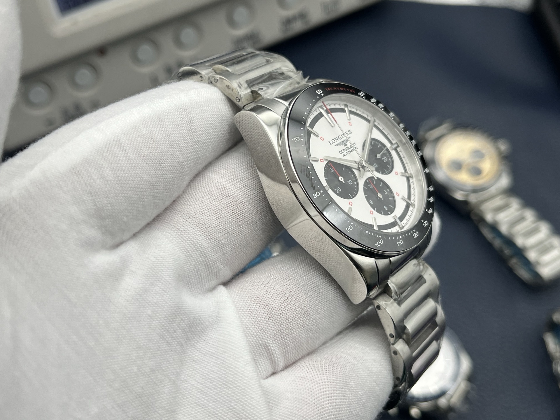 **Bezel:** White ceramic bezel with engraved tachymeter scale.