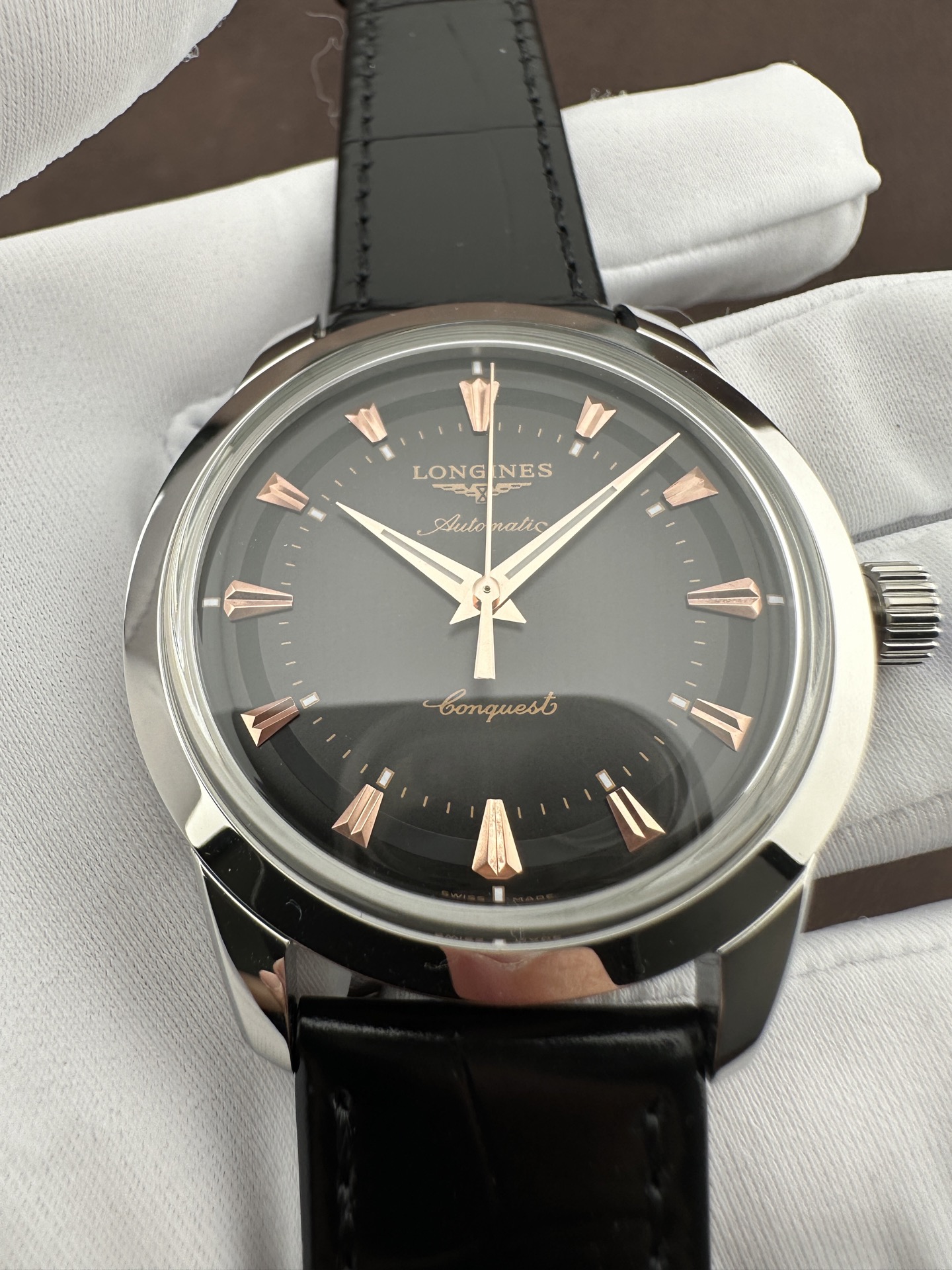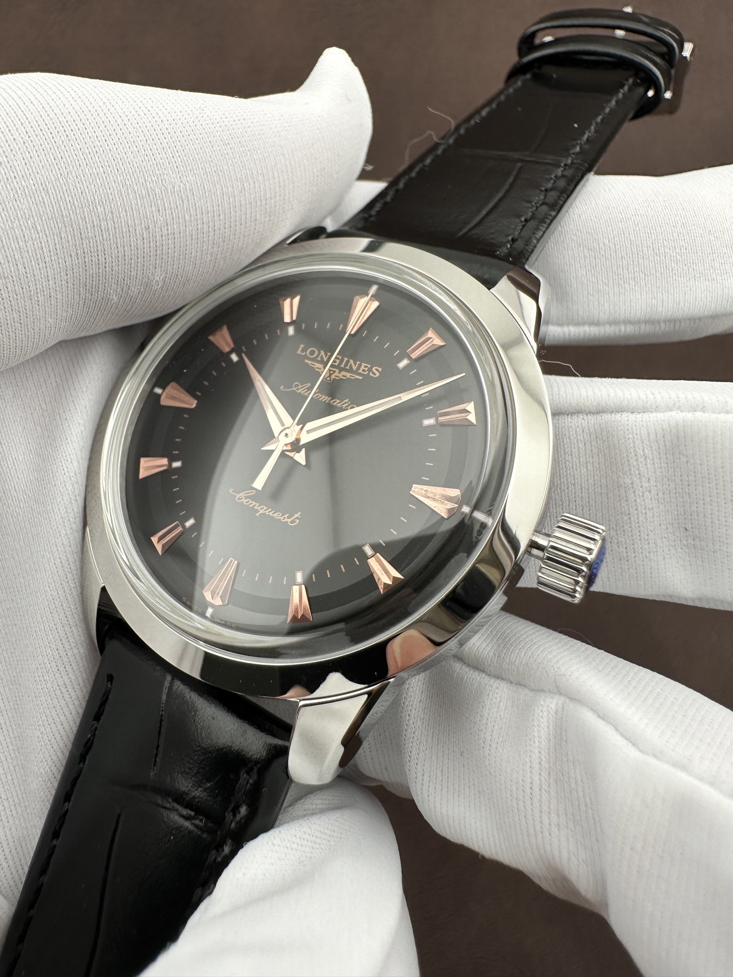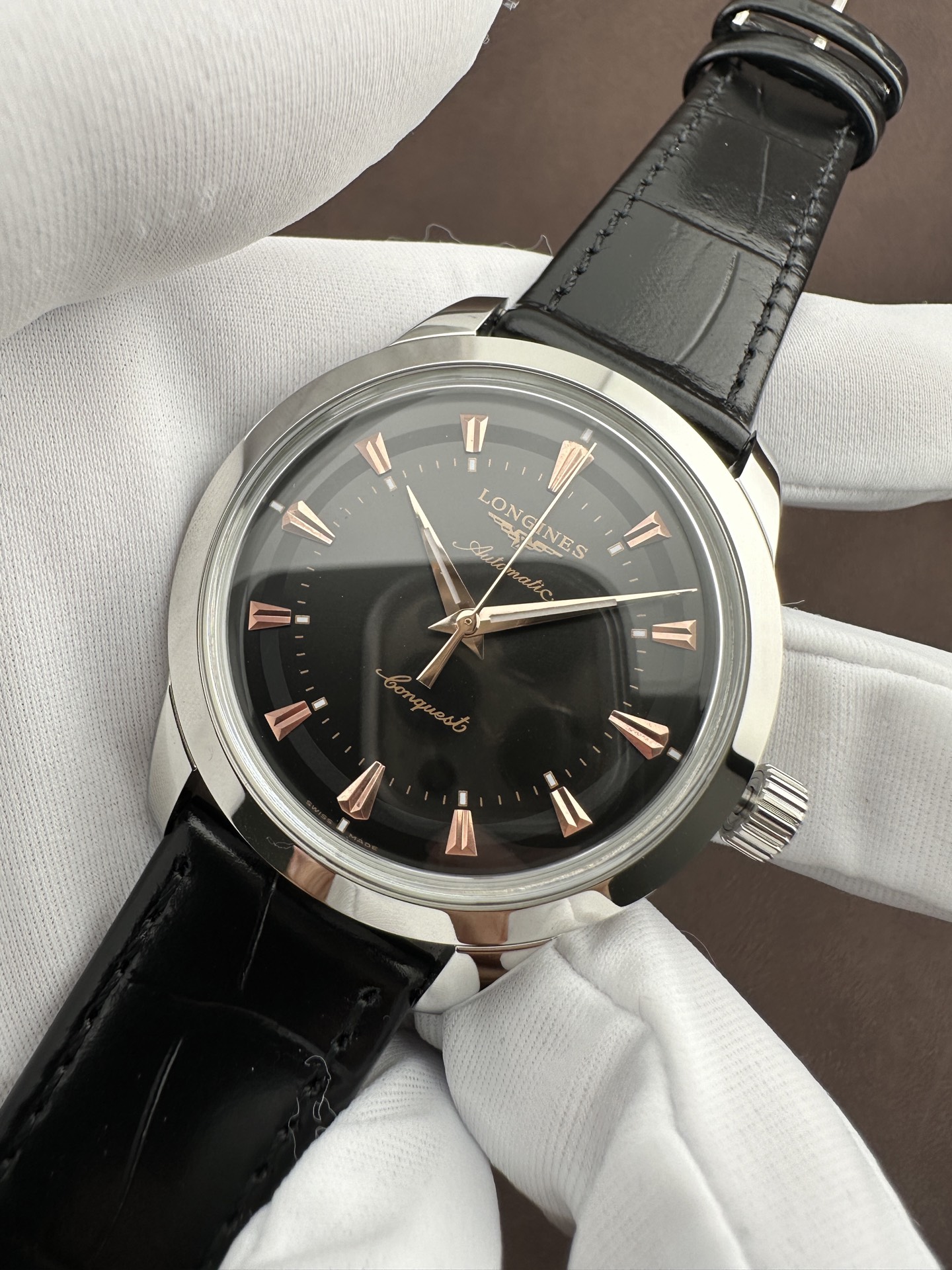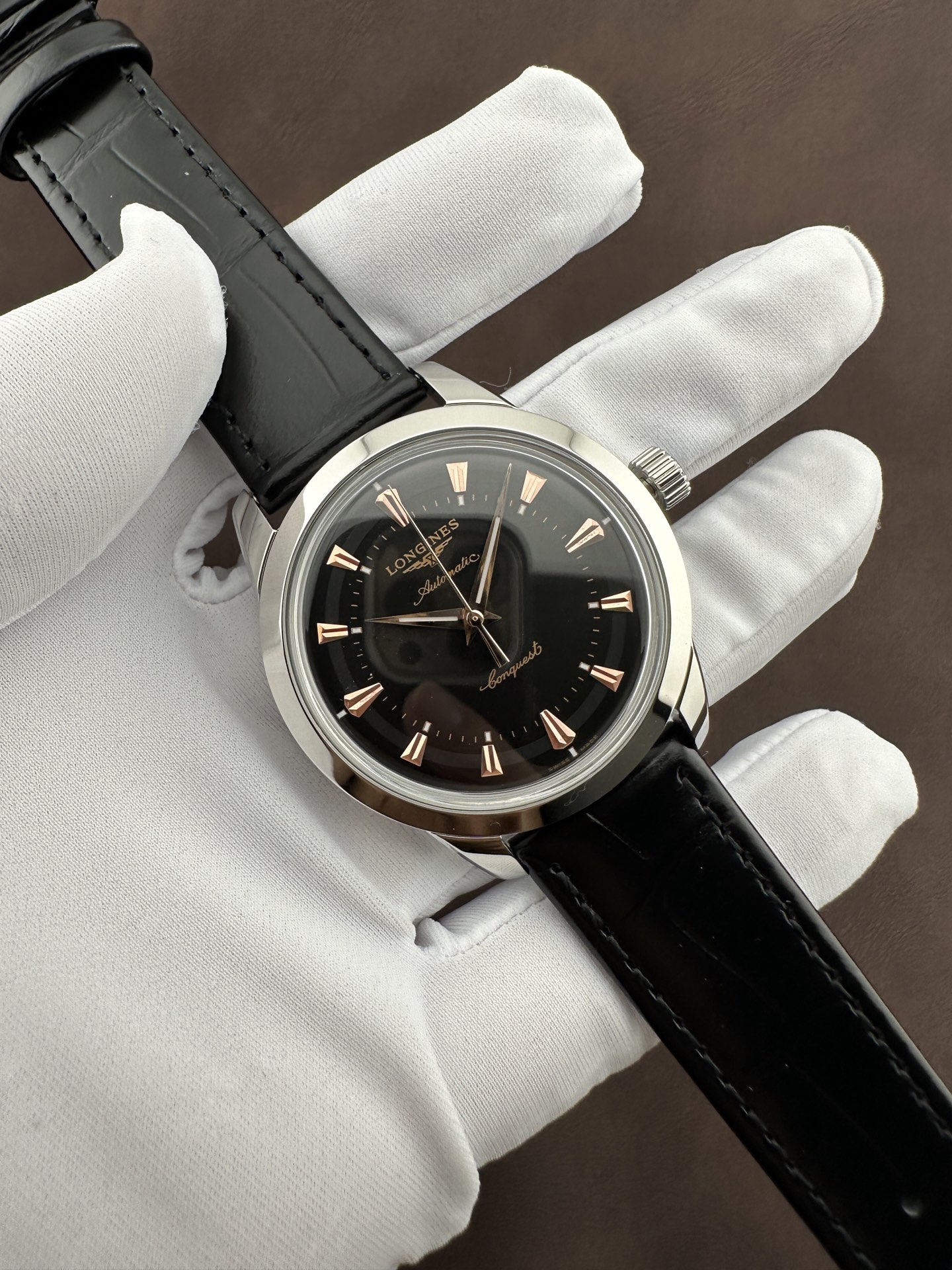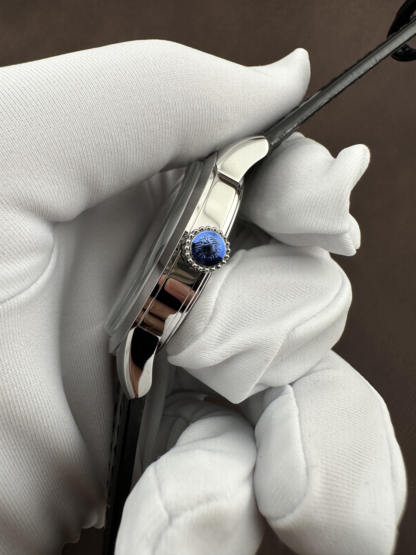 **Dial:** Black dial with applied indexes and winged hourglass logo.