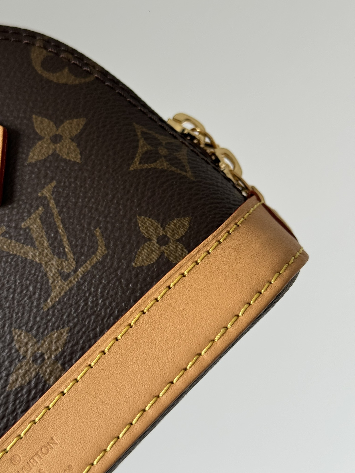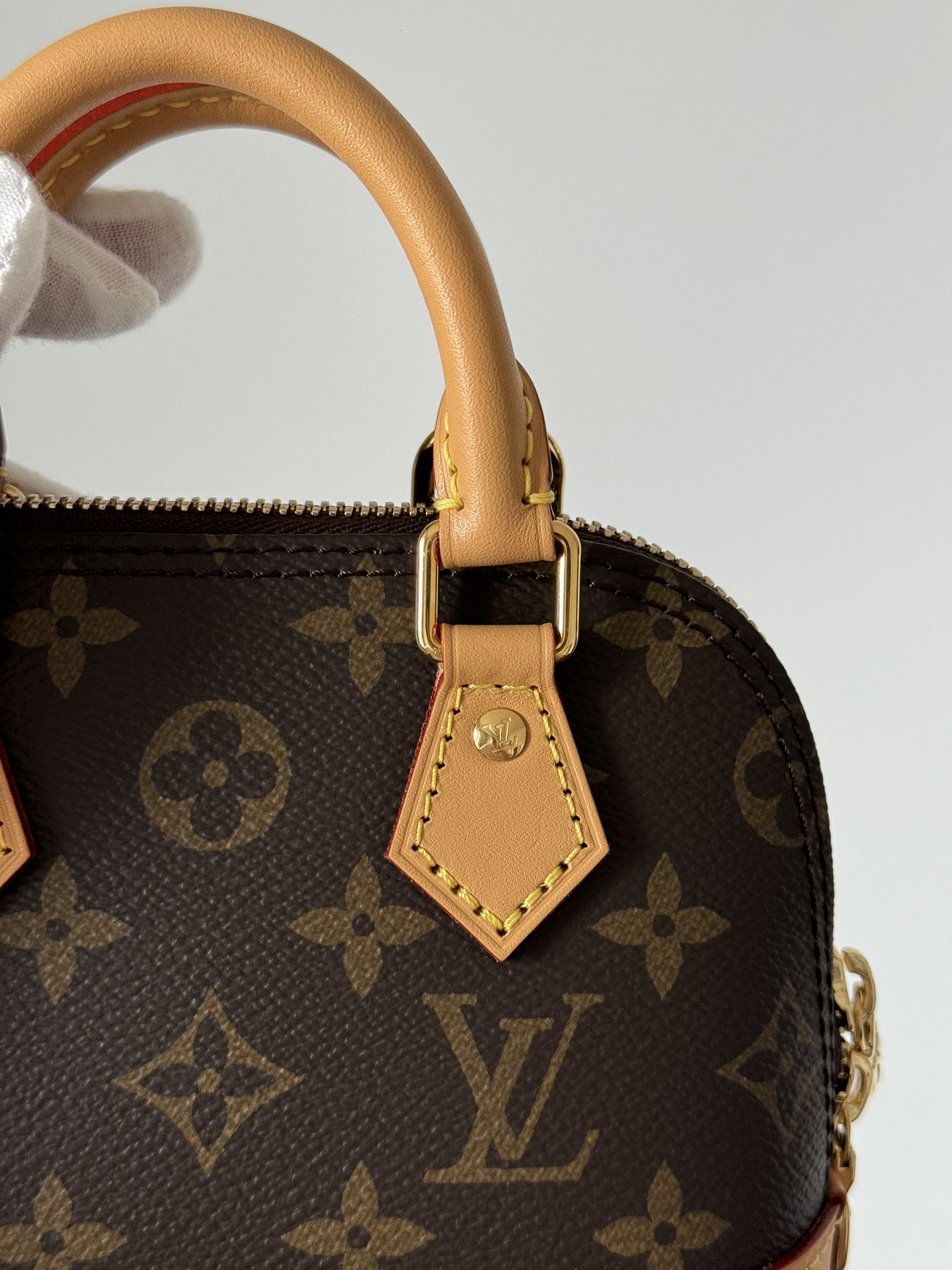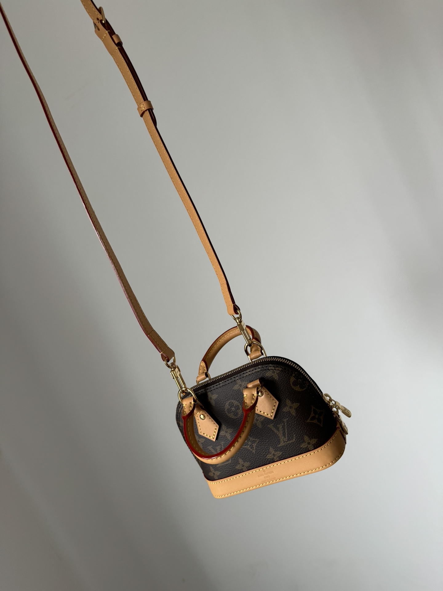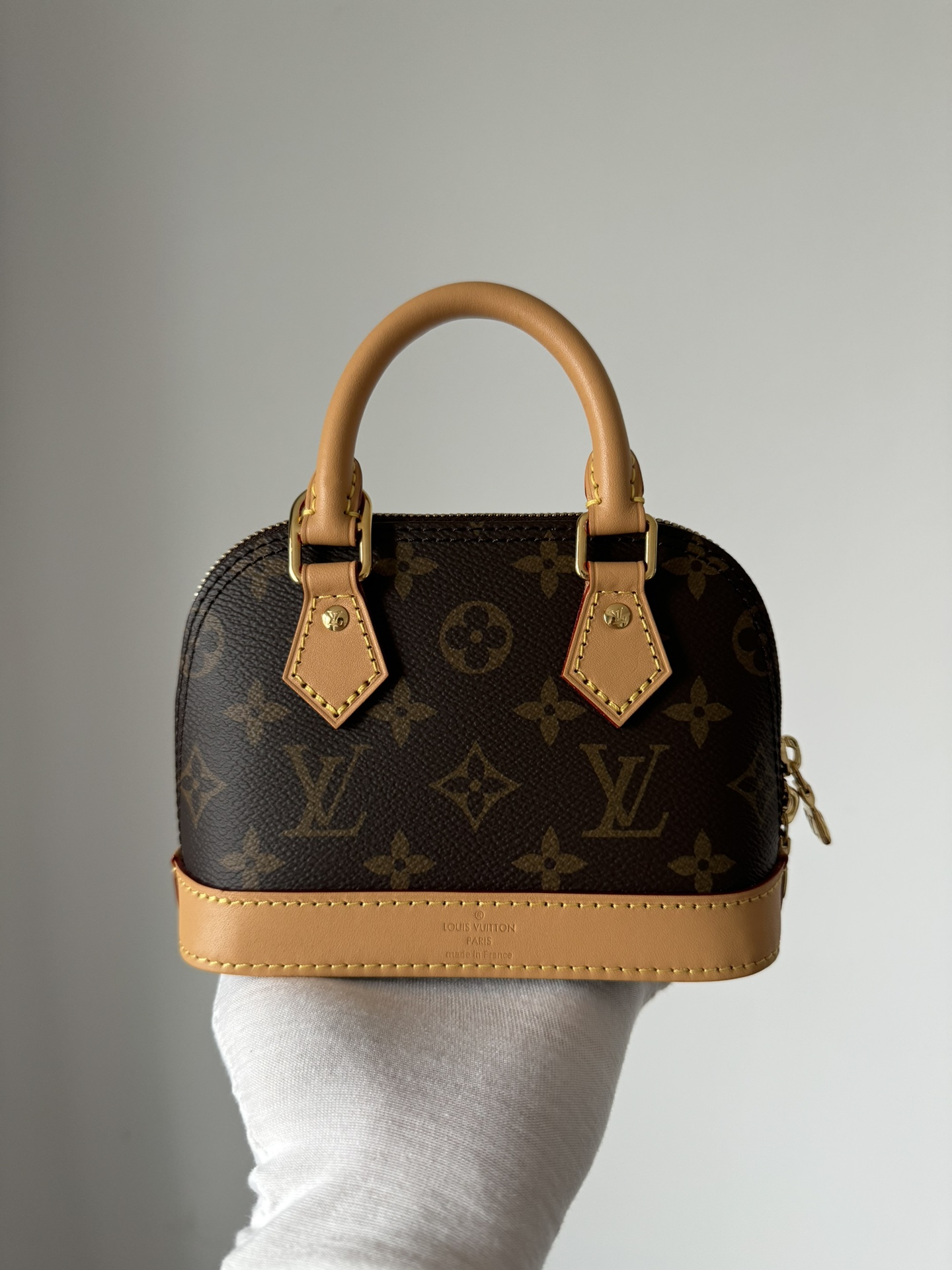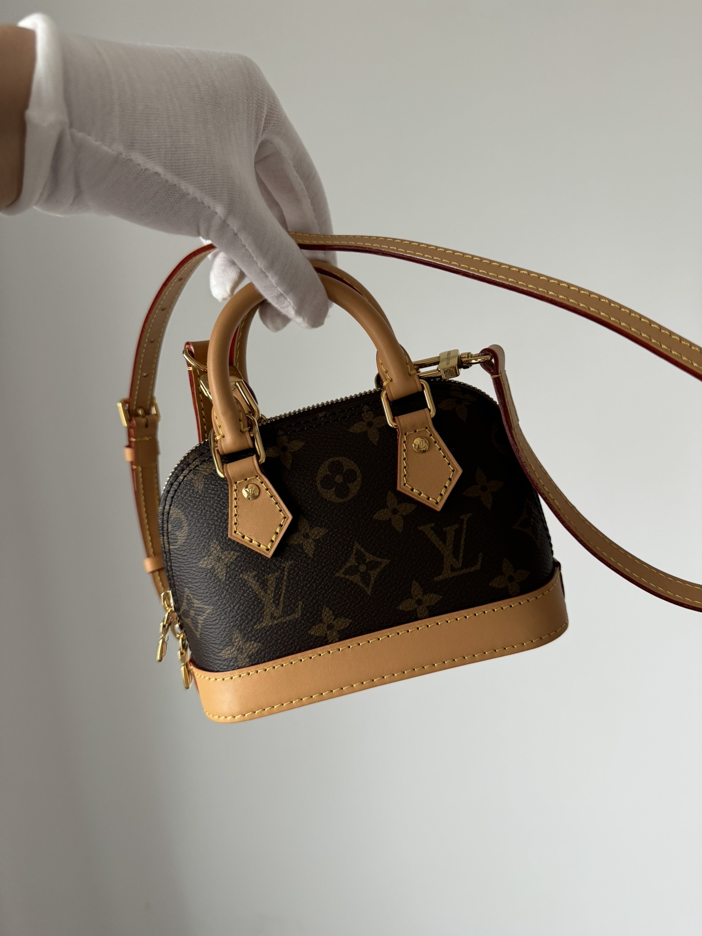 Louis Vuitton Nano Alma bag in Monogram canvas with double zip closure.
