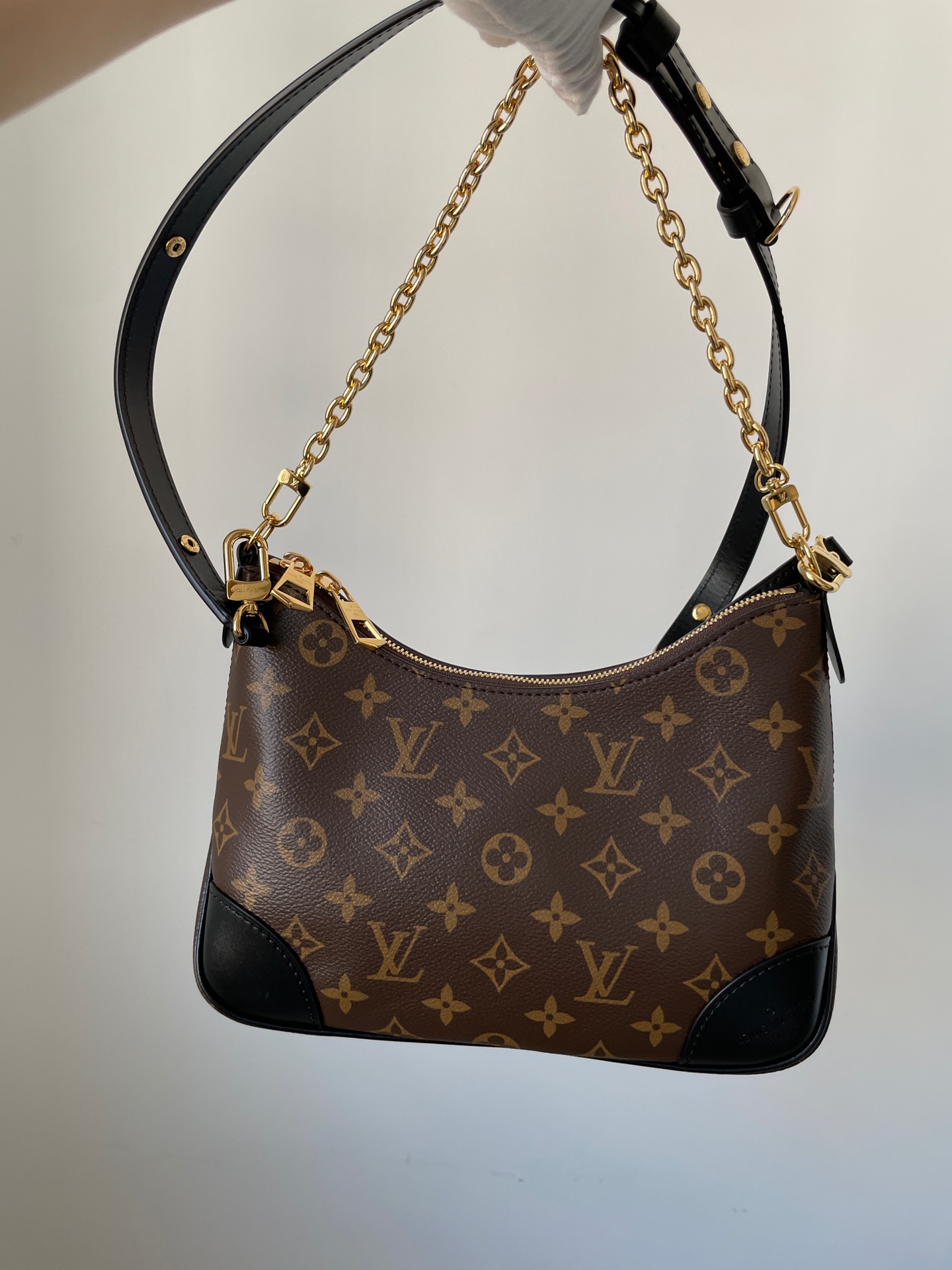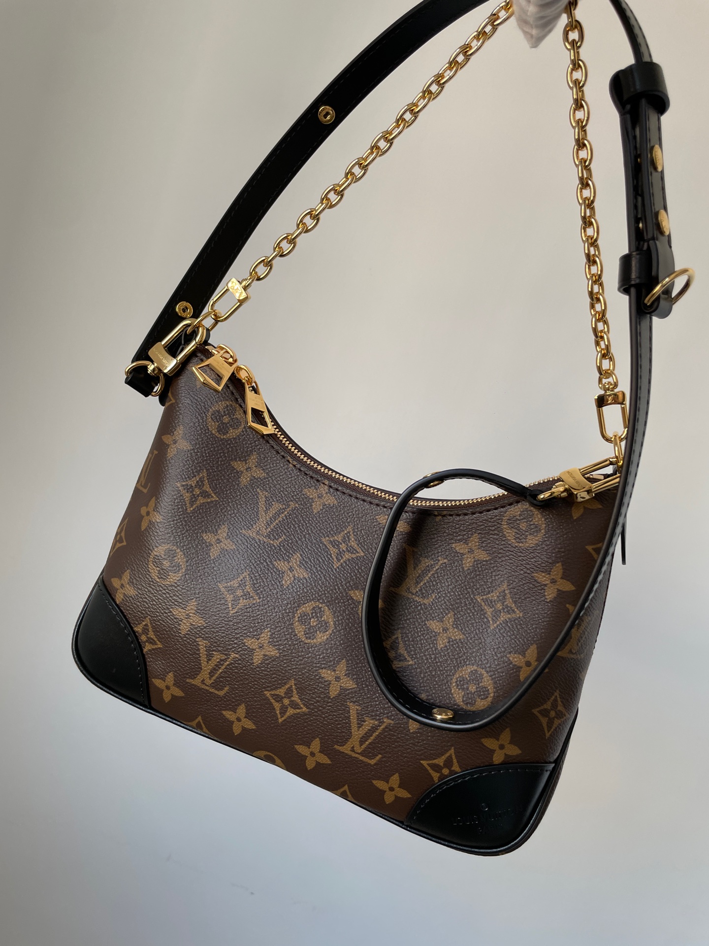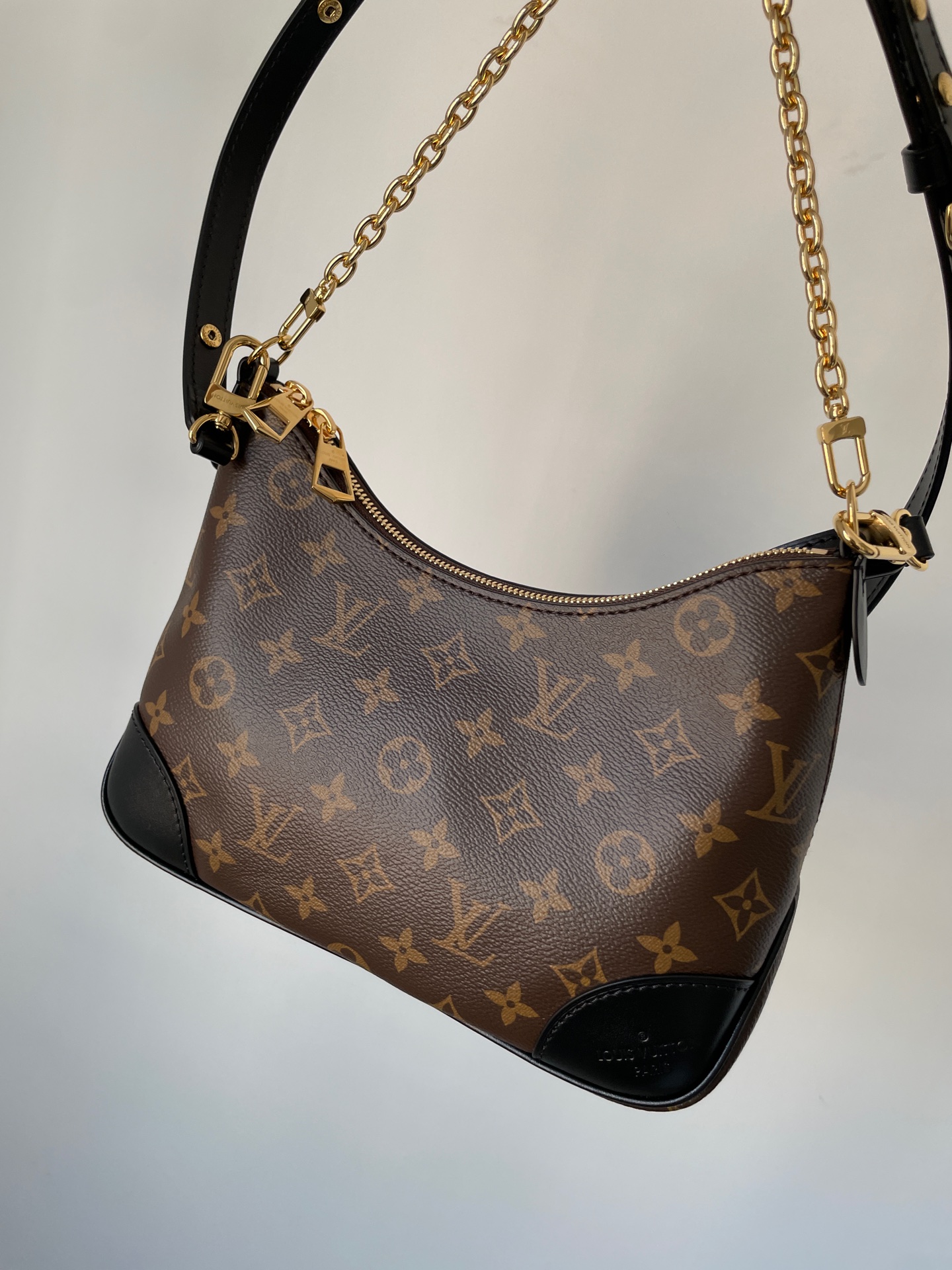 Boulogne small bag in Monogram canvas with detachable strap and chain. Can be worn on the shoulder, crossbody, or carried as a clutch.