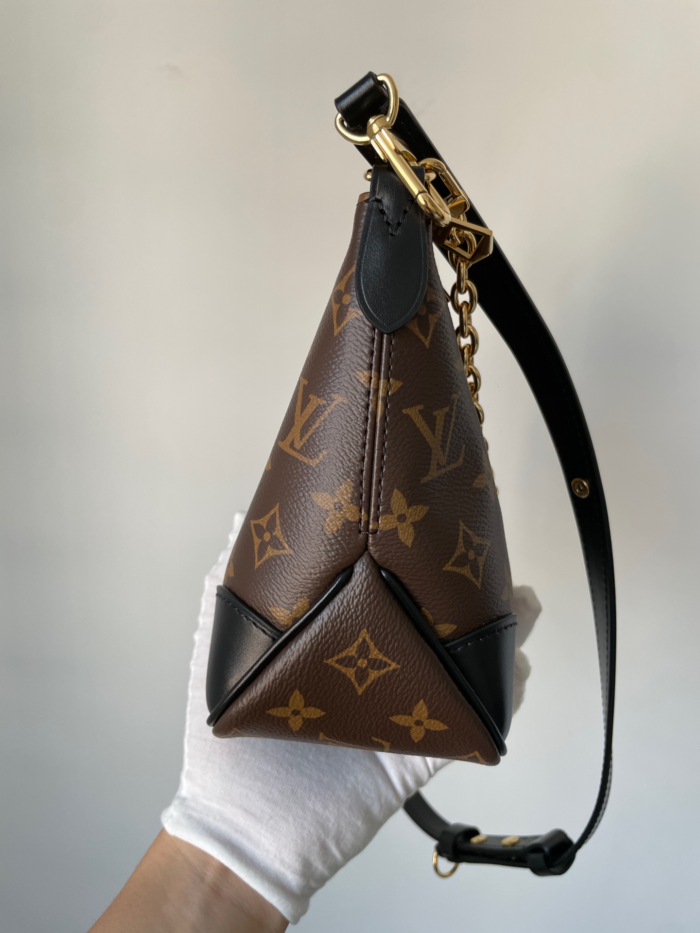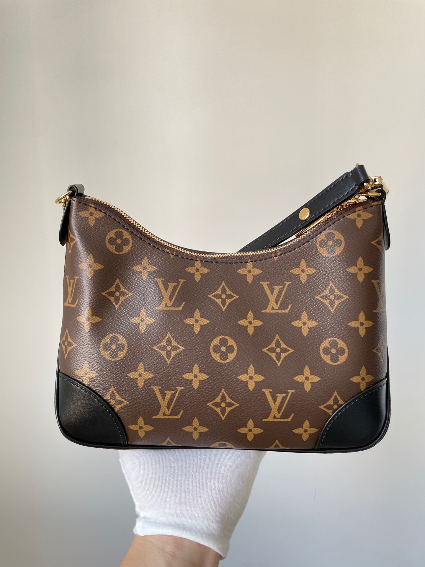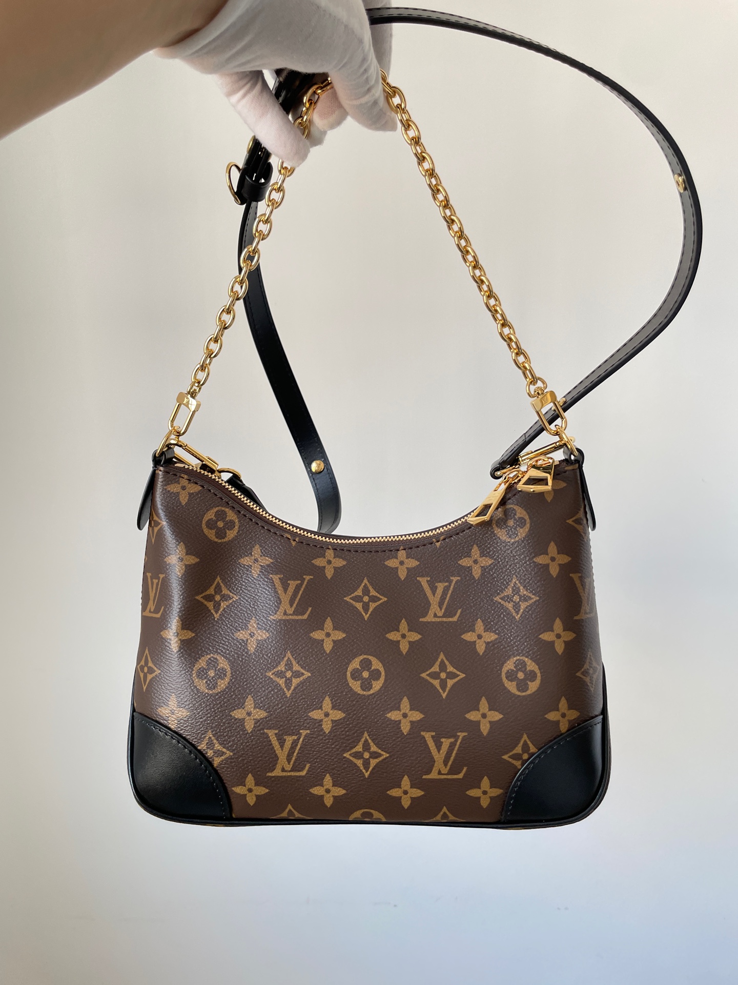 Boulogne small bag in Monogram canvas with detachable strap and chain. Can be worn on the shoulder, crossbody, or carried as a clutch.