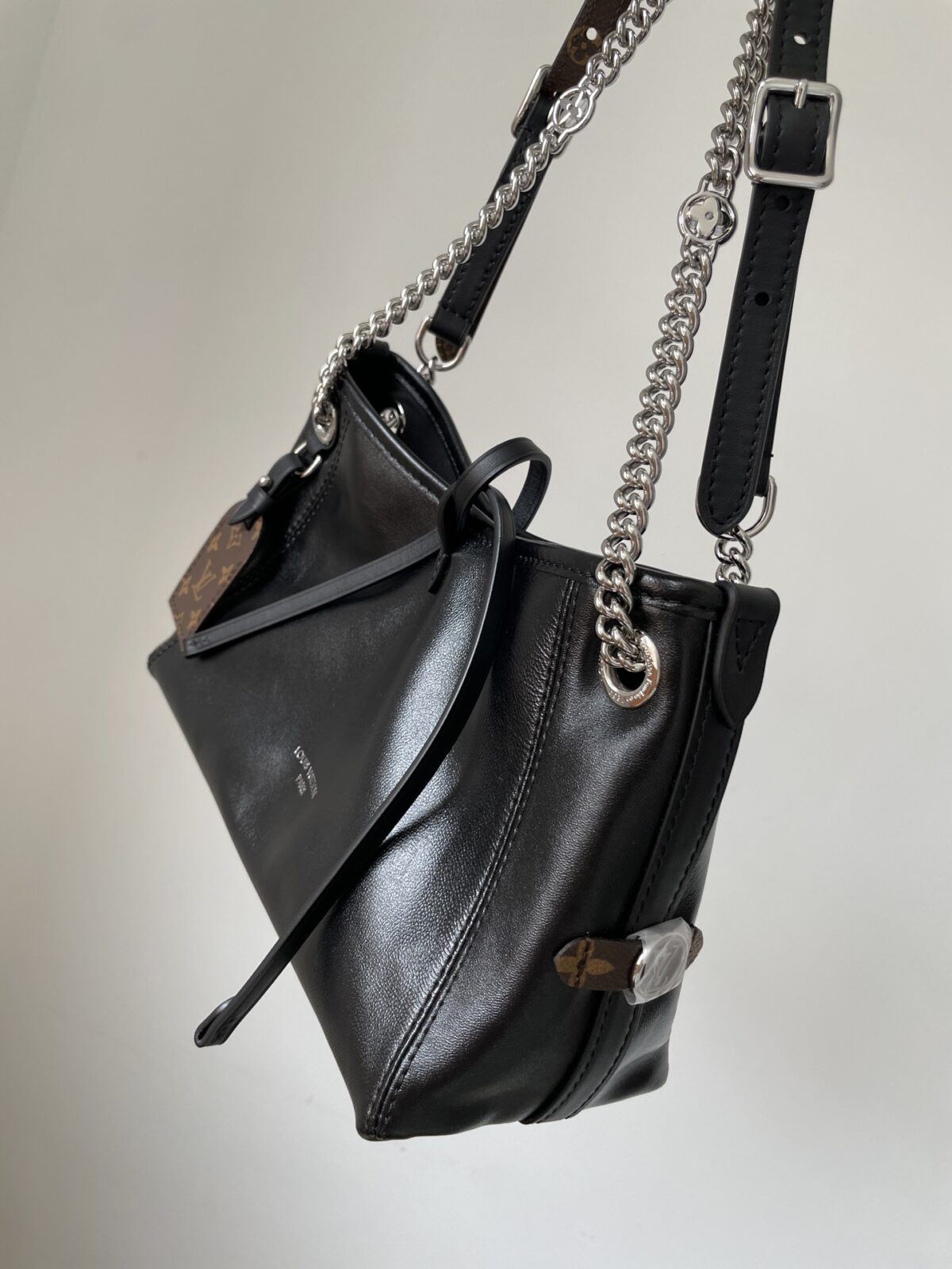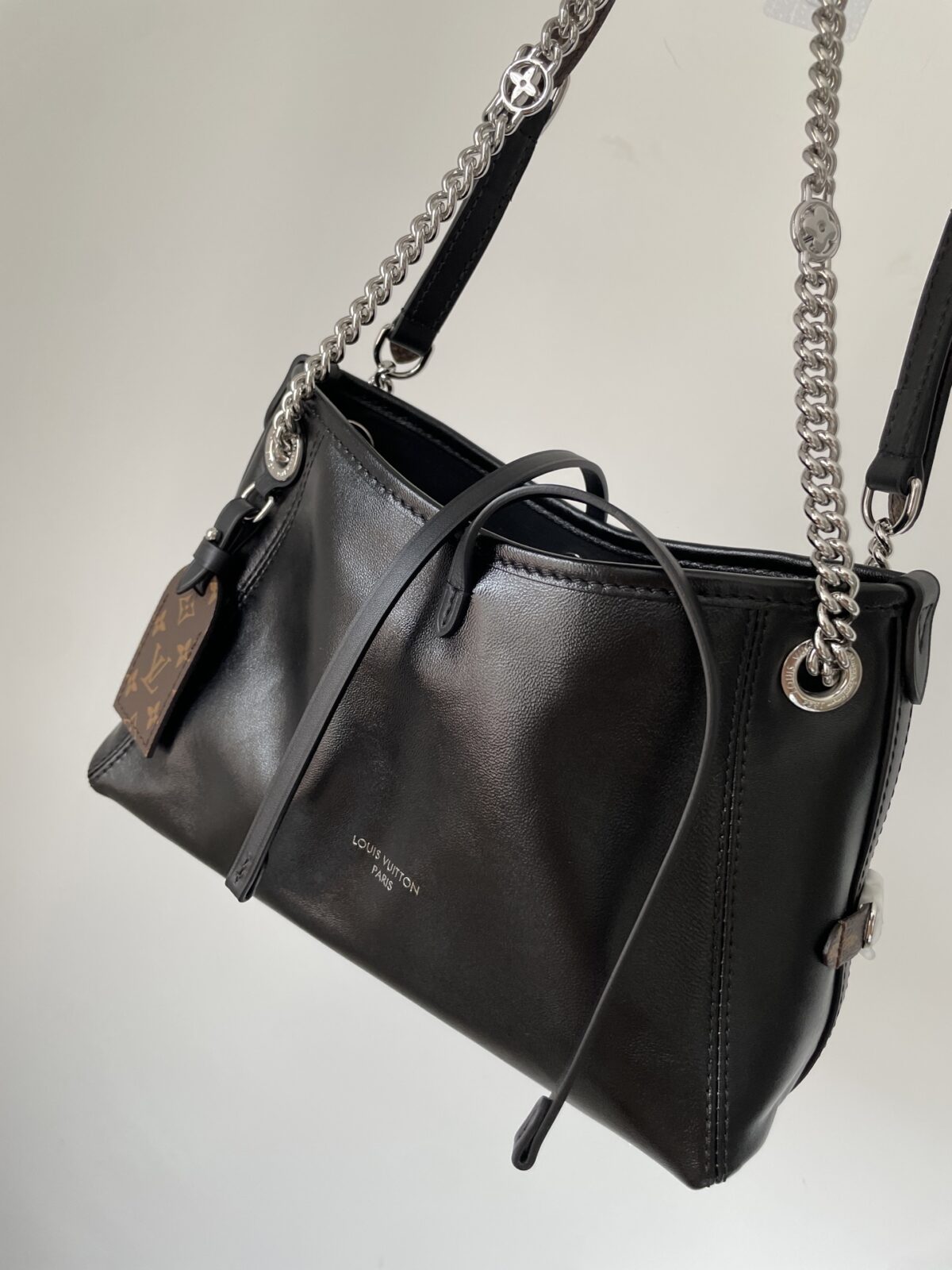 Louis Vuitton CarryAll BB bag in lambskin with Monogram flower chain detail.