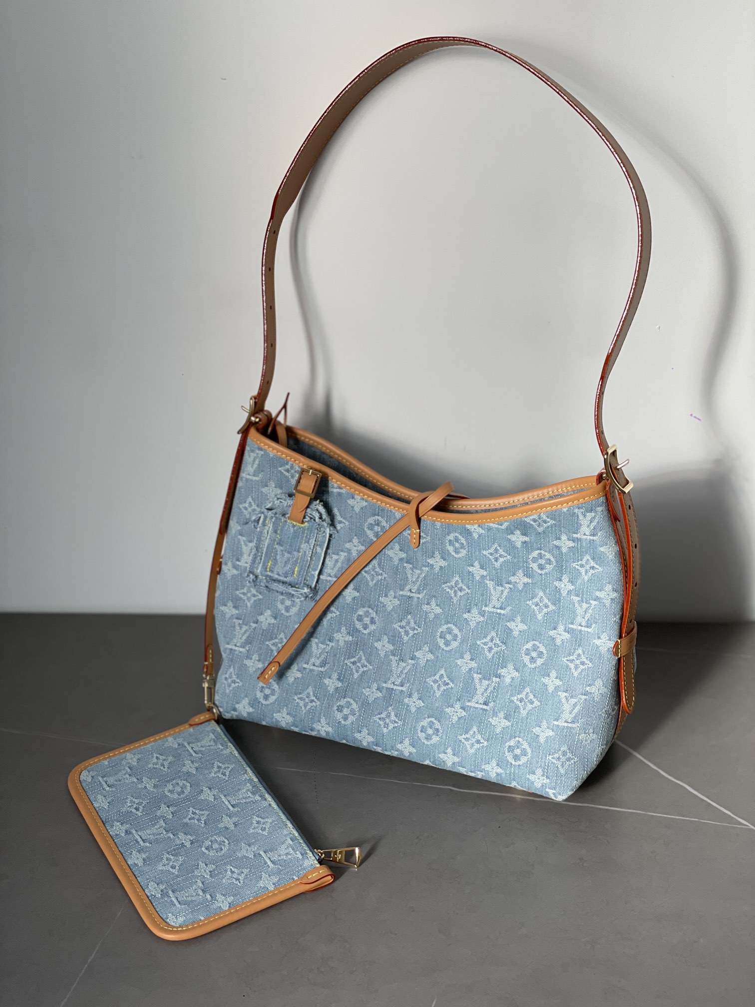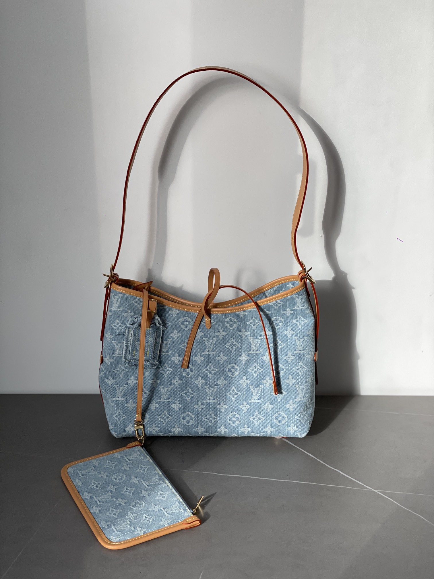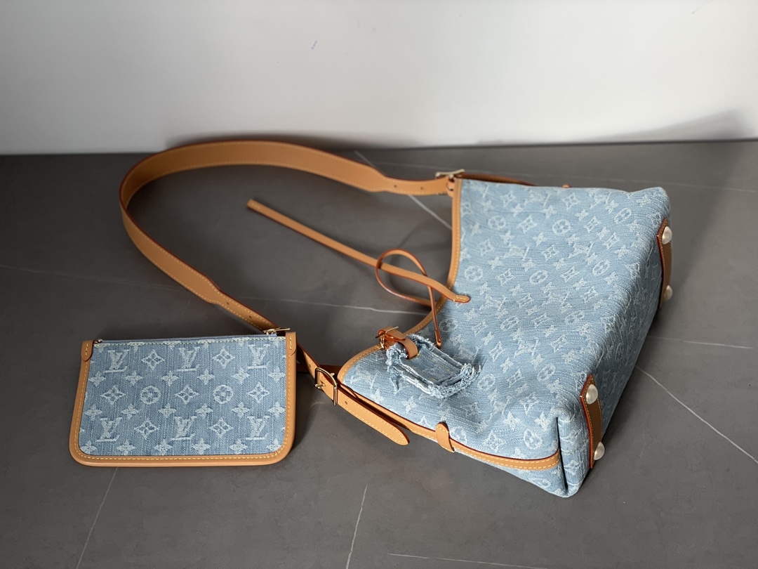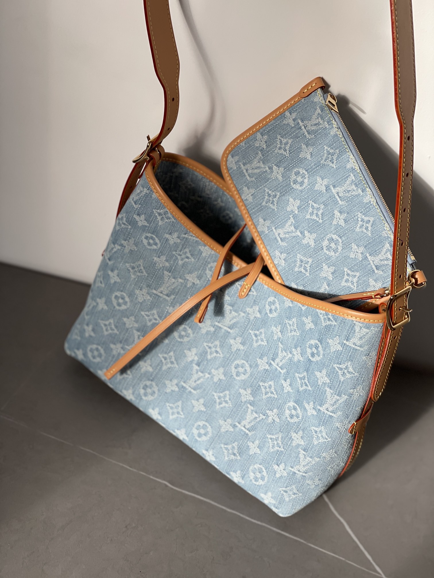 The LOUIS VUITTON Carryall SOFT TRUNK Sky Denim PM bag combines iconic Monogram denim canvas with leather accents for a fresh, stylish look. Featuring an adjustable strap and practical handle, it offers versatile carrying options from hand to shoulder or crossbody. Spacious enough for daily essentials, this chic design blends heritage elegance with modern casual appeal.