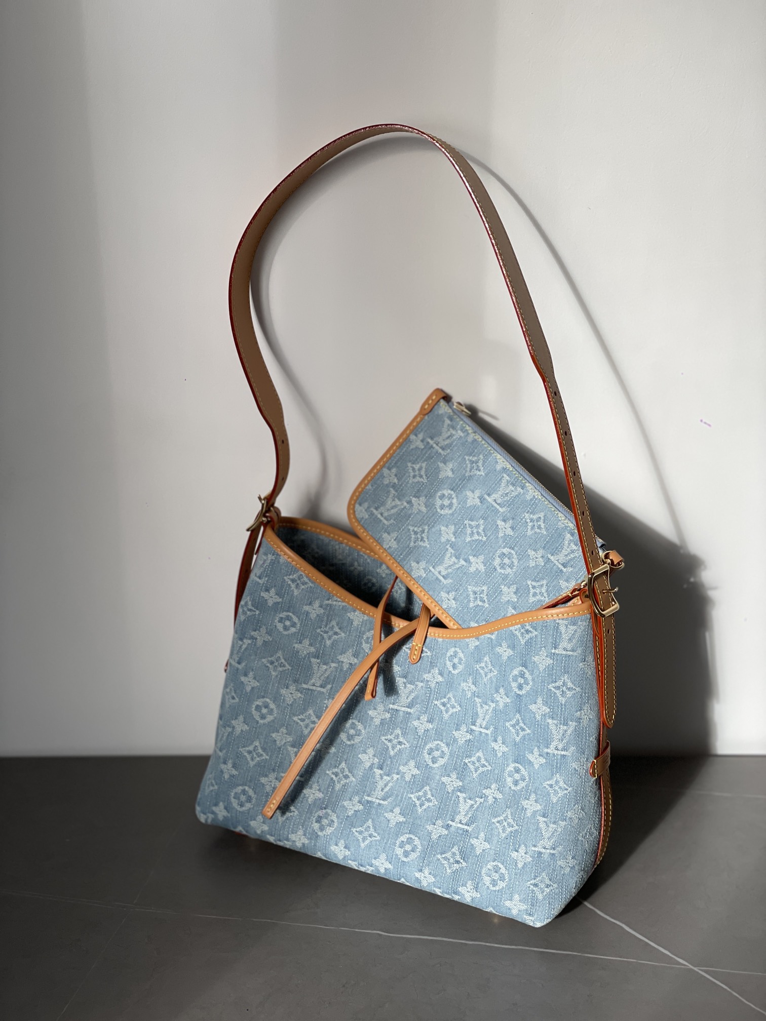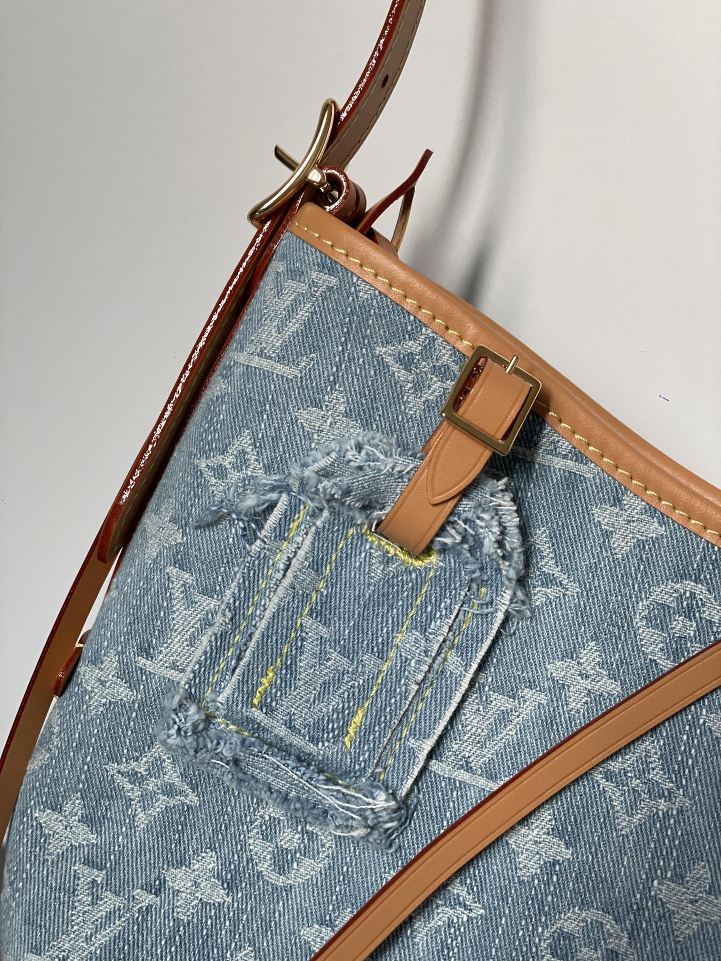 LOUIS VUITTON Carryall SOFT TRUNK Sky Denim PM with Monogram logo denim canvas and leather trim, adjustable strap, lightweight and versatile for daily use.
