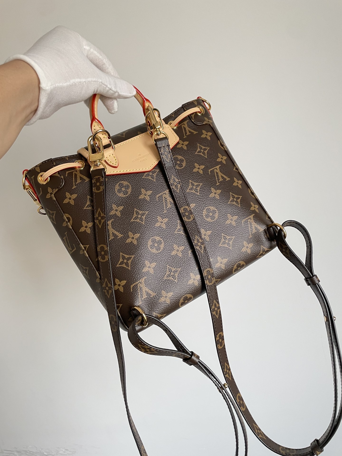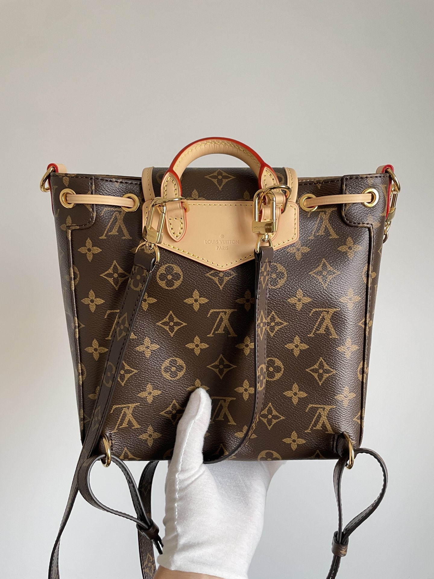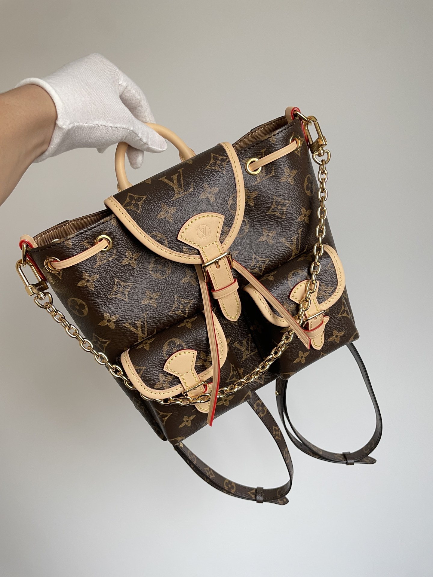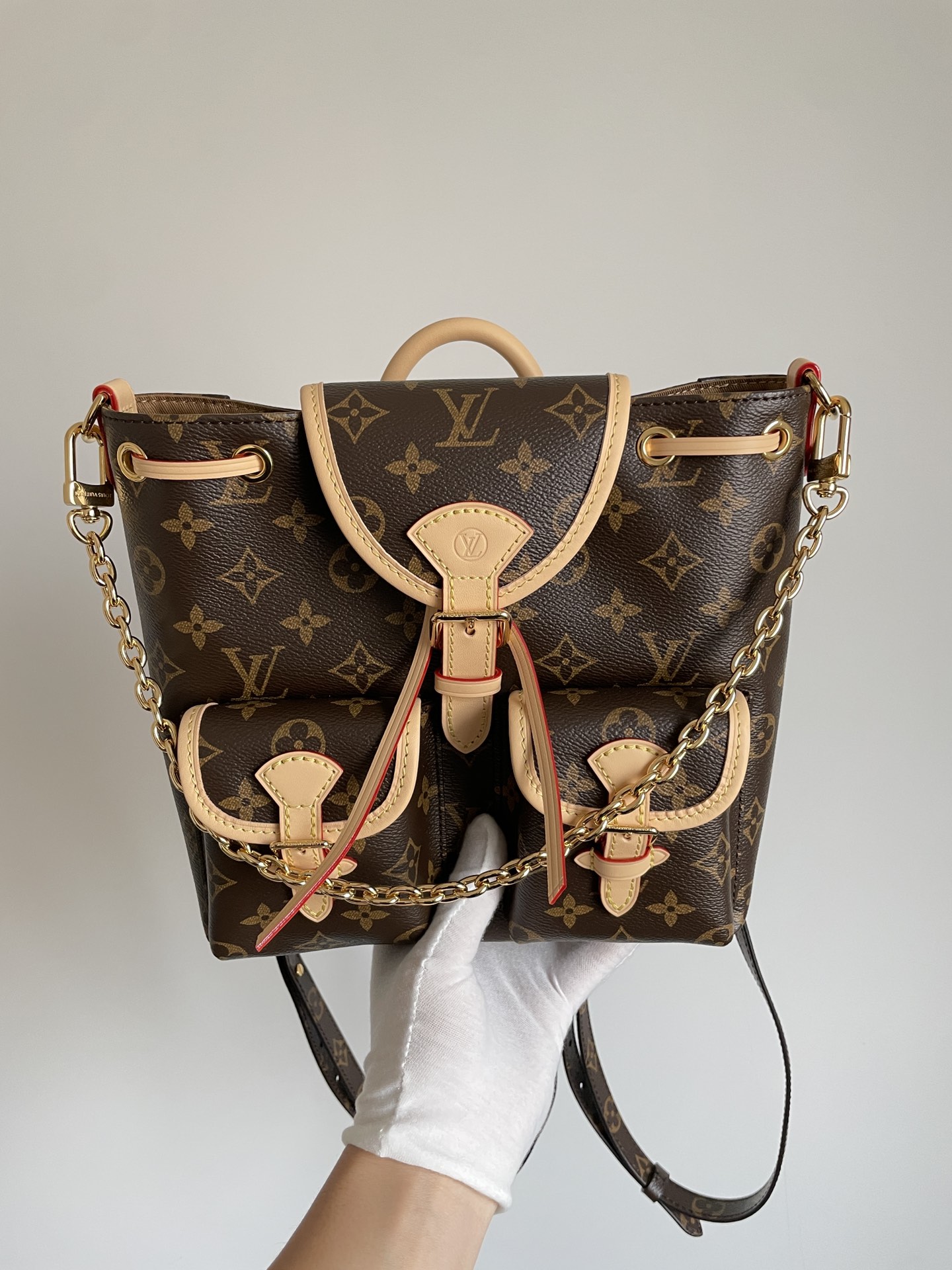 The Excursion Small (M46932) reimagines the backpack as a convertible fashion piece. Monogram coated canvas is accented with leather trim and a bold LV front detail. A secure drawstring closes the main compartment, while interior pockets keep essentials sorted.