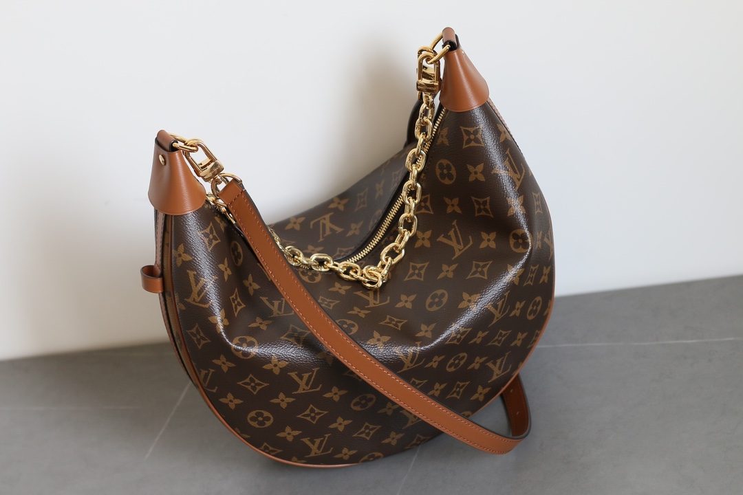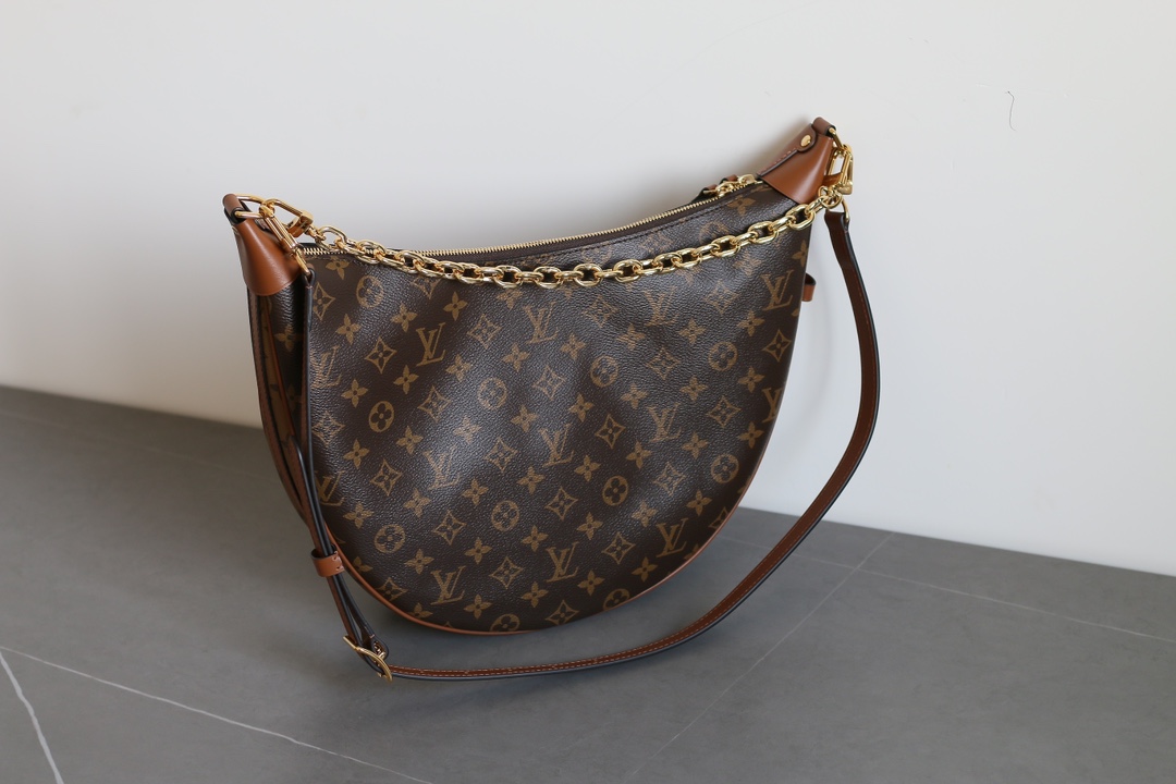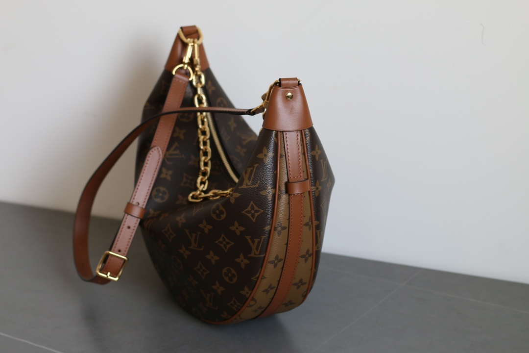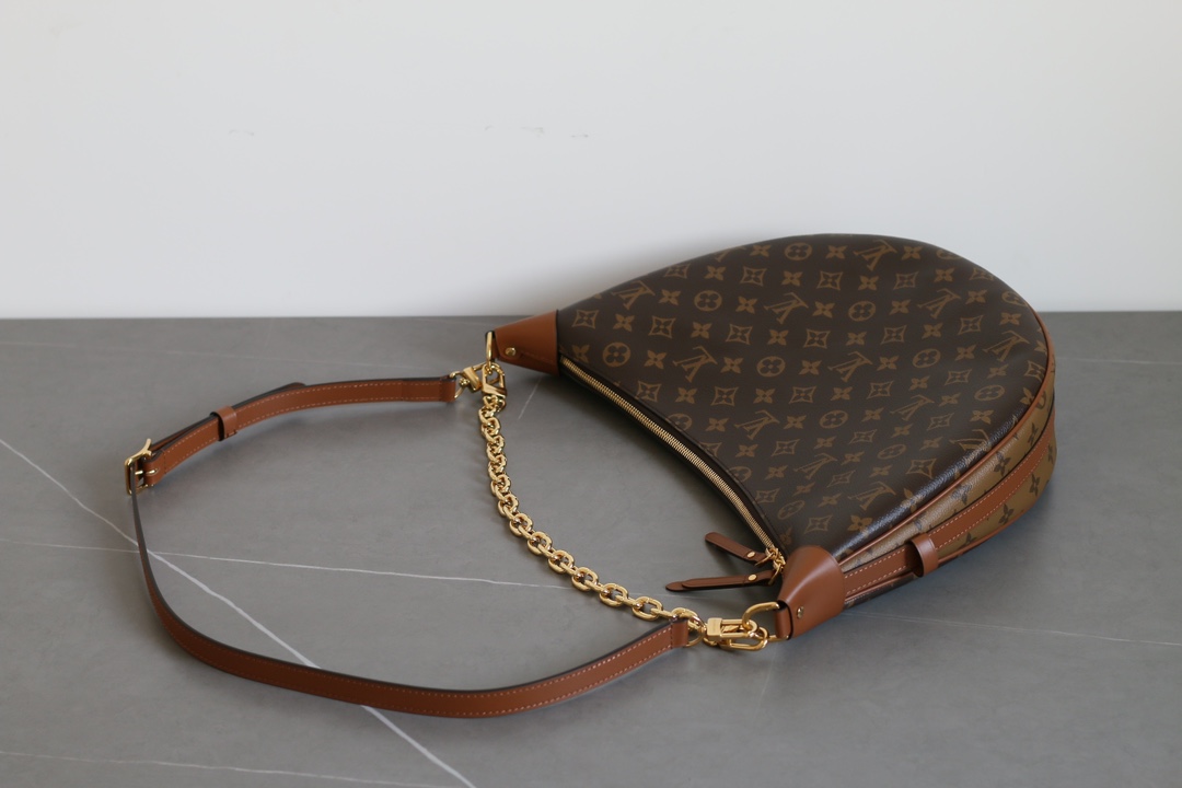 The Louis Vuitton Loop Hobo handbag combines Monogram coated canvas with Monogram Reverse coated canvas to define a trendy crescent silhouette. Finished with leather corner reinforcements, this large hobo bag offers a modern look with classic LV appeal. The double zip closure opens to a spacious interior with a removable zip pouch, while the detachable chain and adjustable leather shoulder strap allow multiple carry options.