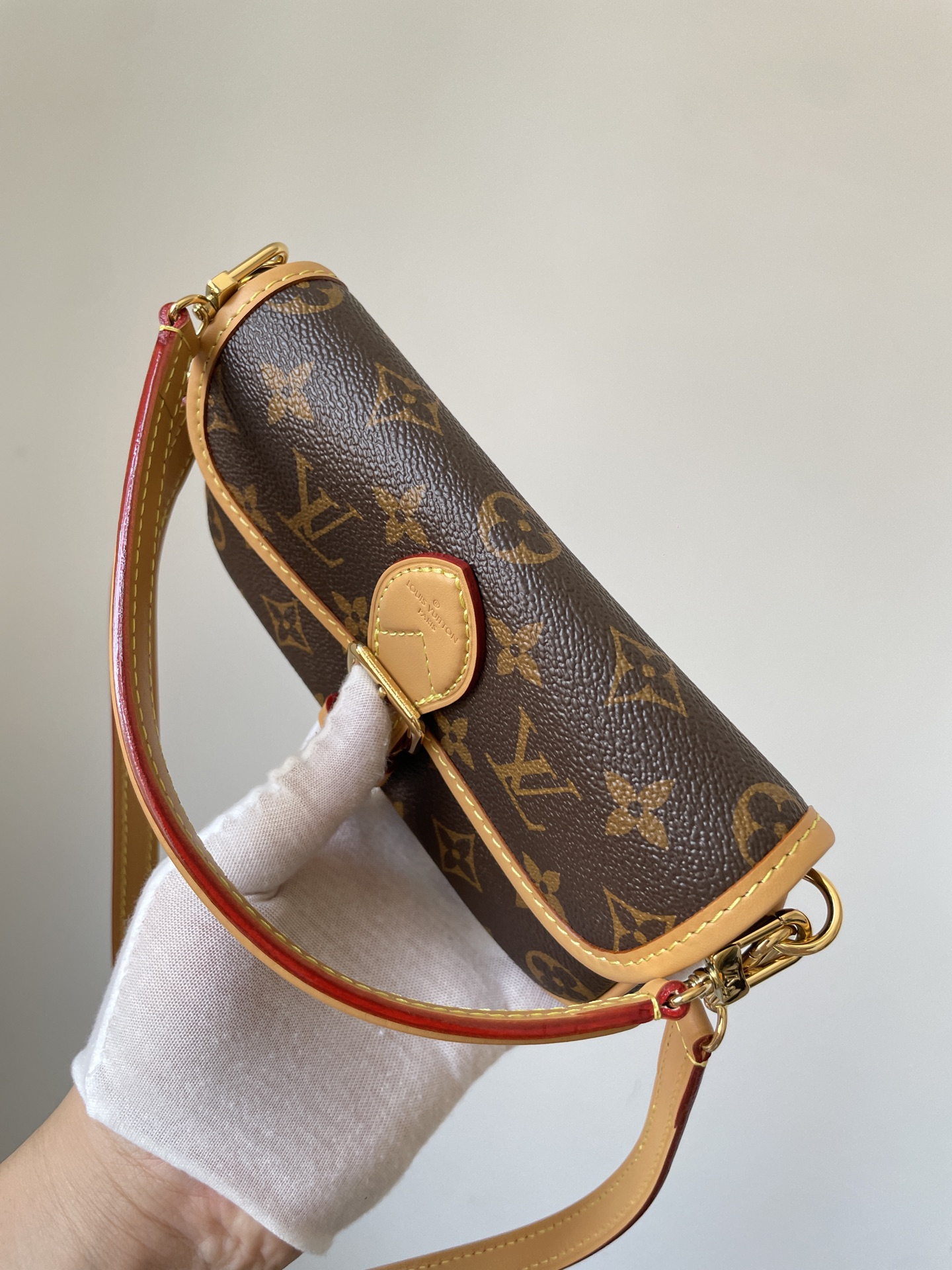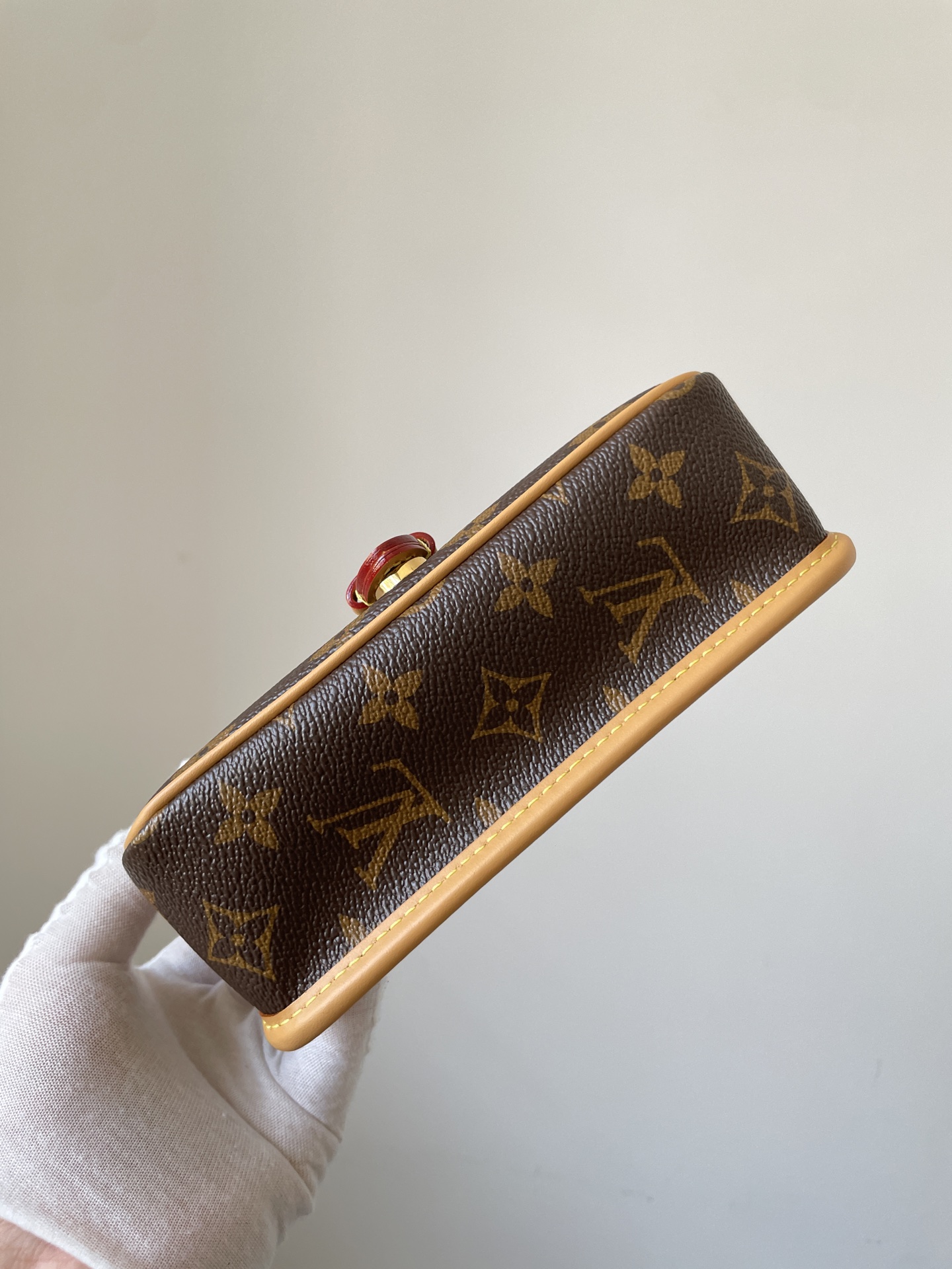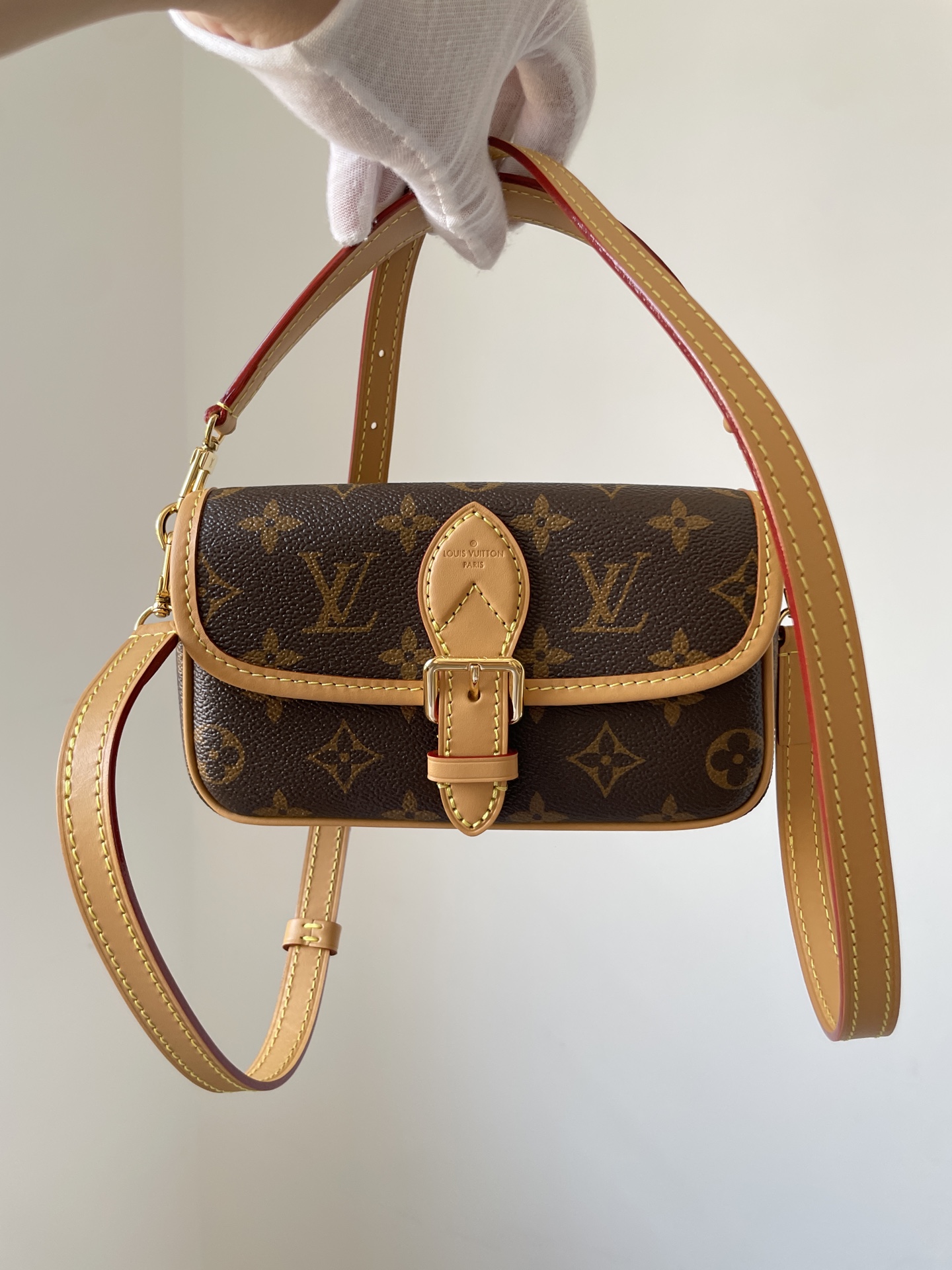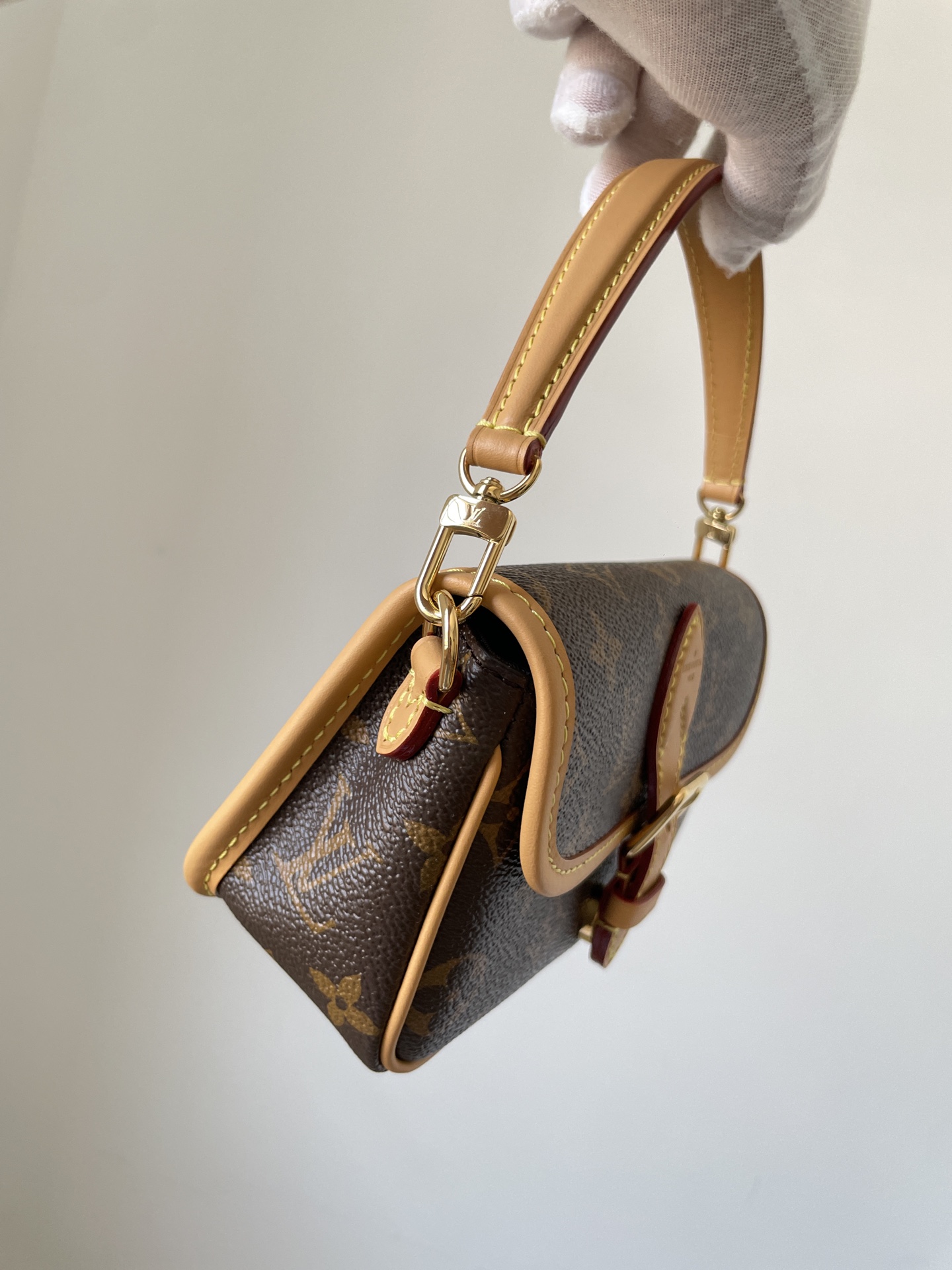 Nano Diane baguette in Monogram canvas with rounded flap, belt-style magnetic closure, detachable handle, and adjustable strap.