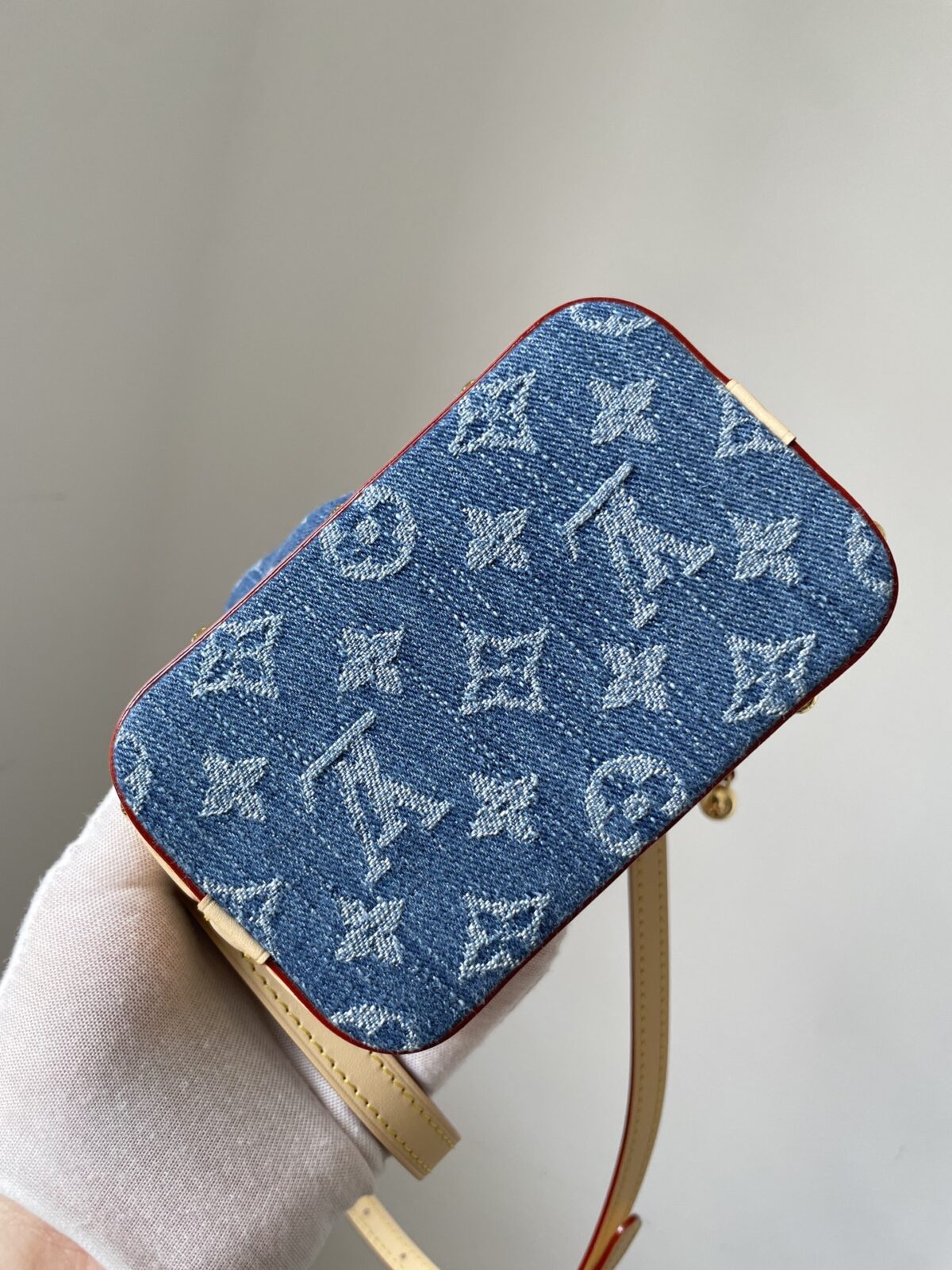 The Louis Vuitton Nano Noé denim edition features Monogram print on blue textile. Detailed with leather trim and a decorative chain, it includes drawstring closure and detachable strap. Measuring 17.5 x 8.8 x 20.5 cm, it fits phone, wallet, and keys.