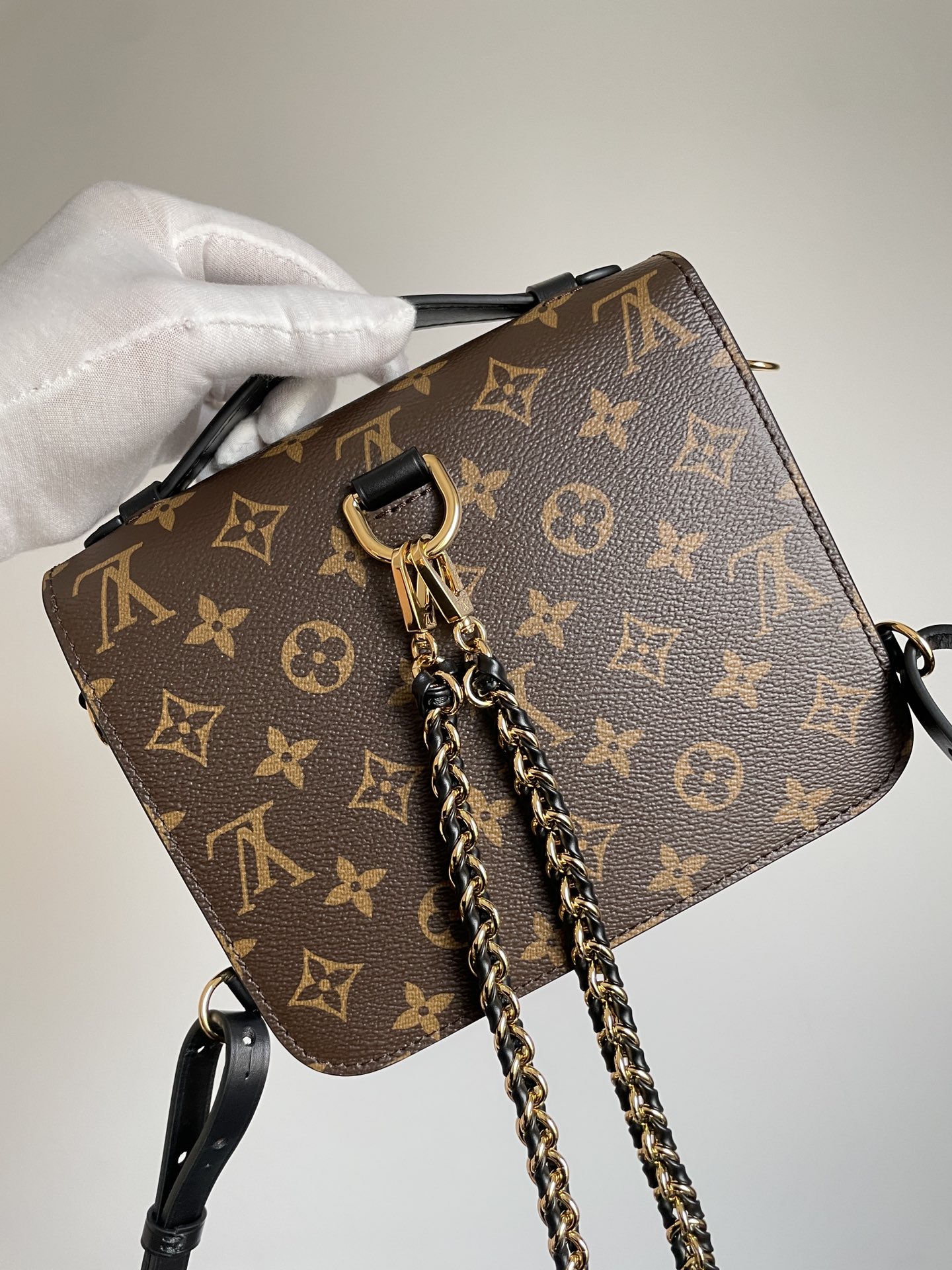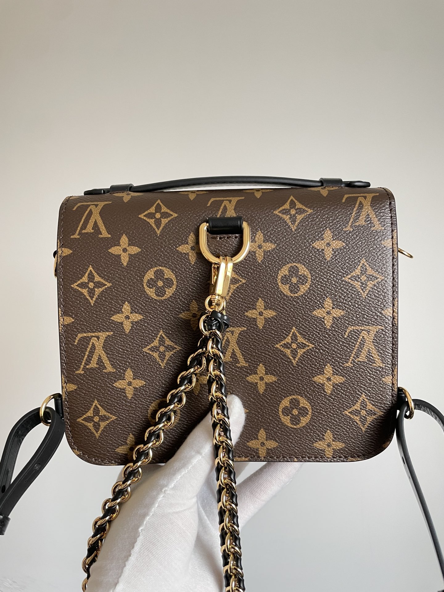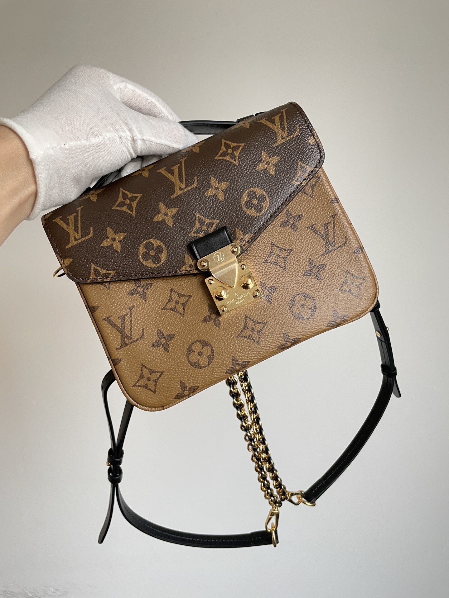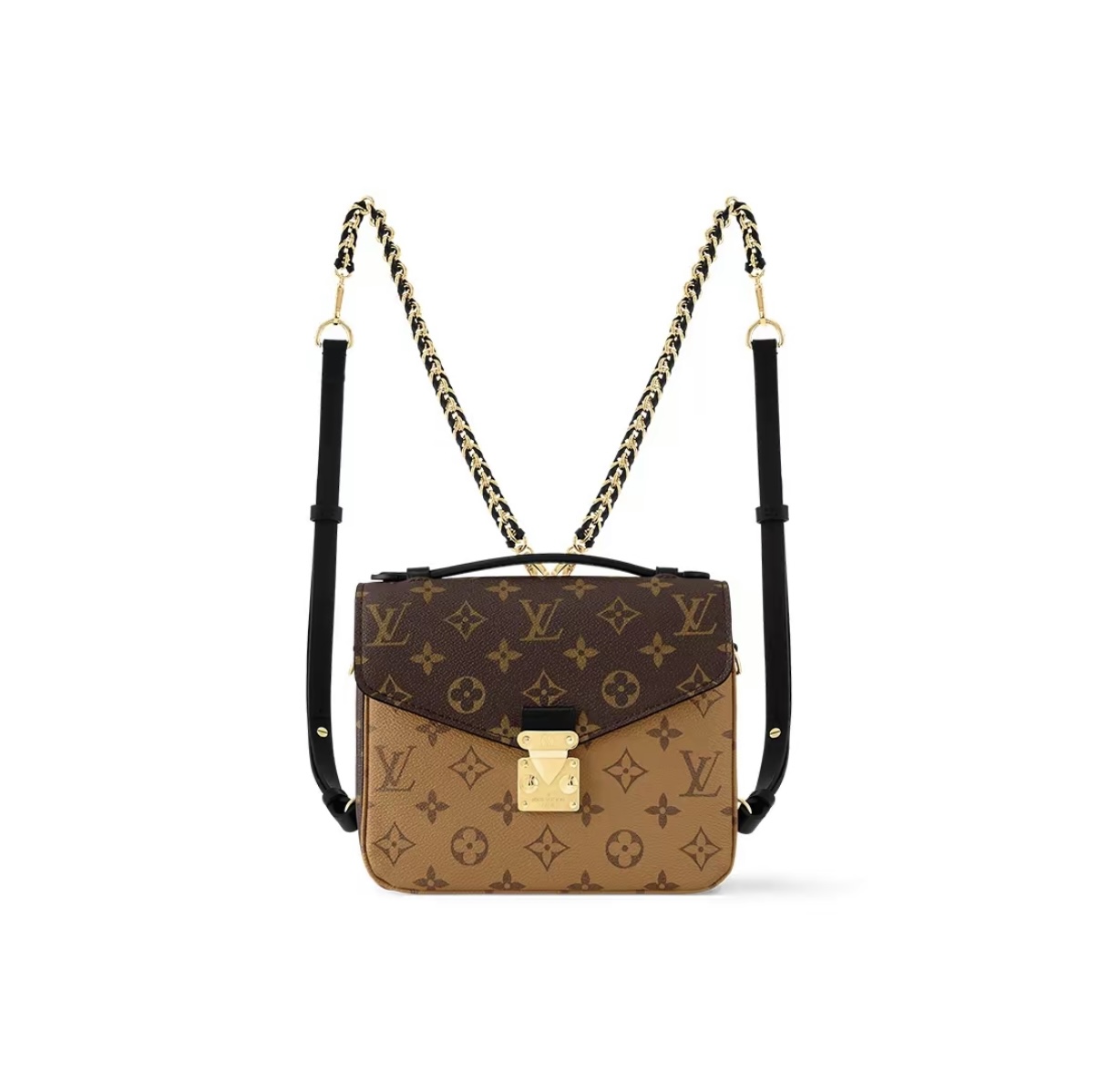 Pochette Métis backpack in Monogram + Monogram Reverse canvas with polished S-lock, detachable woven chain and adjustable strap.