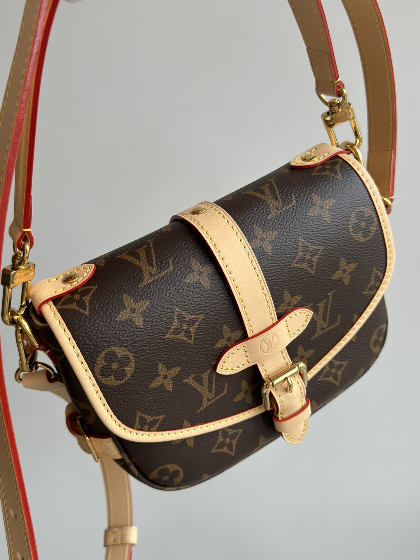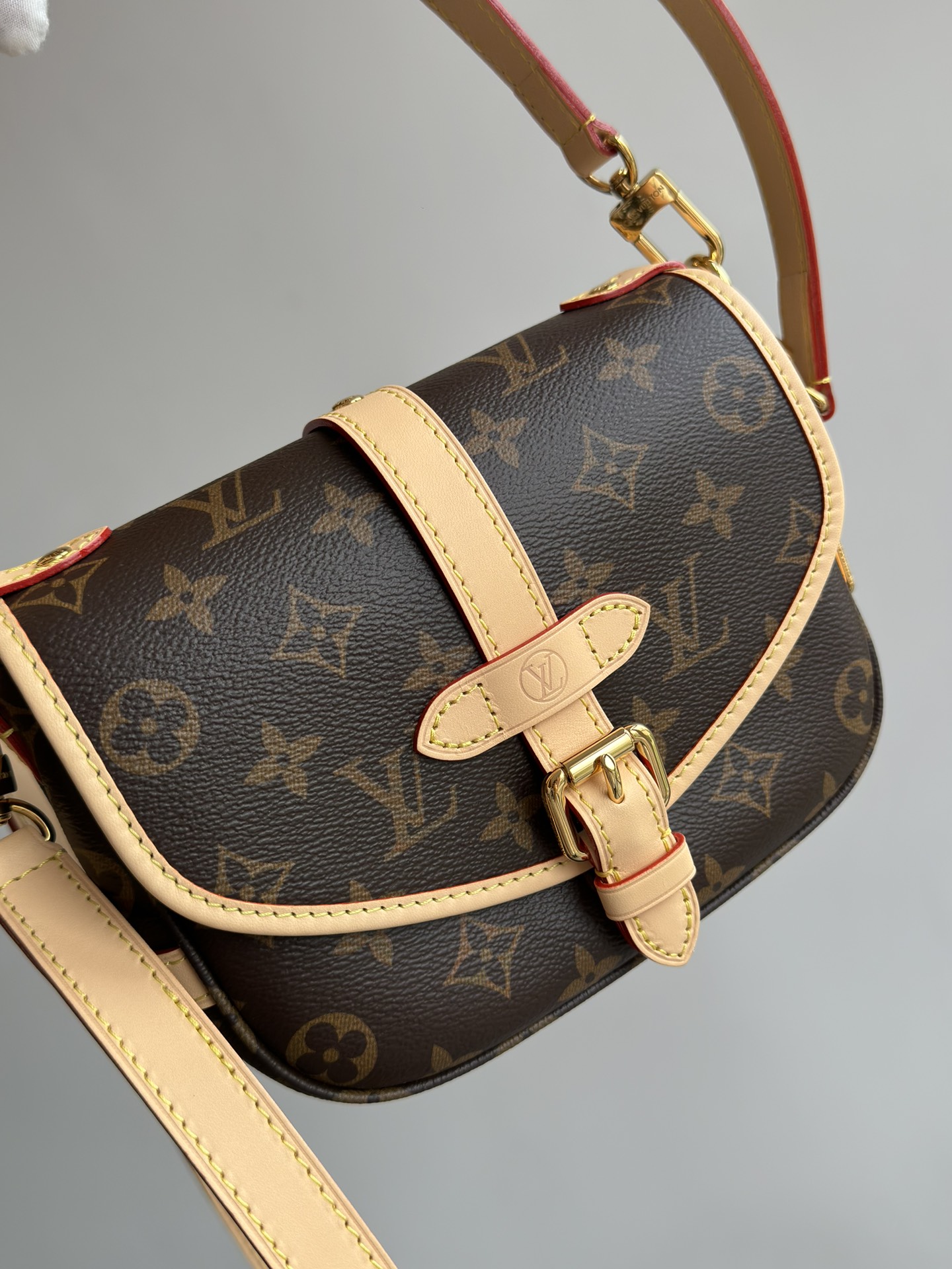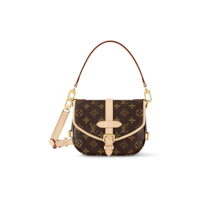 The Louis Vuitton Saumur BB is crafted from Monogram coated canvas with cowhide-leather trim, reviving a classic saddle design. A discreet magnetic closure ensures effortless access, while a detachable strap and removable handle provide versatile styling.