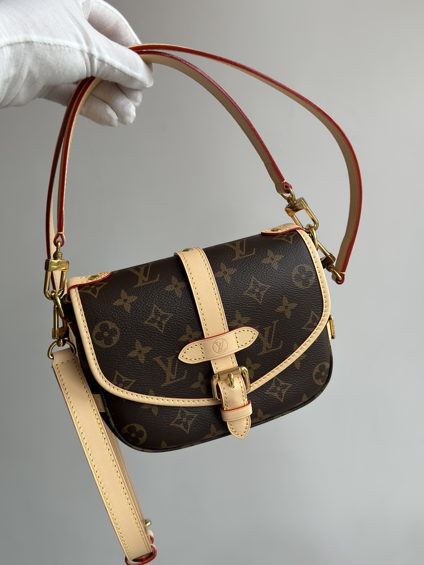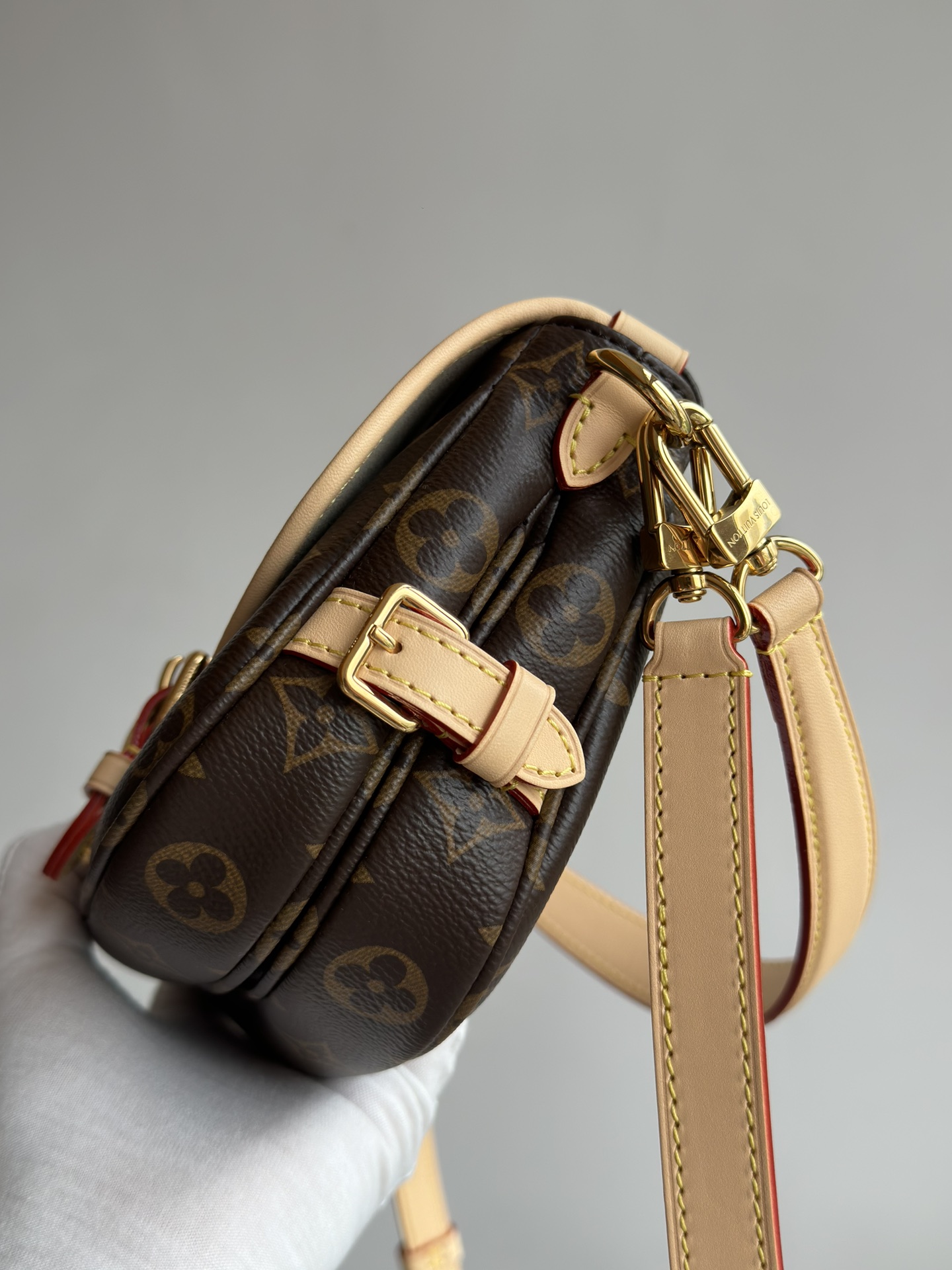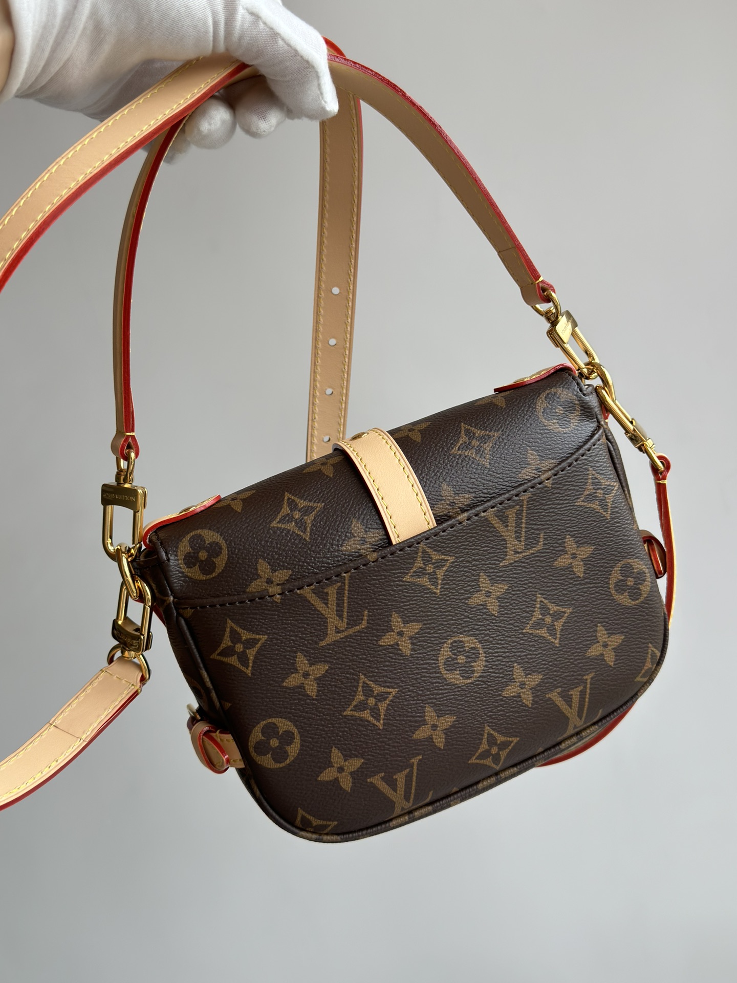 The Louis Vuitton Saumur BB is crafted from Monogram coated canvas with cowhide-leather trim, reviving a classic saddle design. A discreet magnetic closure ensures effortless access, while a detachable strap and removable handle provide versatile styling.