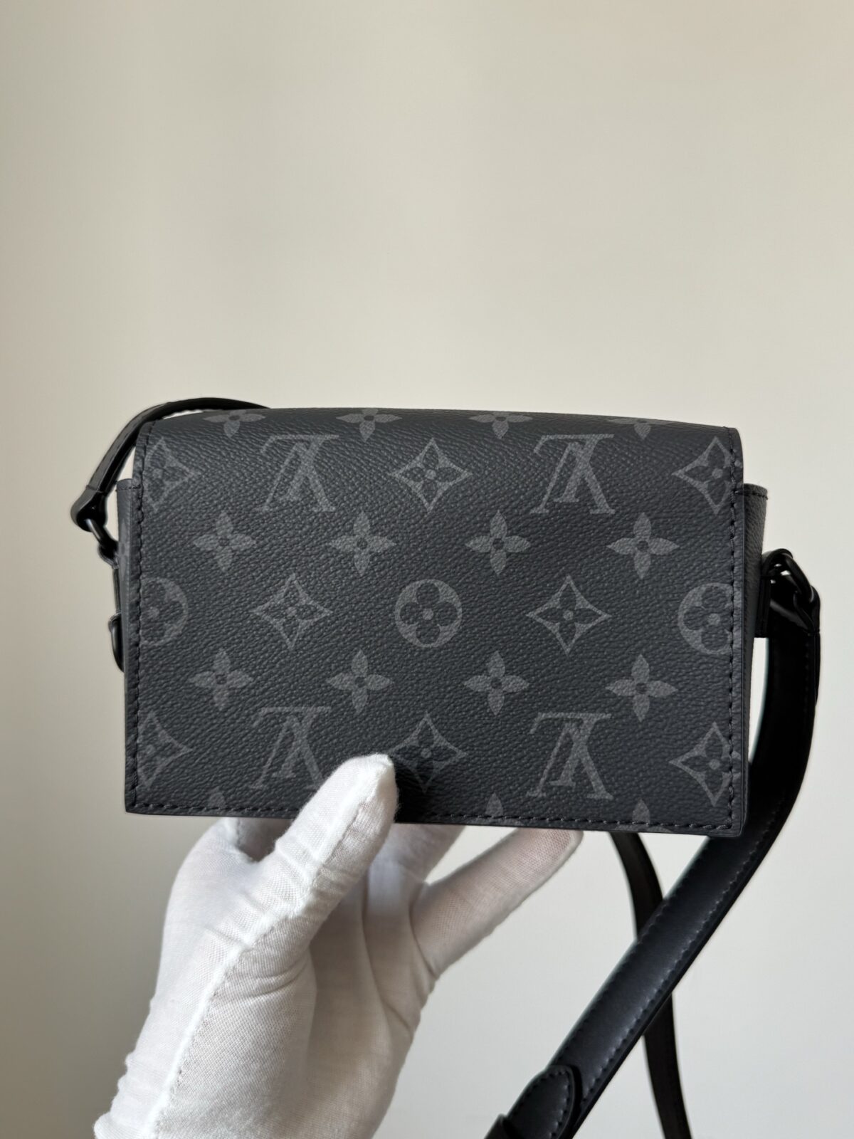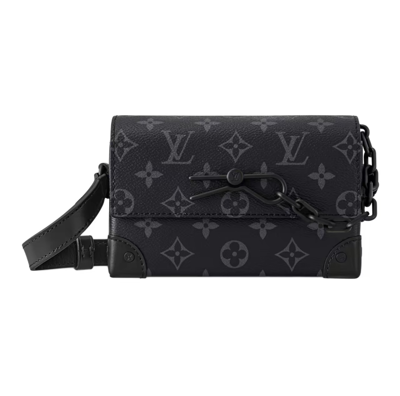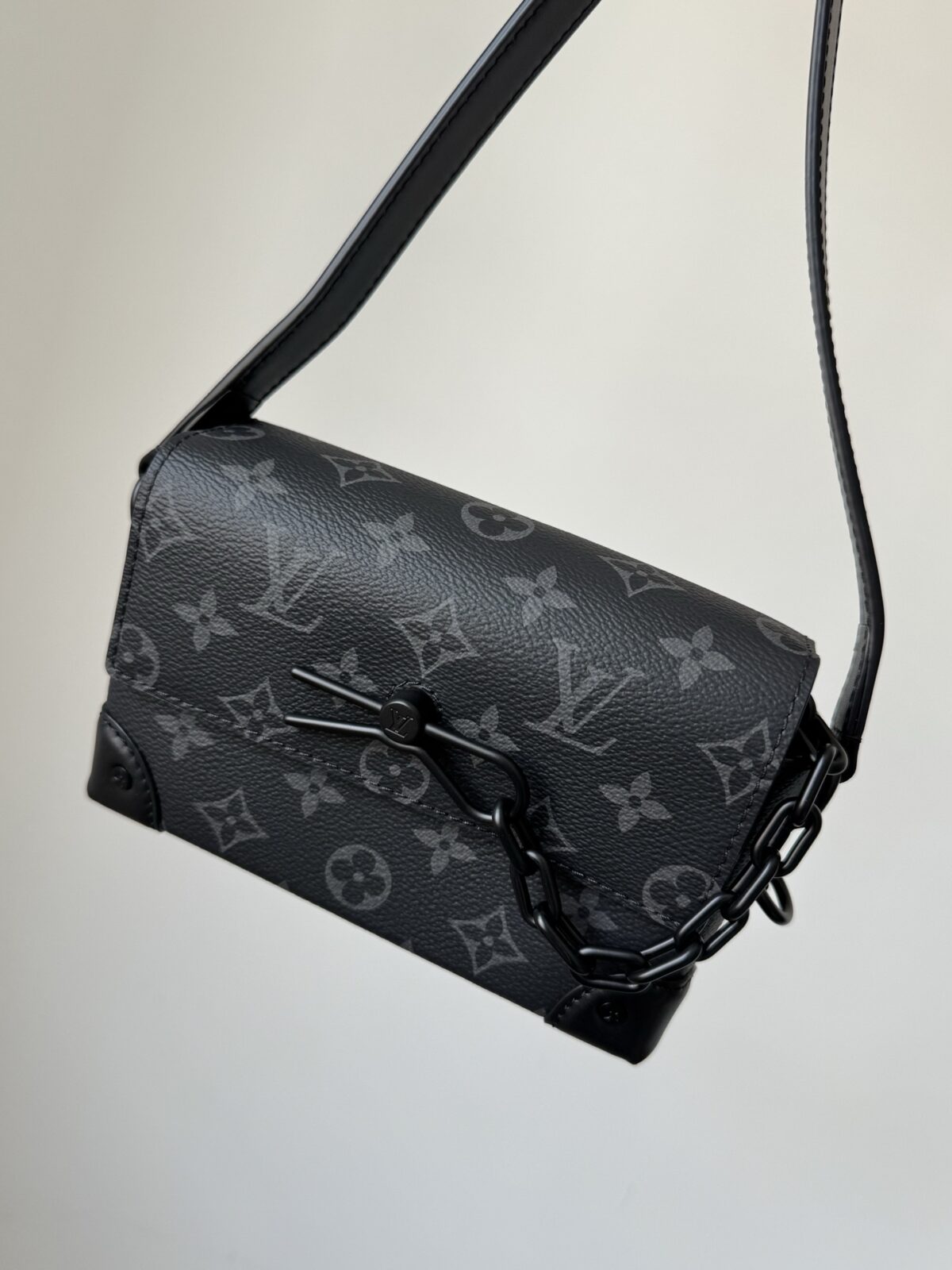 The Louis Vuitton Steamer Mini bag is crafted from Monogram Eclipse coated canvas with cowhide-leather trim, inspired by the brand’s iconic steamer trunks. Chain and pin details recall vintage trunks while delivering a bold, modern touch. Compact yet practical, it features a secure flap closure, interior zip pocket, and an adjustable shoulder strap for versatile carrying.