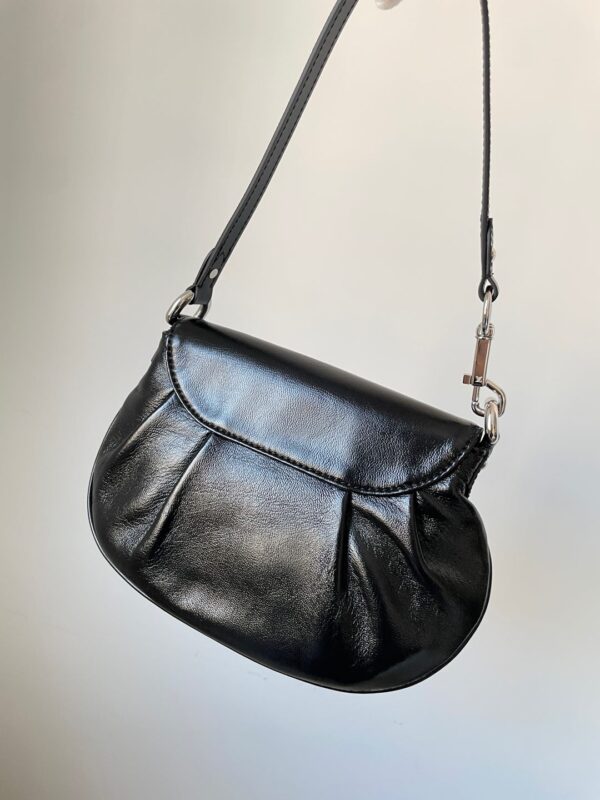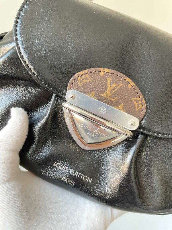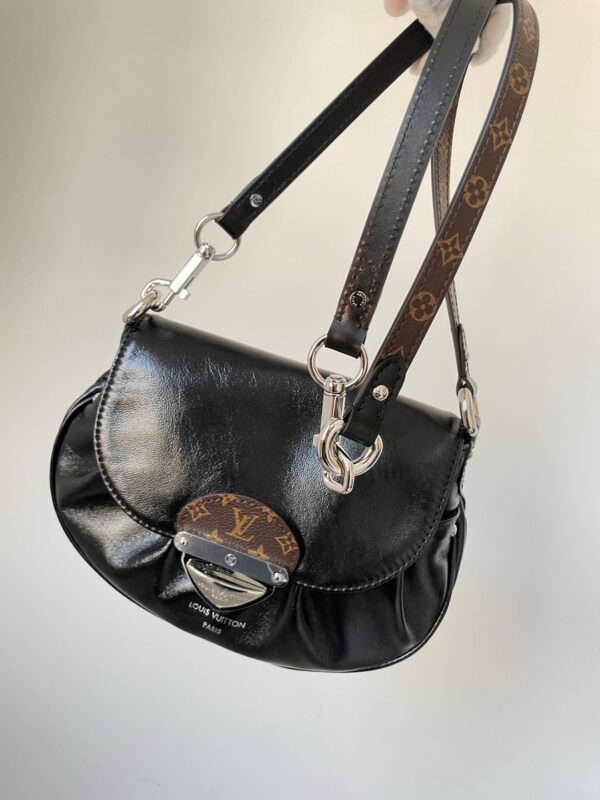 The Sunset Vibe (M12192) showcases glossy lambskin with subtle Monogram accents, sculpted into a refined yuanbao-inspired silhouette. A shining LV clasp anchors the front, while slip pockets inside and out keep small items tidy.