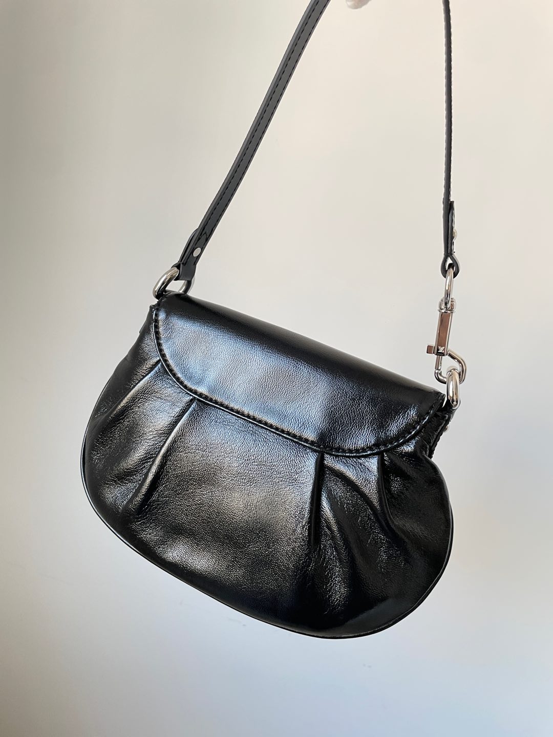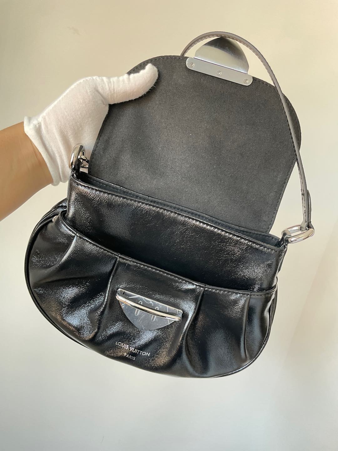 Sunset Vibe bag in glossy lambskin with pleated silhouette, LV clasp, front and interior slip pockets, detachable/adjustable strap.