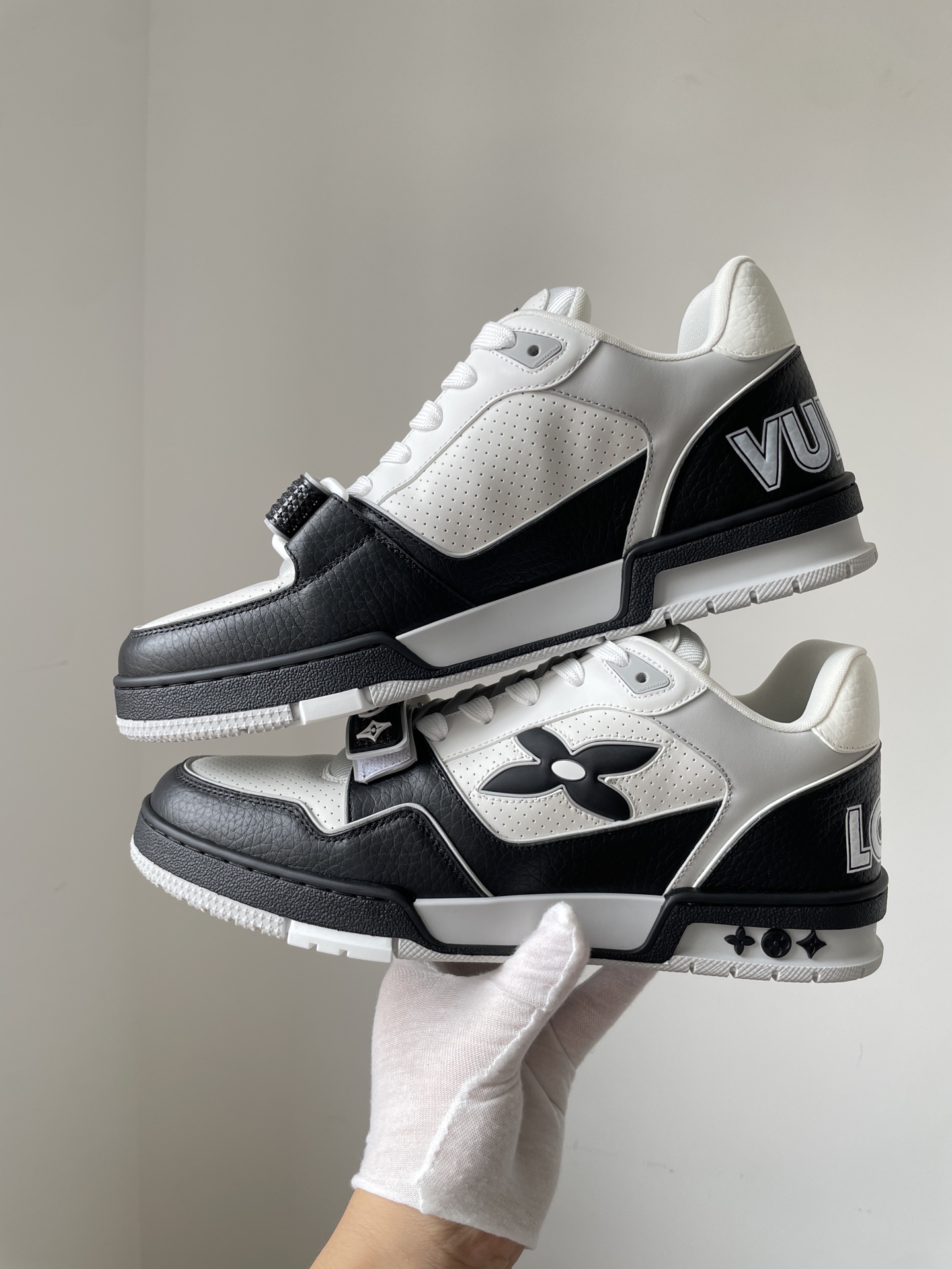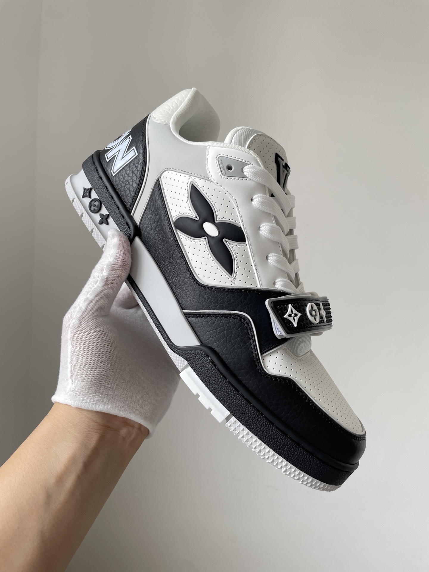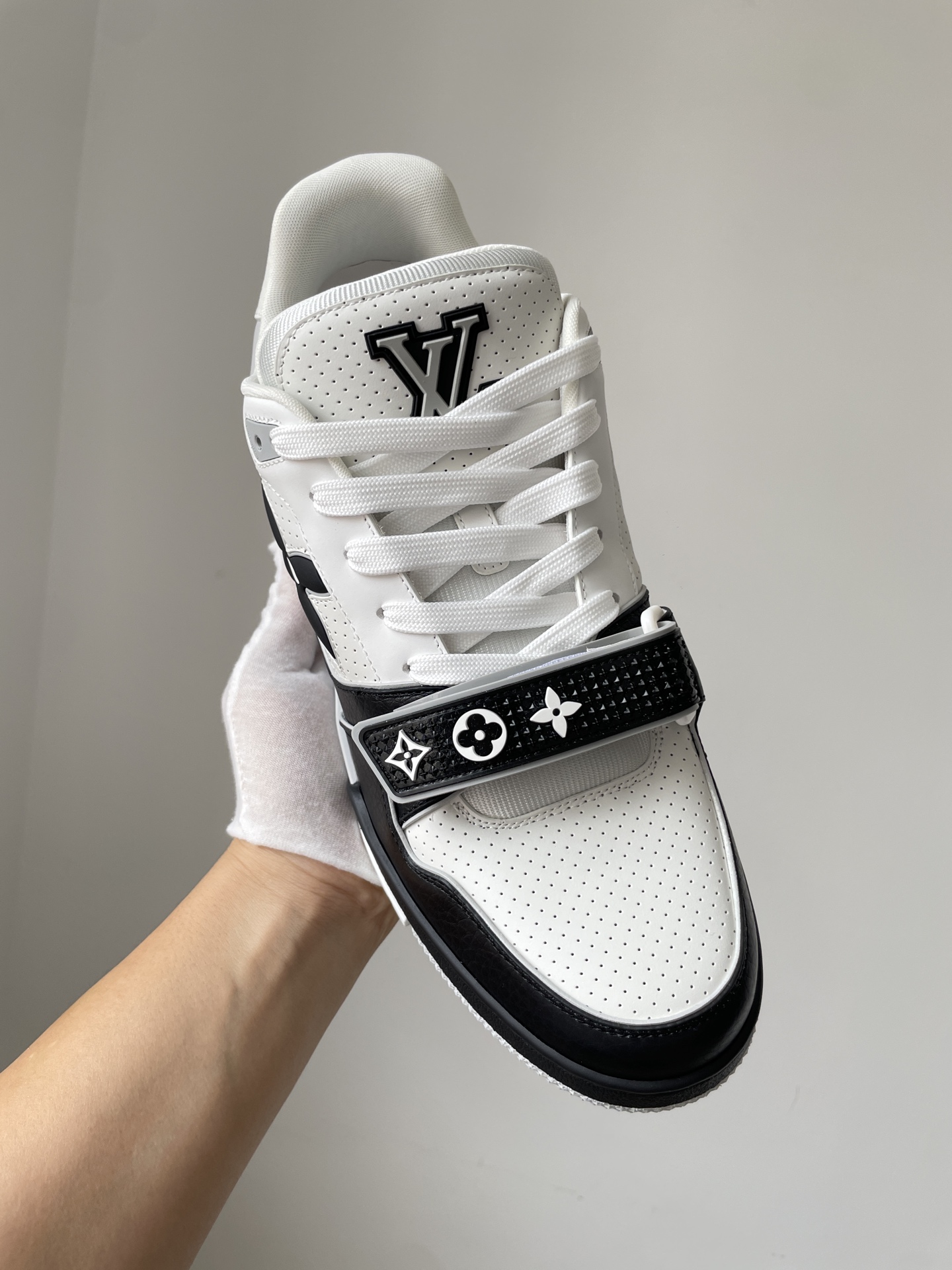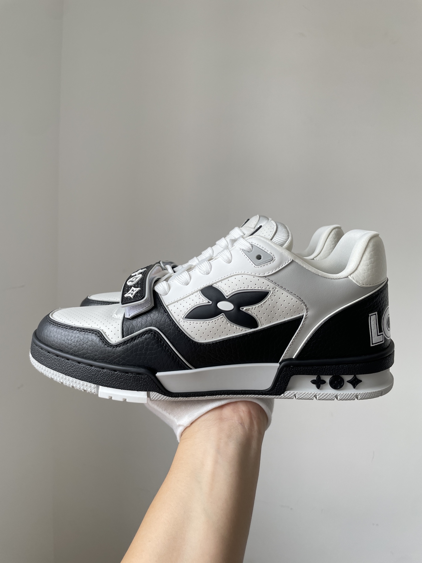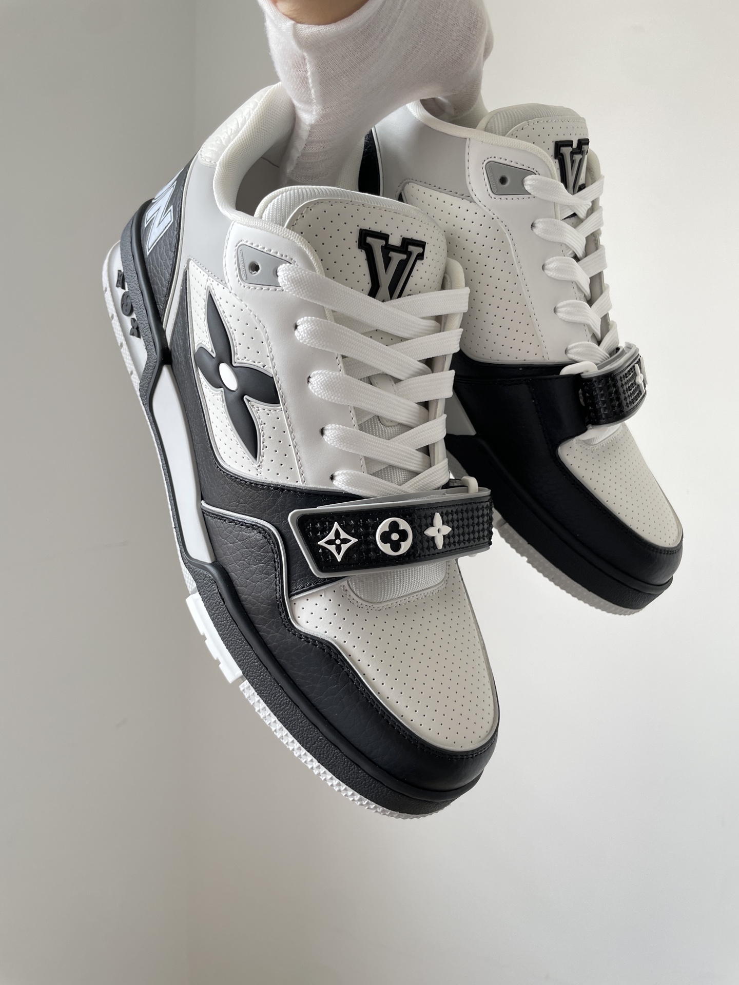 Stylish Louis Vuitton Trainer Black Leather Low-Top Sneakers with Laces and Velcro Strap made with premium materials for comfort and elegance.