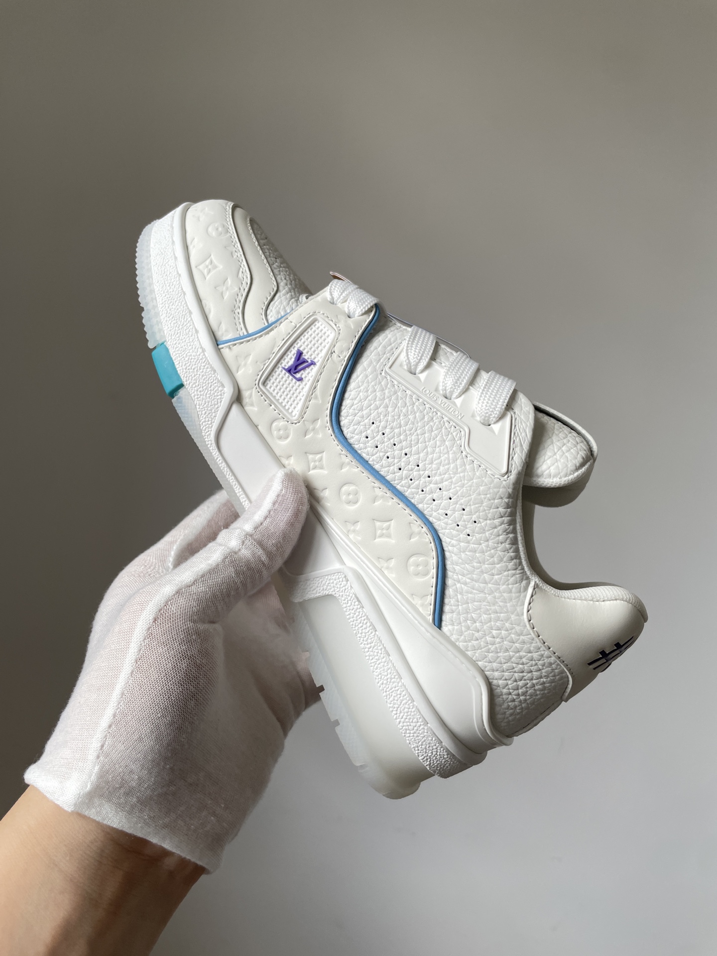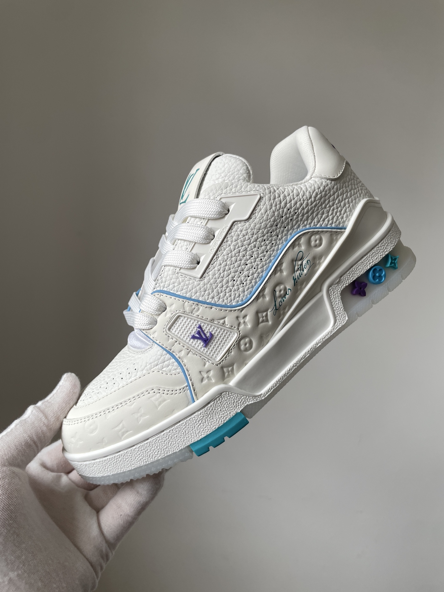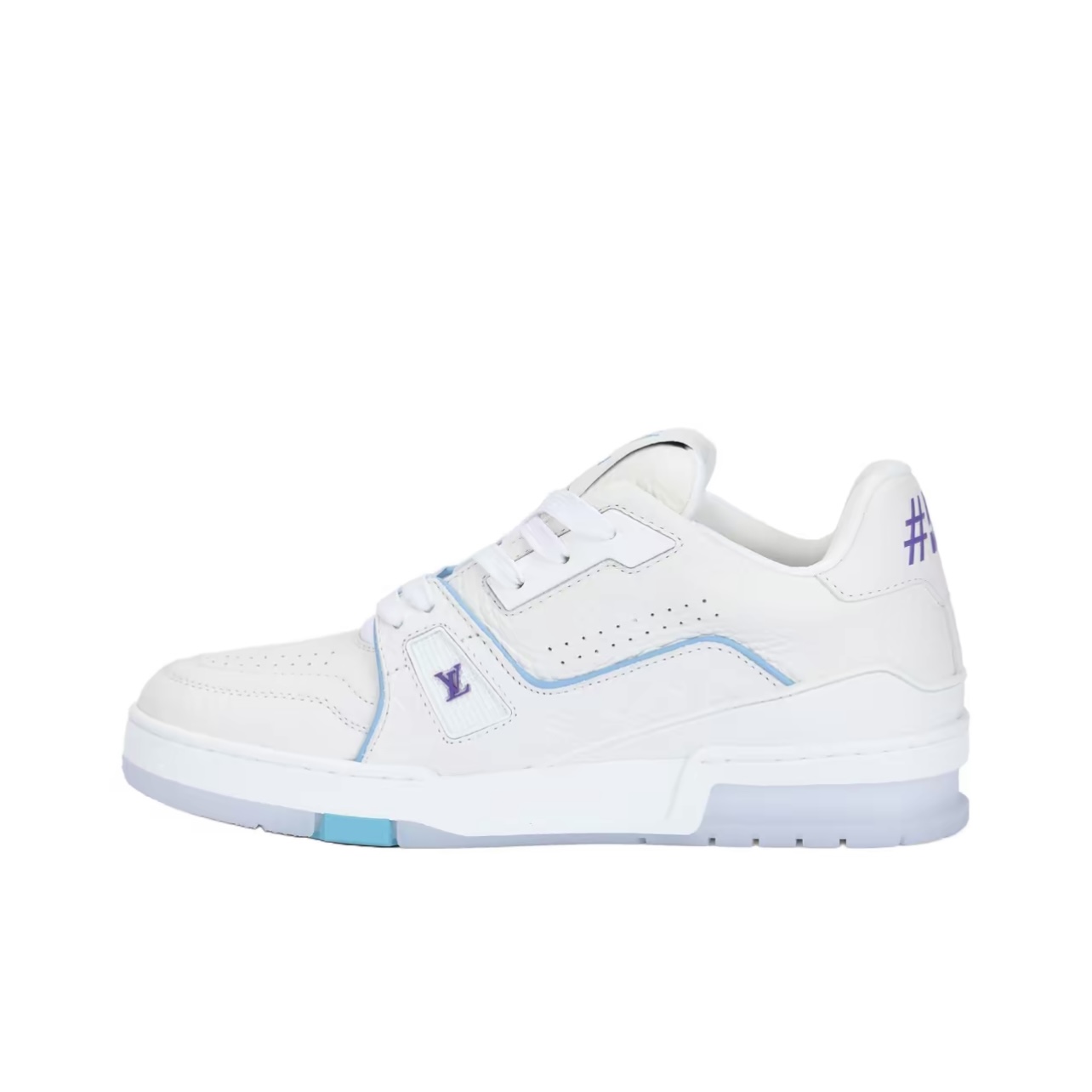 The Louis Vuitton Trainer White Blue Purple Leather Low-Top Sneakers Shanghai Cruise Limited Edition showcases Louis Vuitton’s master craftsmanship and timeless design. Made from high-quality leather and modern materials, it offers durability, comfort, and a refined aesthetic suitable for both casual and fashionable wear.