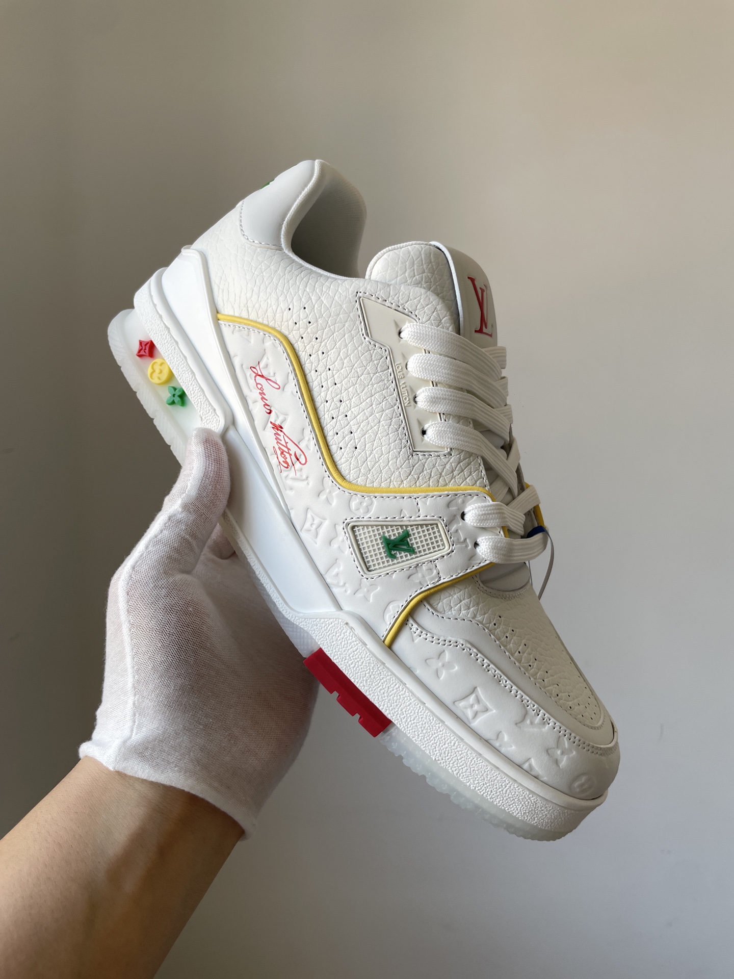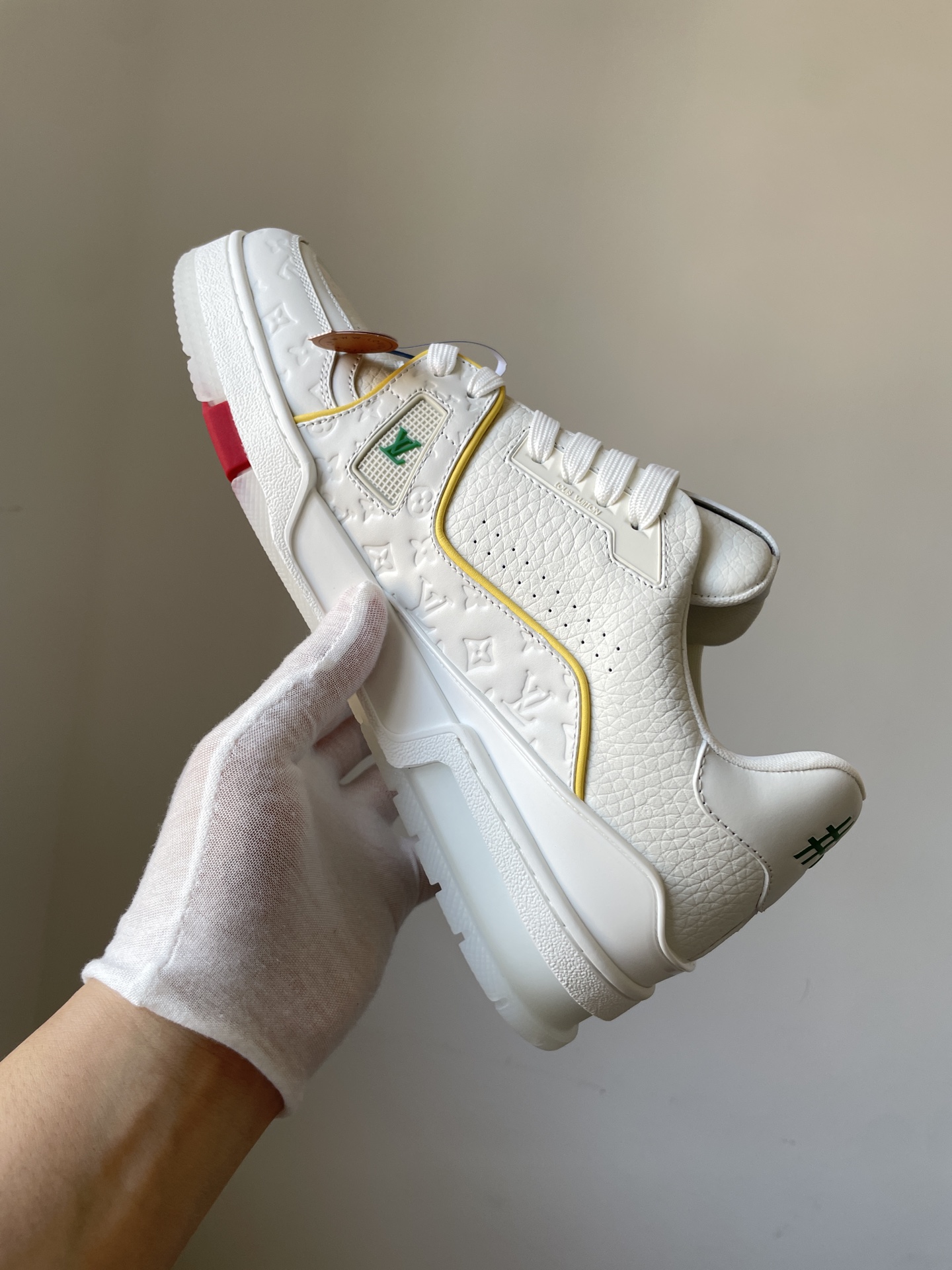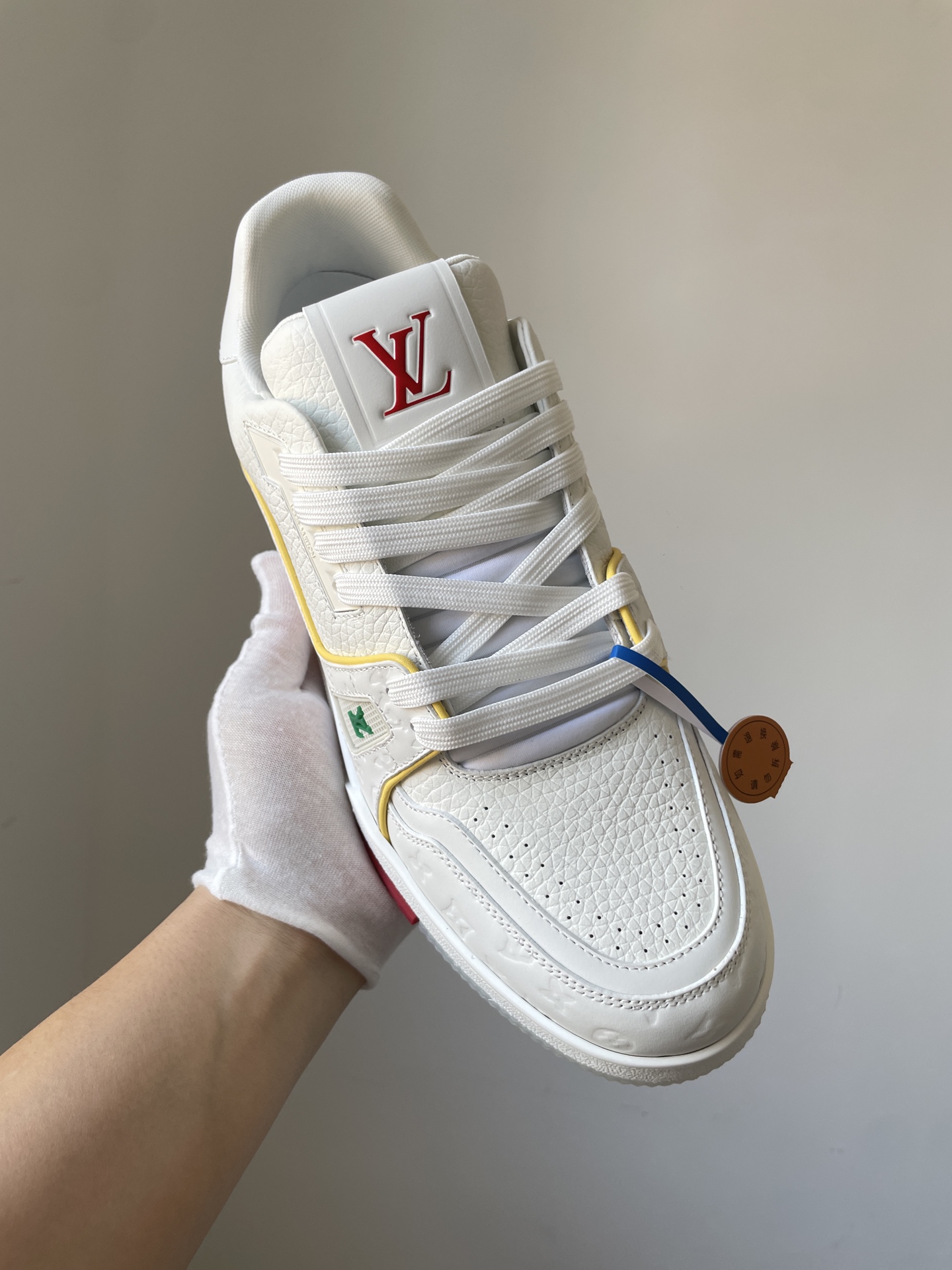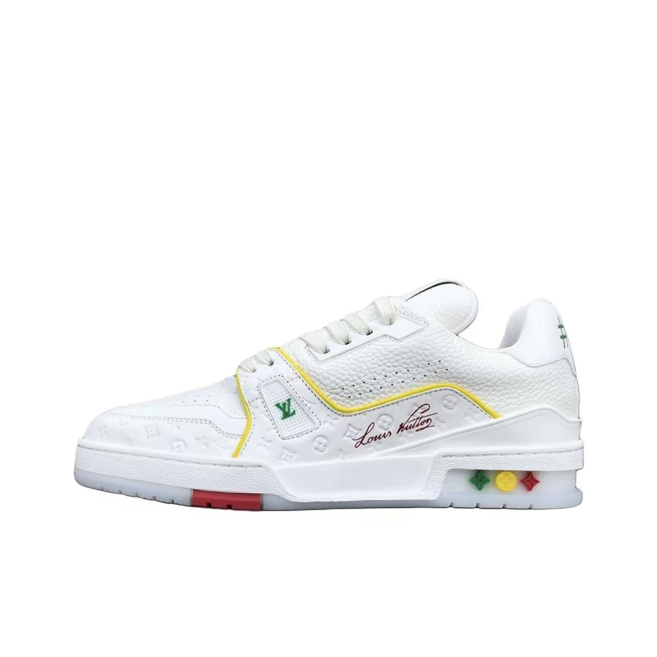 The Louis Vuitton Trainer White Yellow Blue Leather Low-Top Sneakers Shanghai Cruise Edition showcases Louis Vuitton’s master craftsmanship and timeless design. Made from high-quality leather and modern materials, it offers durability, comfort, and a refined aesthetic suitable for both casual and fashionable wear.