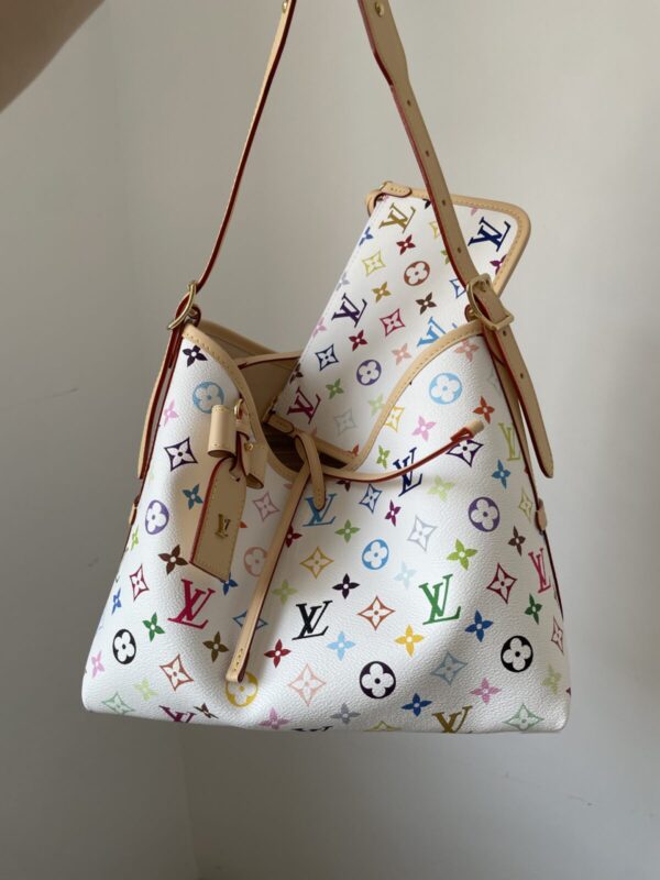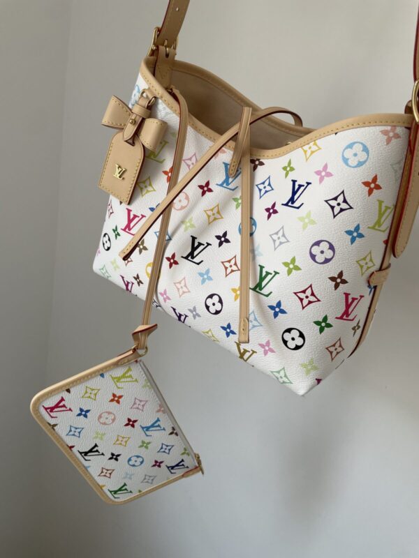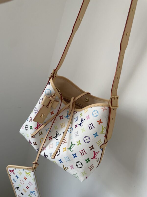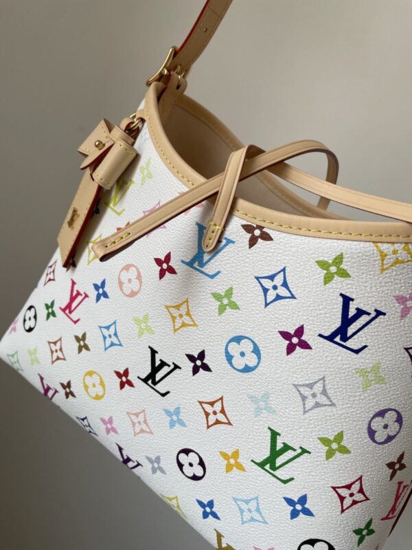 From the Louis Vuitton × Takashi Murakami re-edition, the CarryAll Small (M13661) pairs White Multicolor Monogram coated canvas with refined cowhide trim. A bow-like drawstring and detachable LV name tag elevate the compact, softly-structured silhouette.