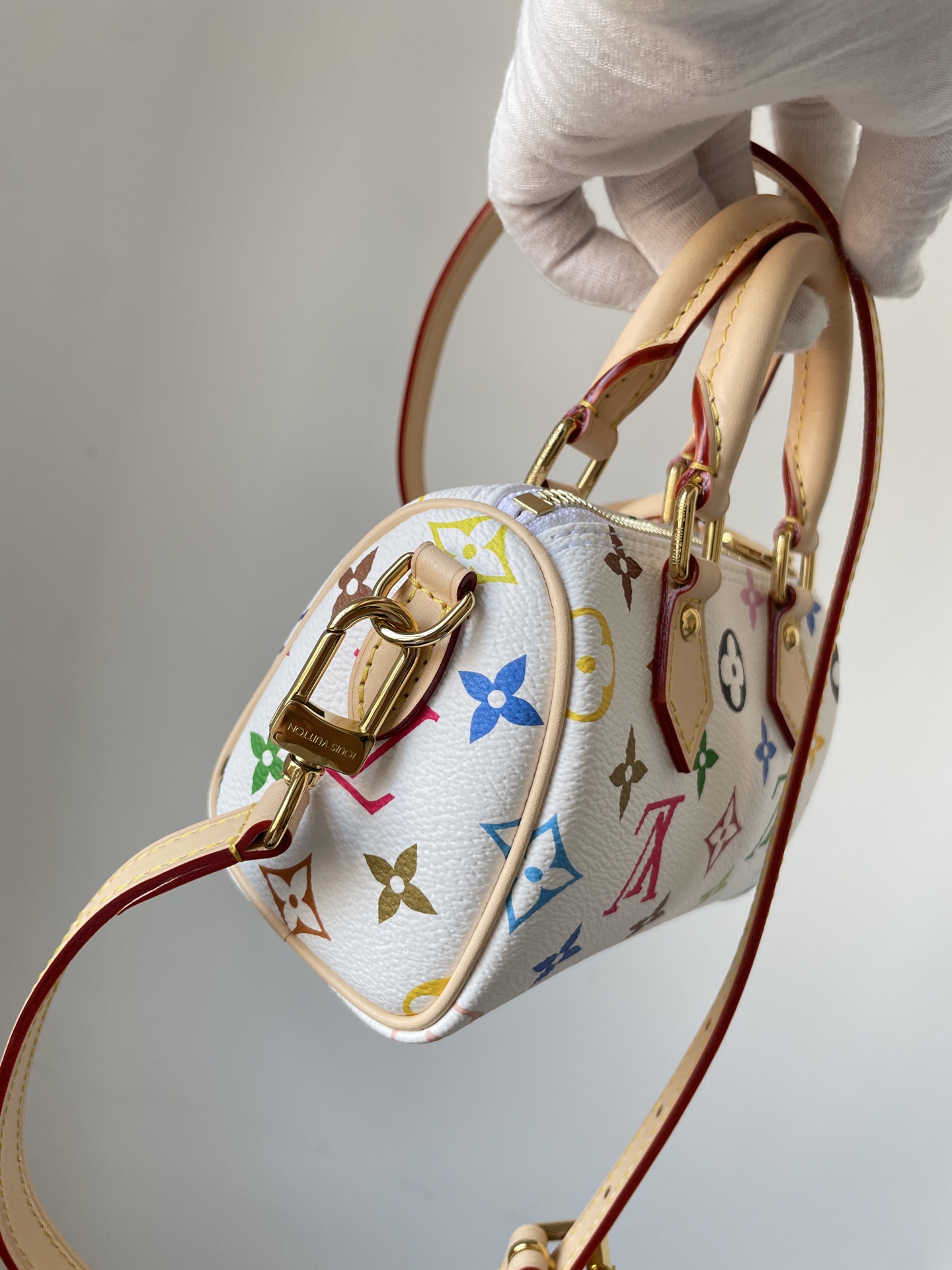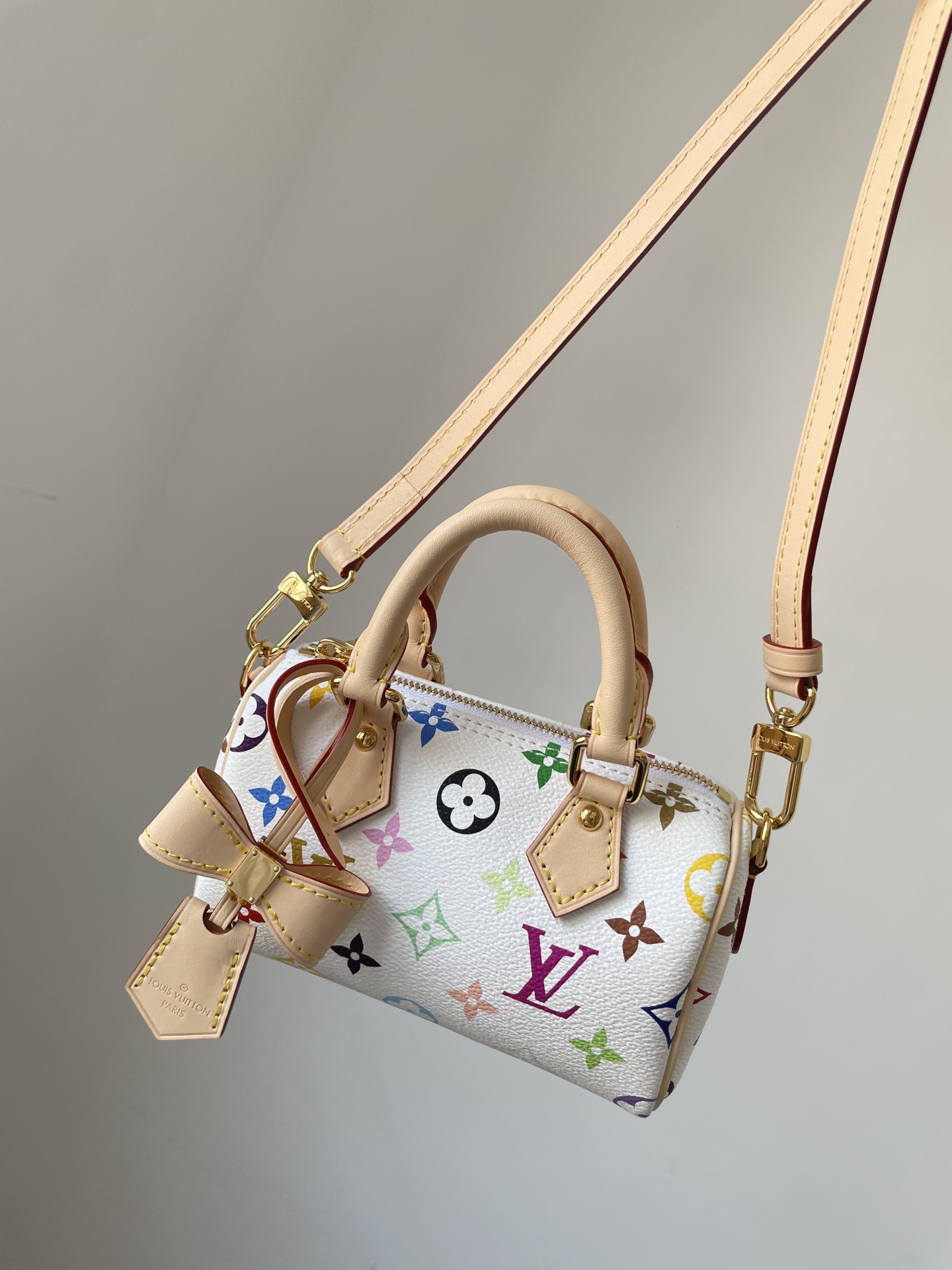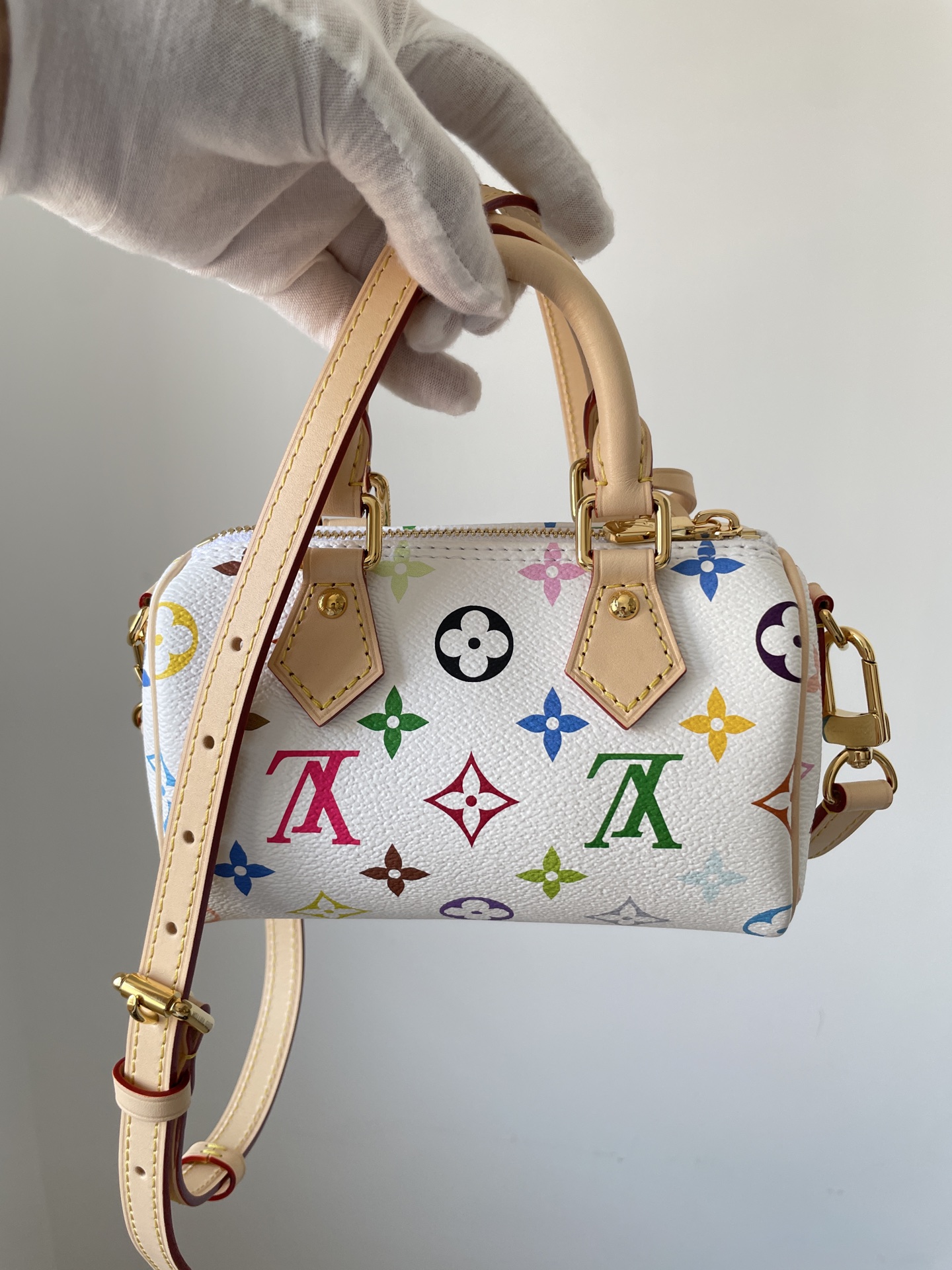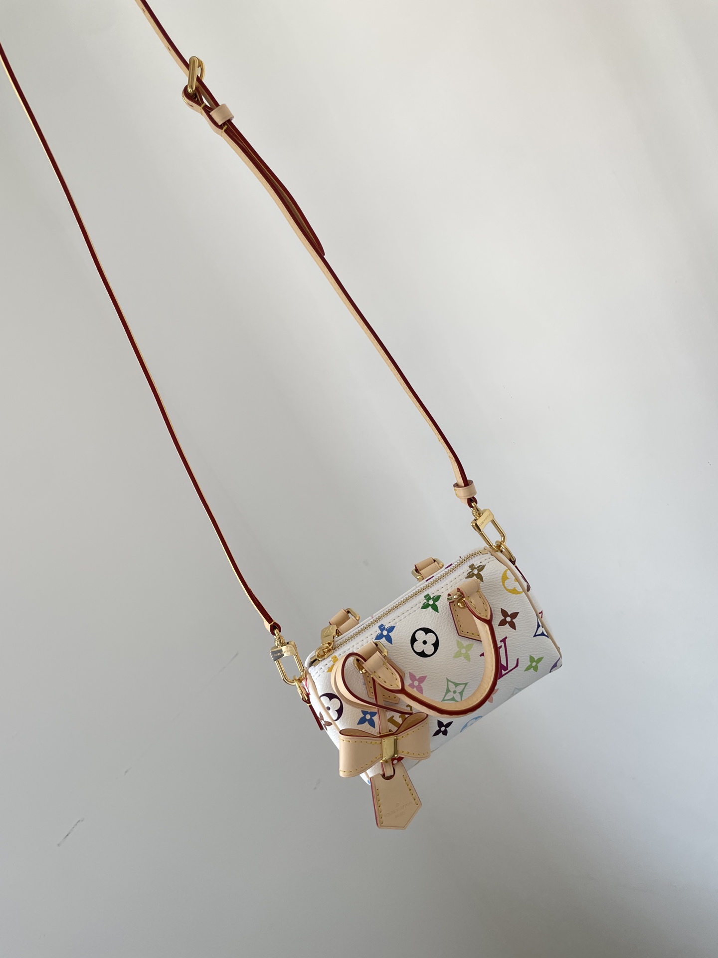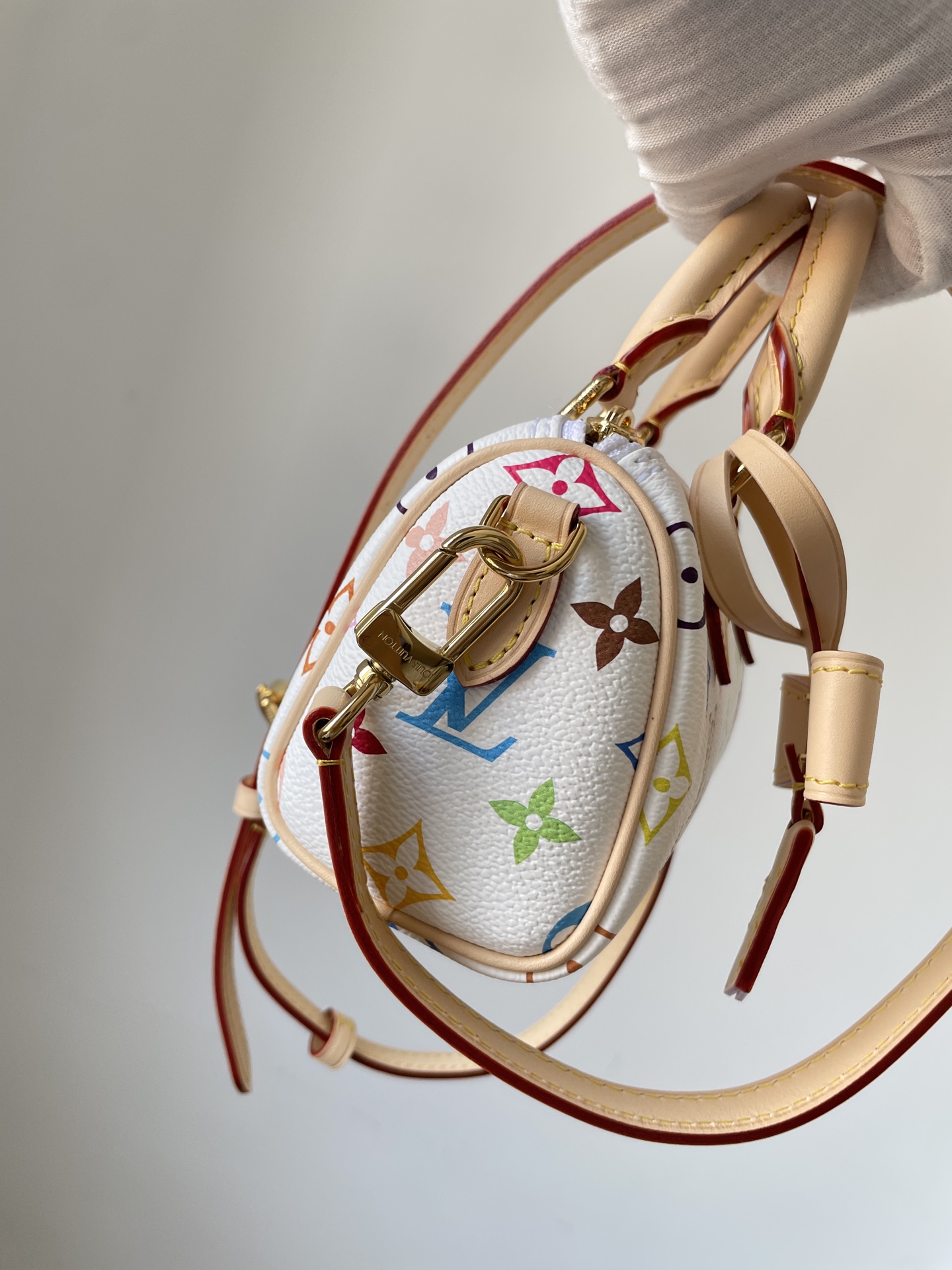 The Nano Speedy (M13391) distills the house’s iconic Speedy silhouette into a playful, ultra-mini companion. Part of the Louis Vuitton × Takashi Murakami re-edition, it pairs White Multicolor Monogram coated canvas with natural cowhide leather for a joyful, collectible look.