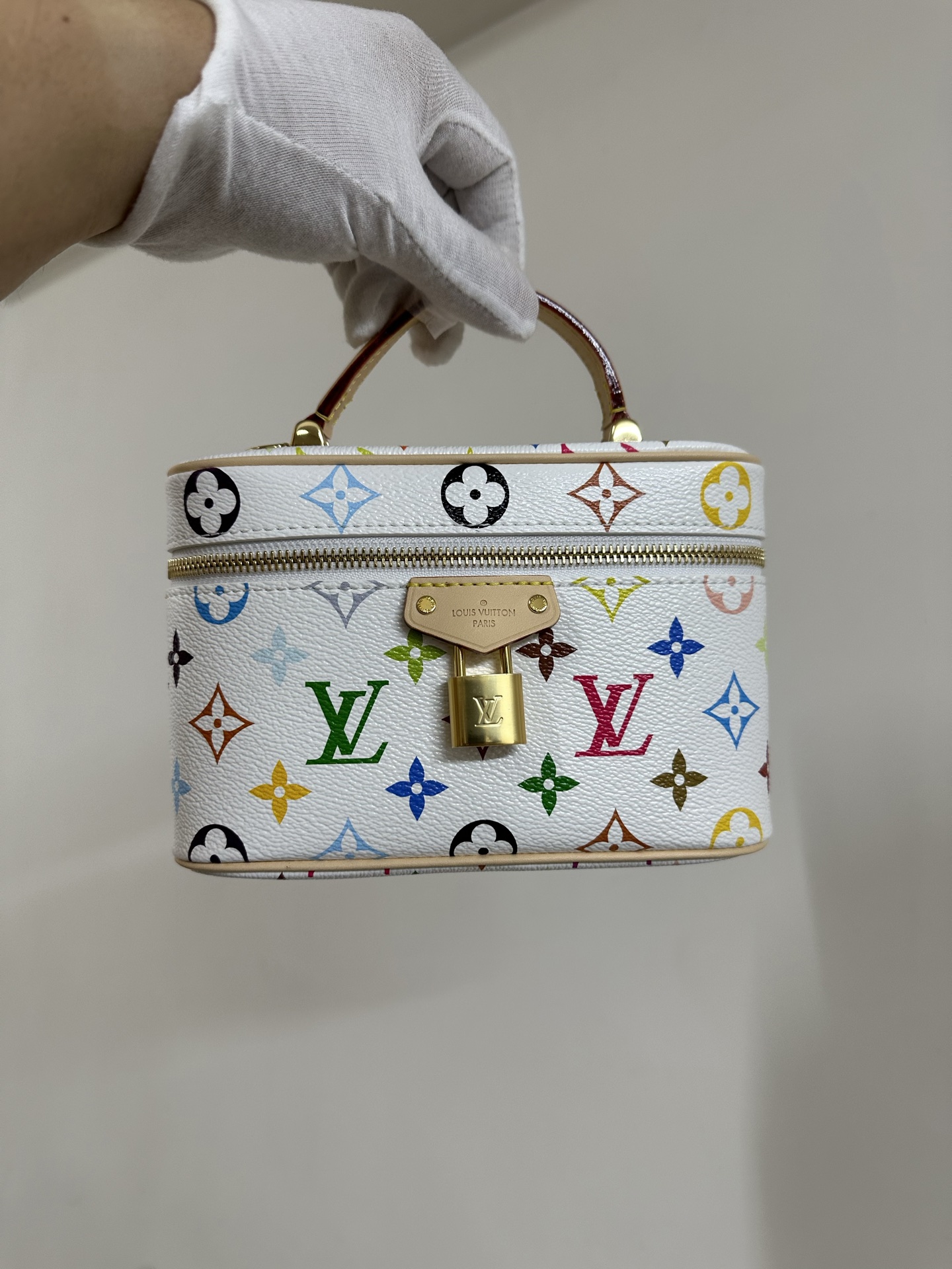 LV x Takashi Murakami Vanity Pouch in multicolor Monogram canvas with zipper closure, detachable chain, and LV padlock.