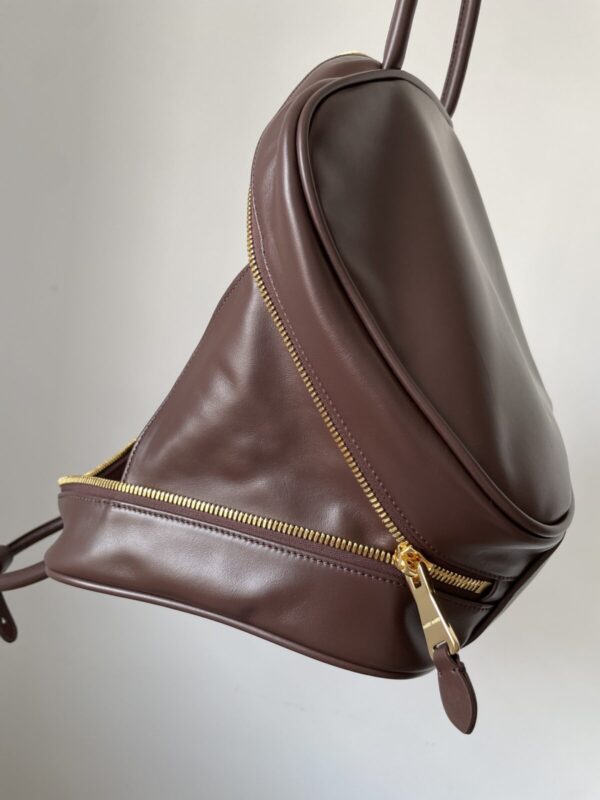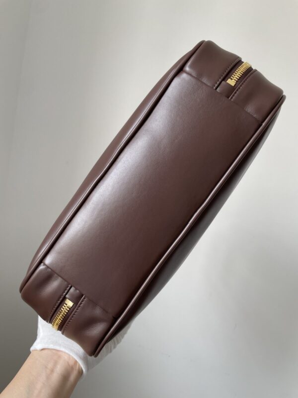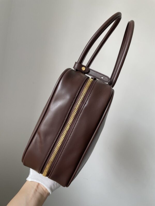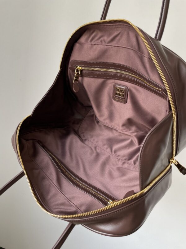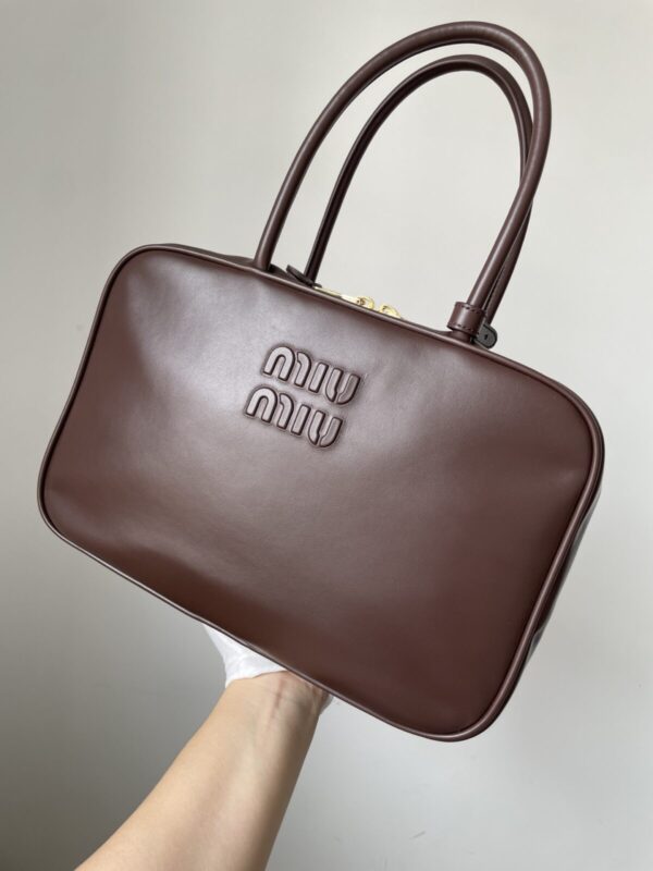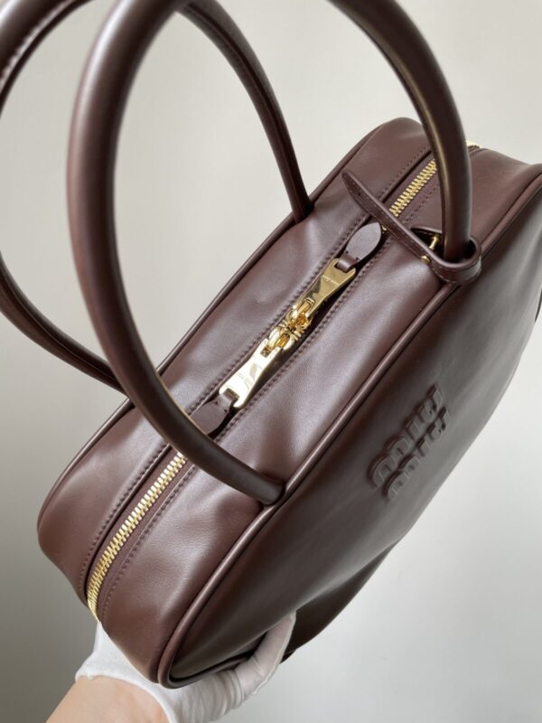 The MIU MIU Beau Bowling Shoulder Bag crafted from supple calfskin features gold hardware, top handle, and zip closure. Dimensions: 34×10×23cm.
