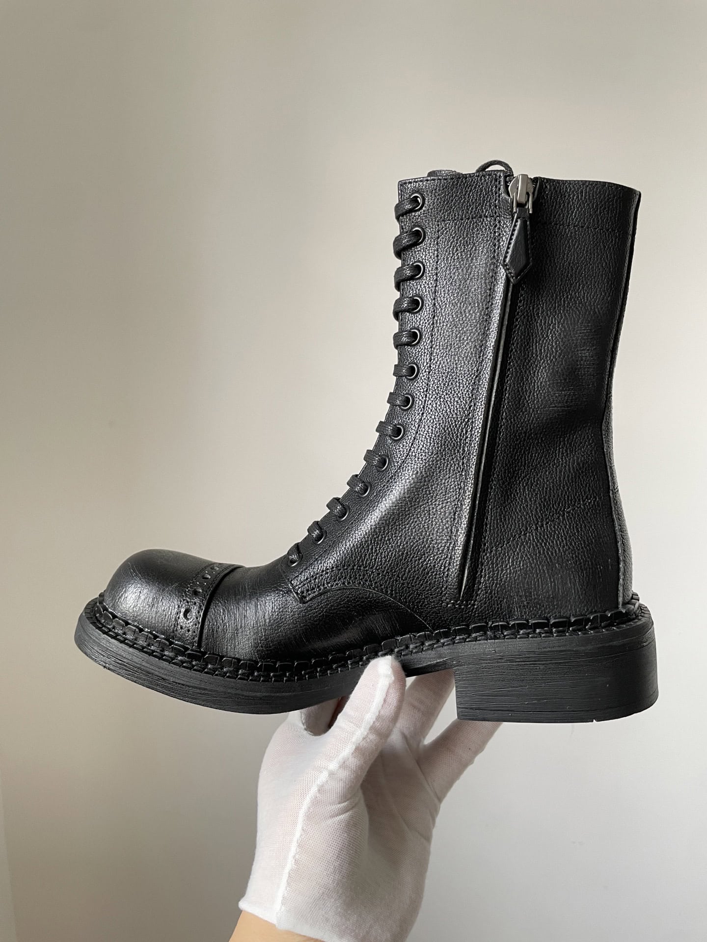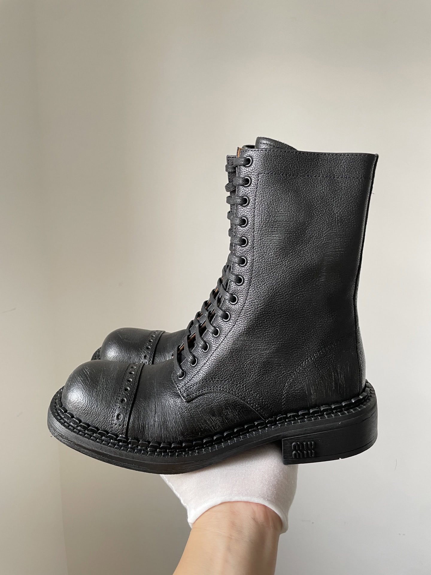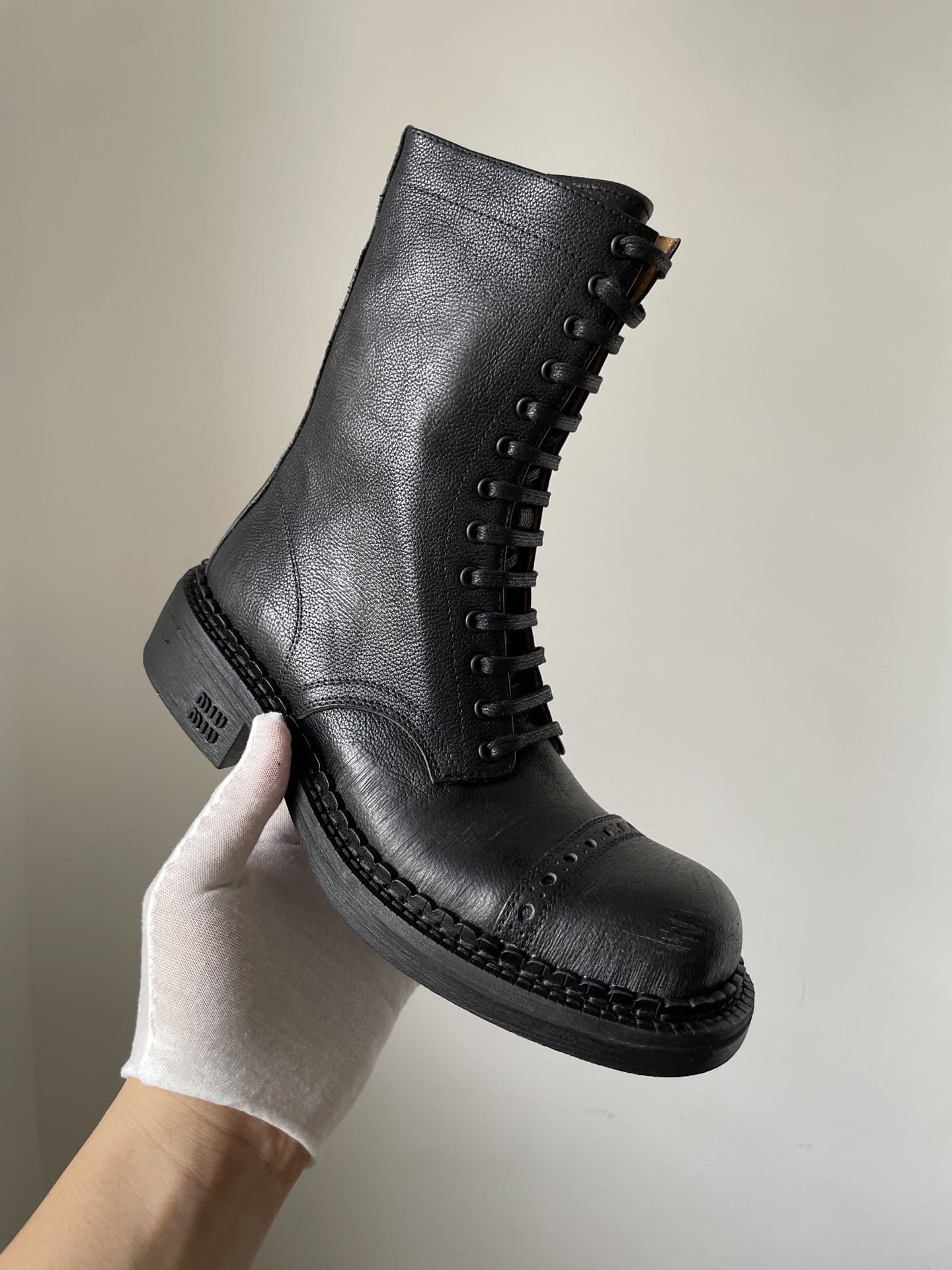 Miu Miu FW24 Leather Round Toe Lace-Up Block Heel Boots Women Black