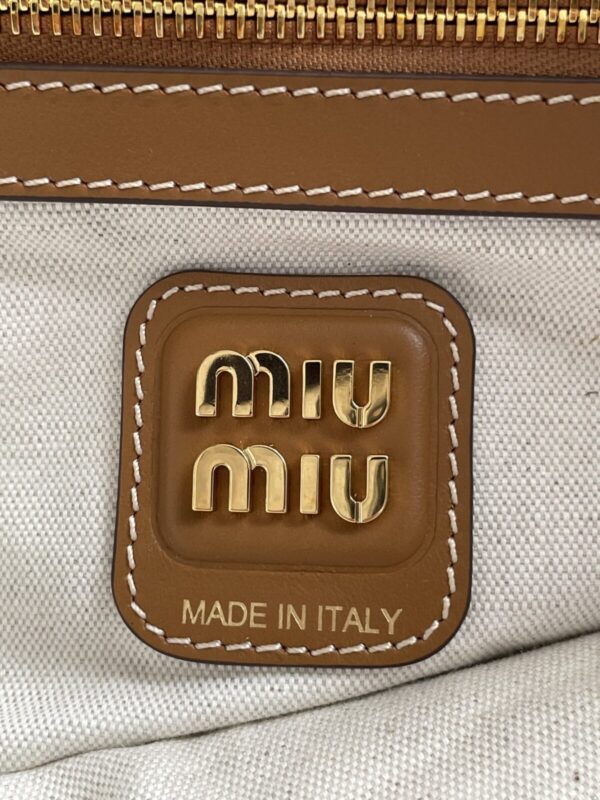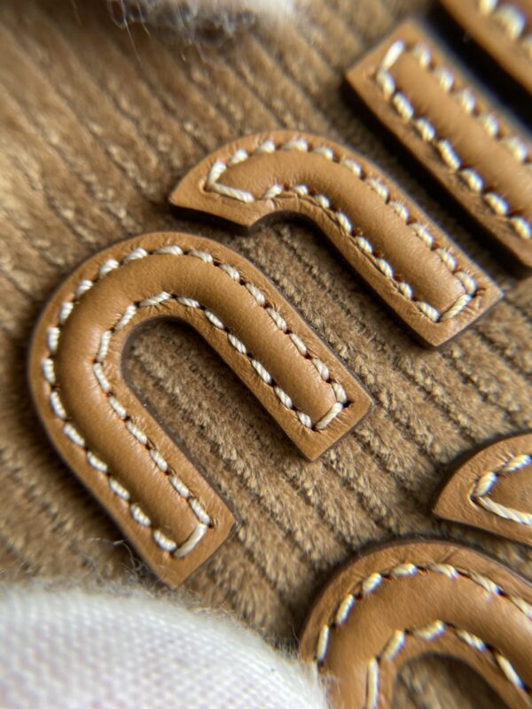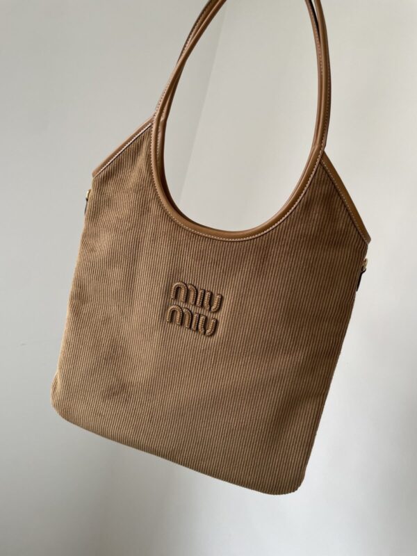 The MIU MIU Ivy Tote crafted from plush corduroy fabric in cinnamon brown features an embroidered logo and roomy design. Dimensions: 35×40cm.