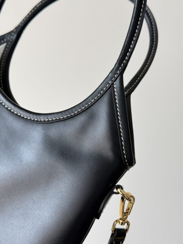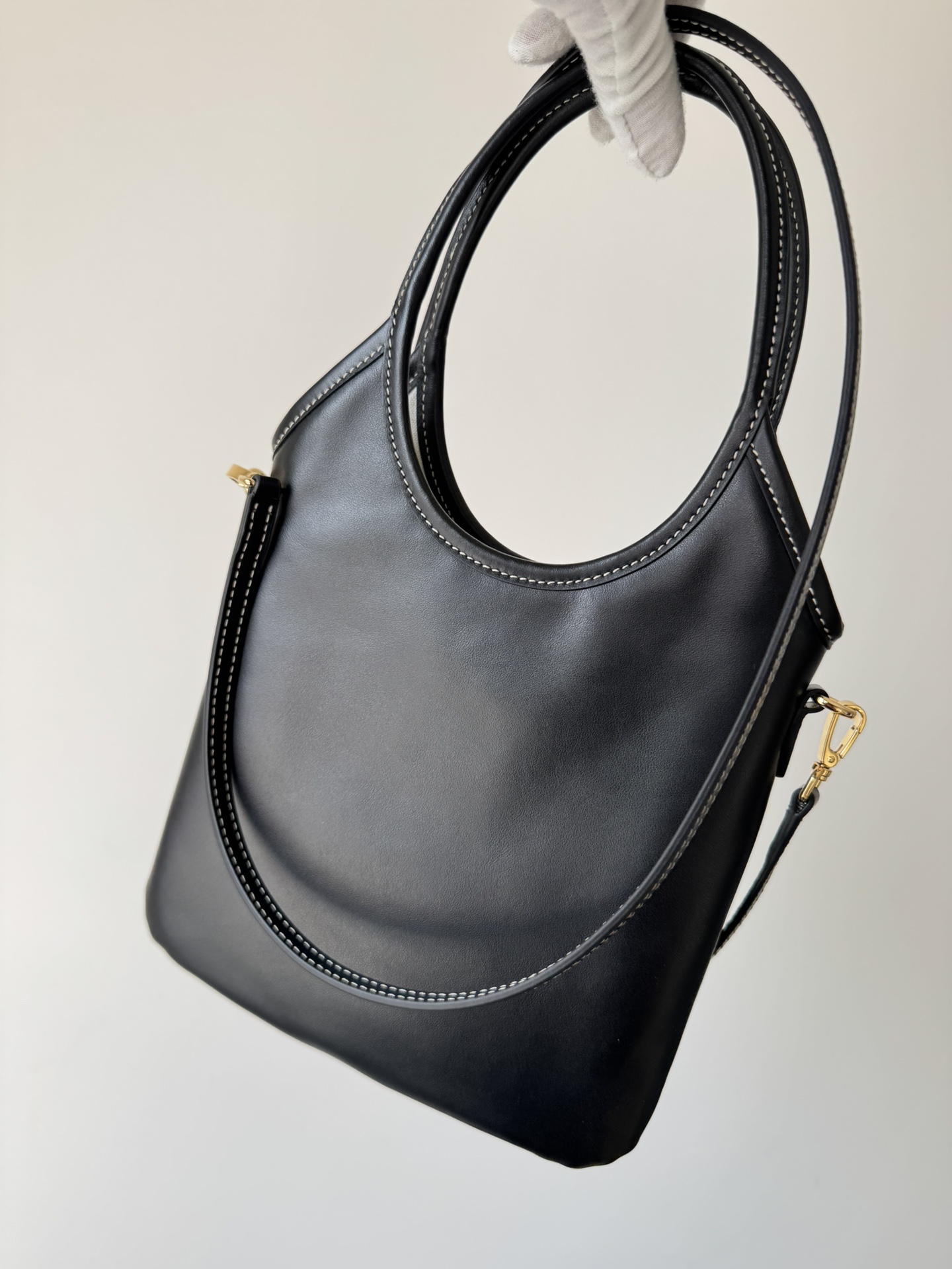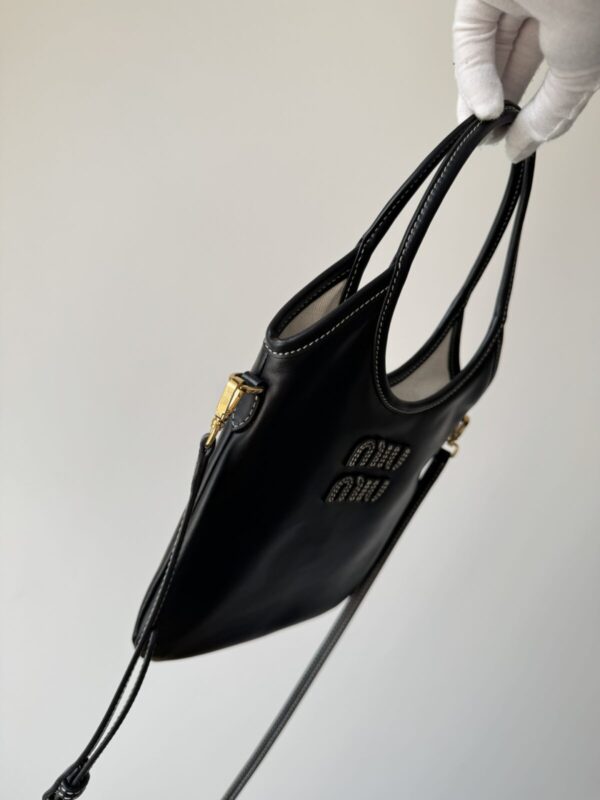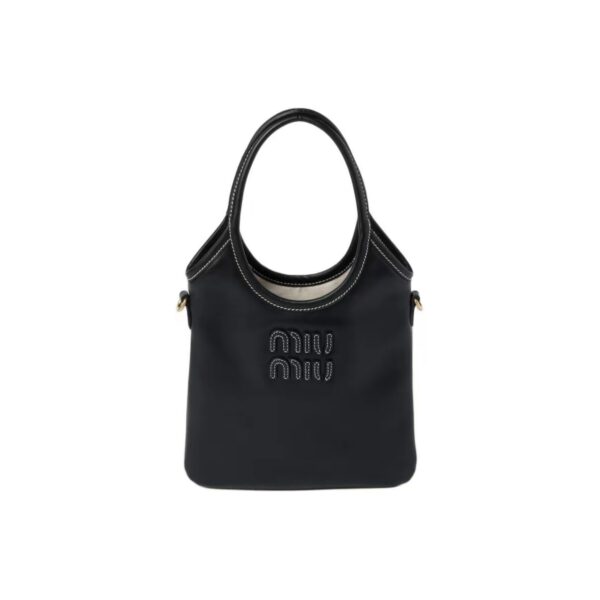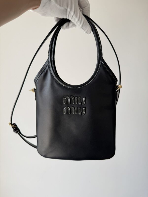 The MIU MIU Ivy Shoulder Bag crafted from smooth black leather with adjustable strap and engraved logo. Perfect balance of modern chic and practicality. Dimensions: 20×24cm.
