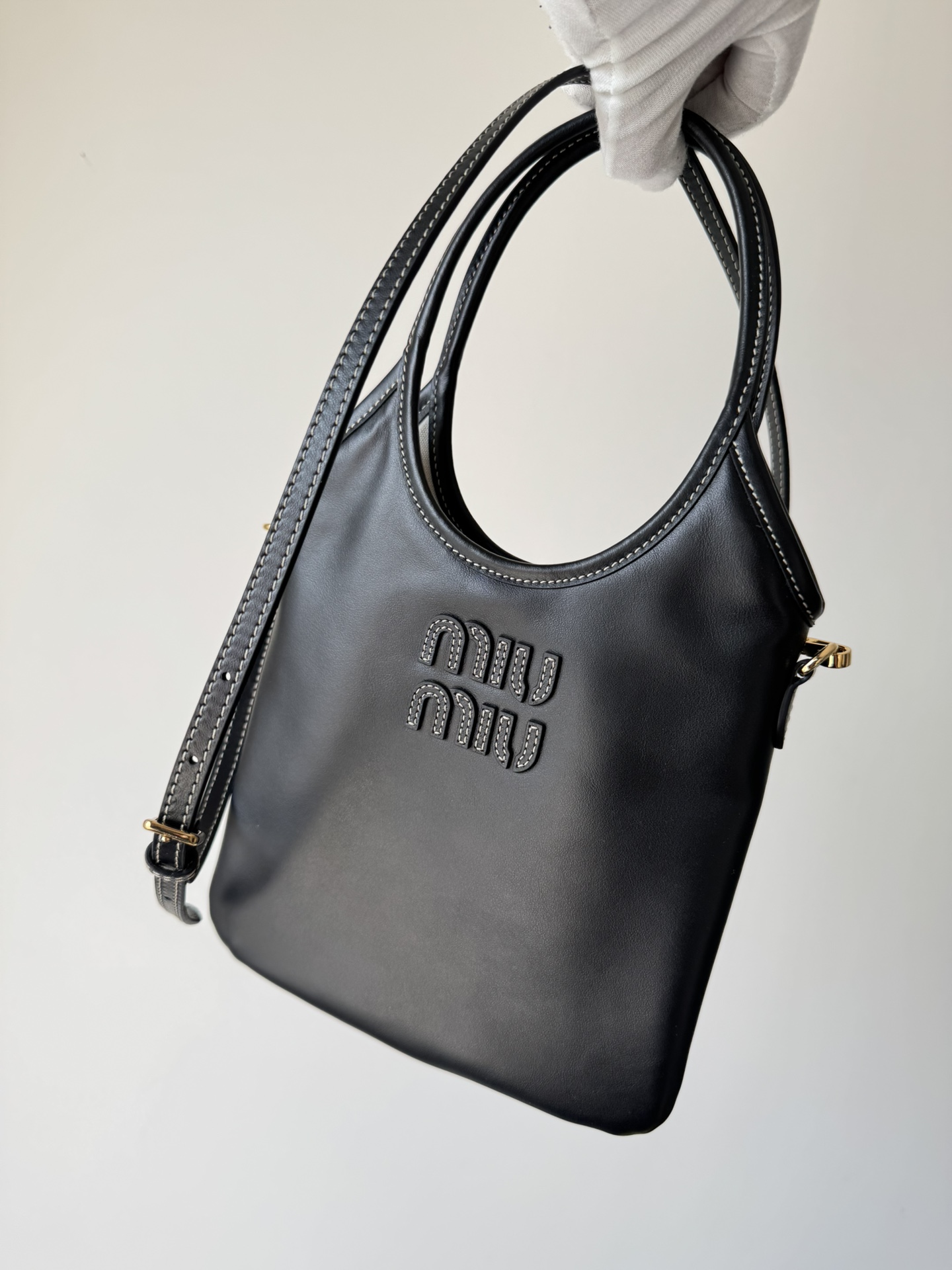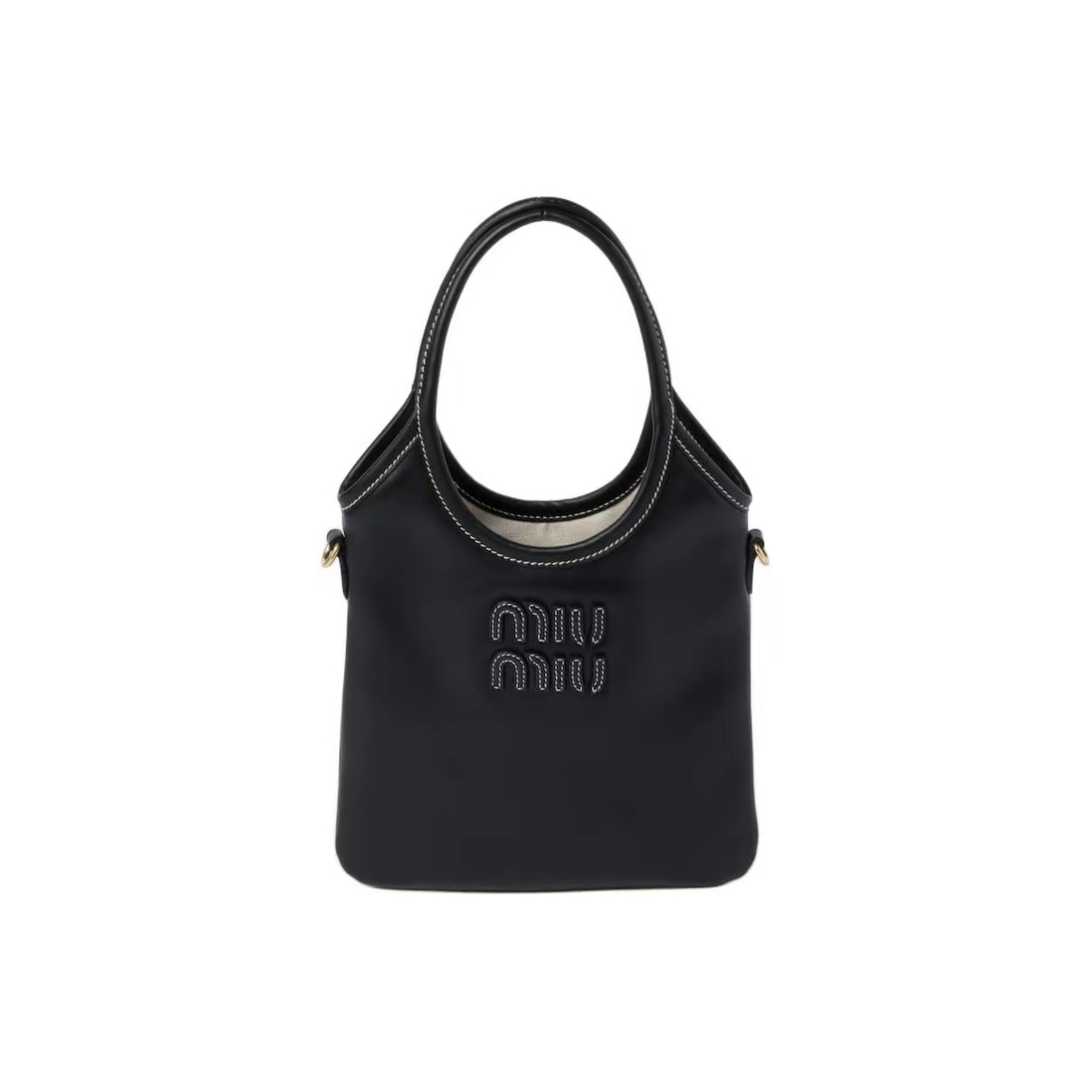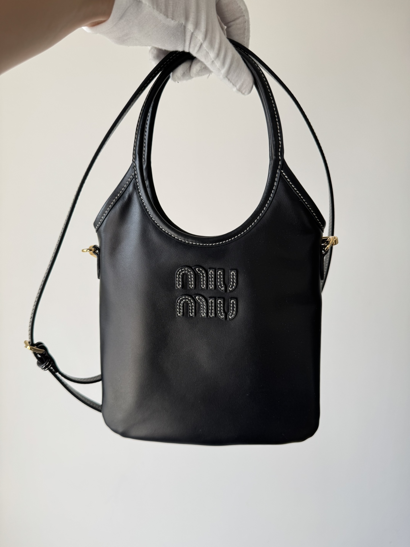 MIU MIU Ivy leather bag in black with detachable strap and logo engraving — elegant and versatile.