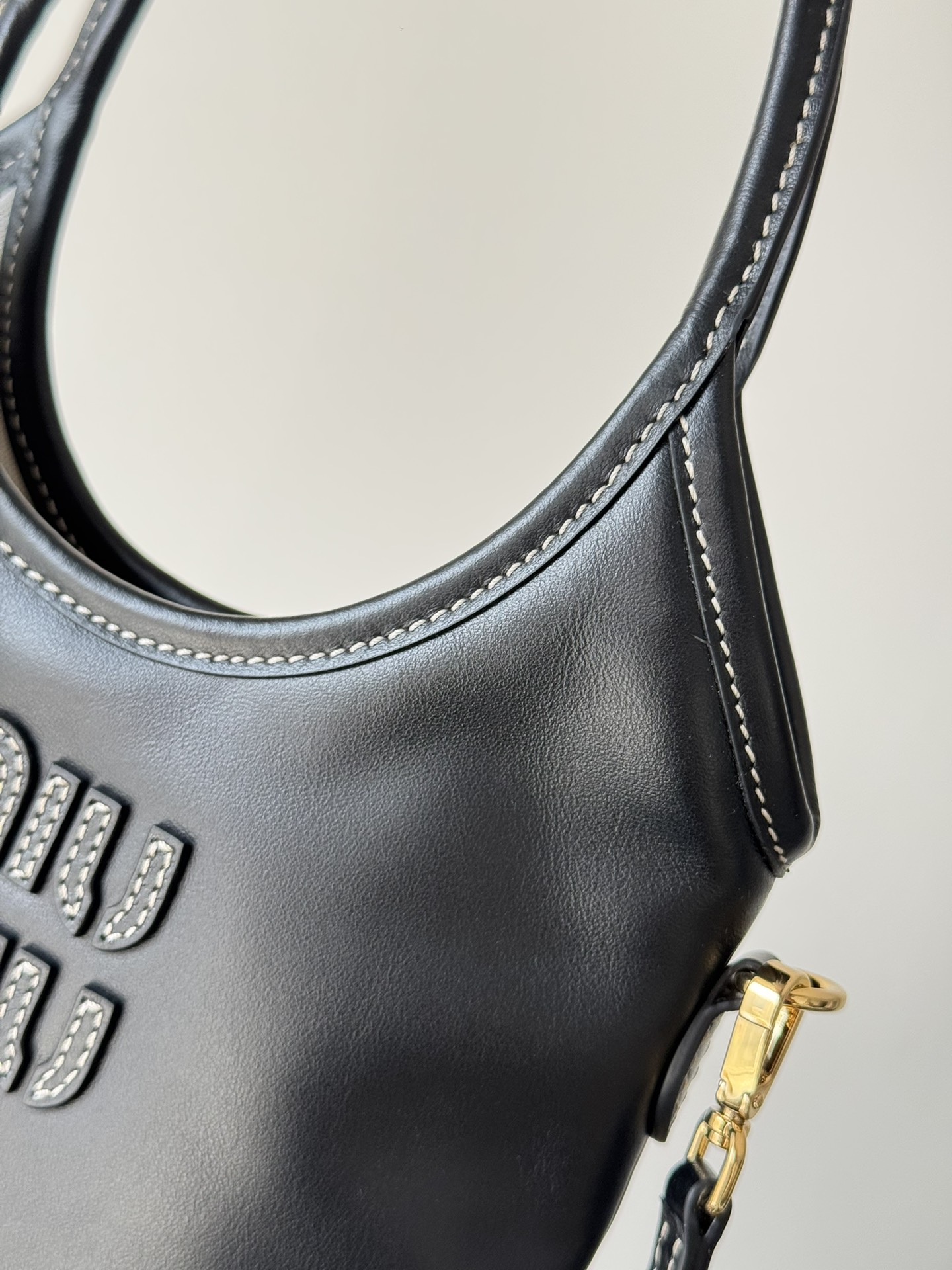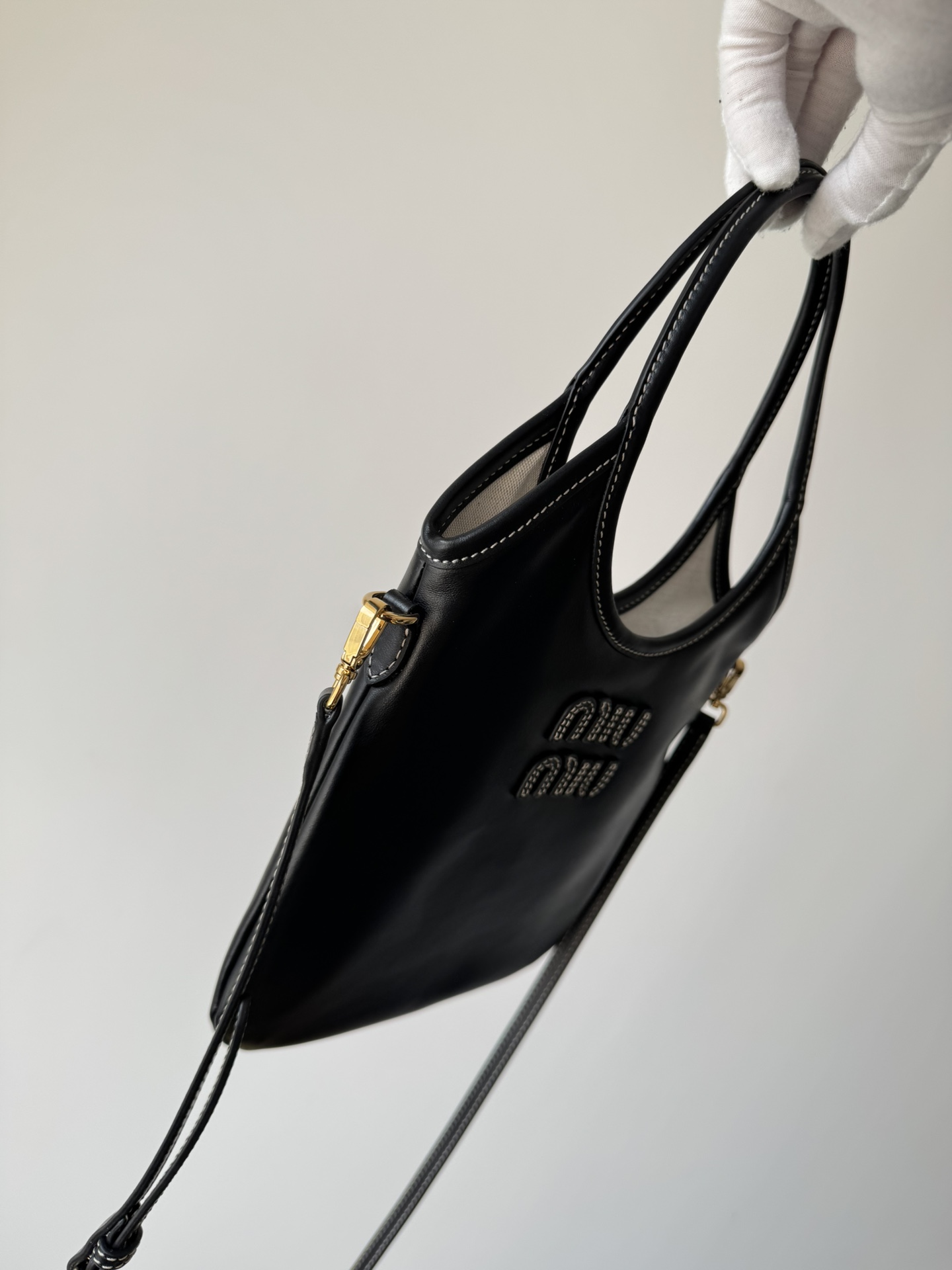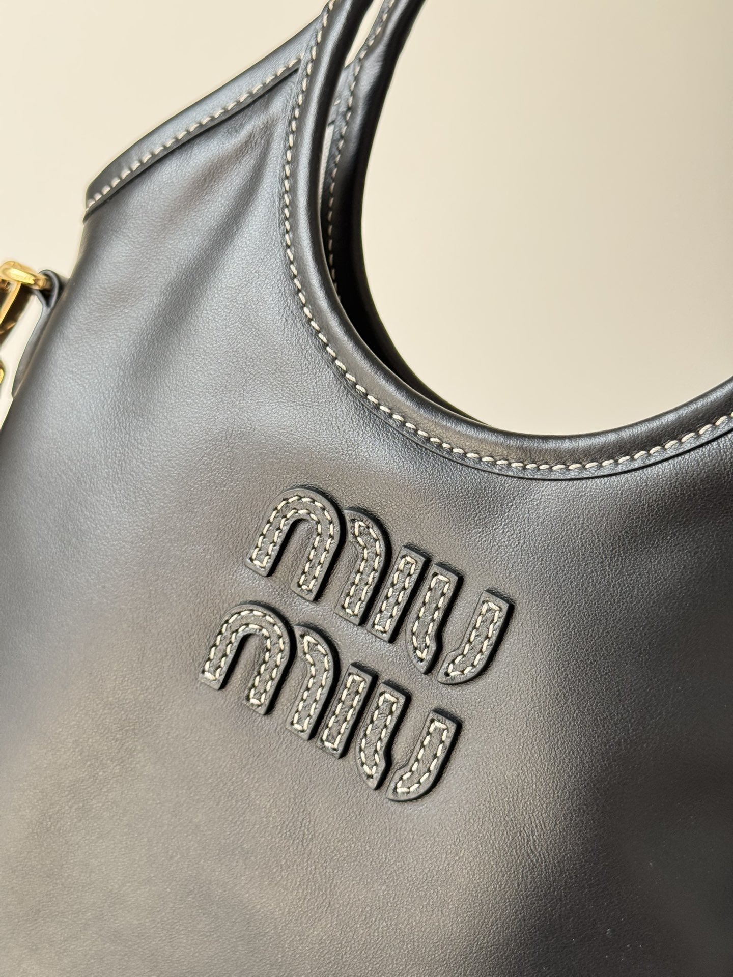 MIU MIU Ivy leather bag in black with detachable strap and logo engraving — elegant and versatile.