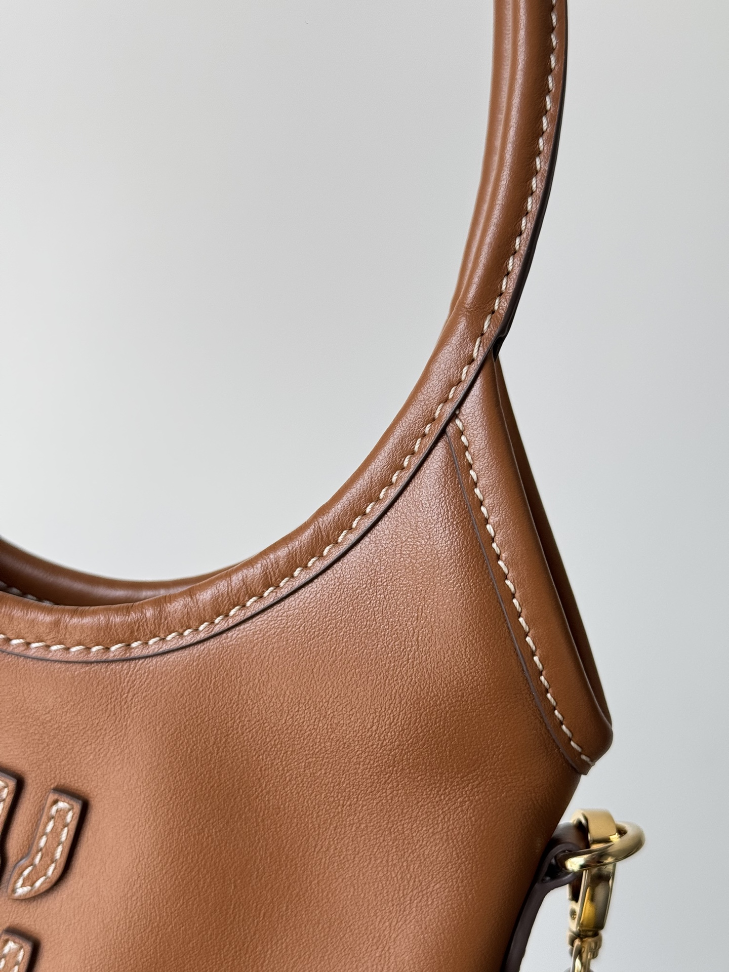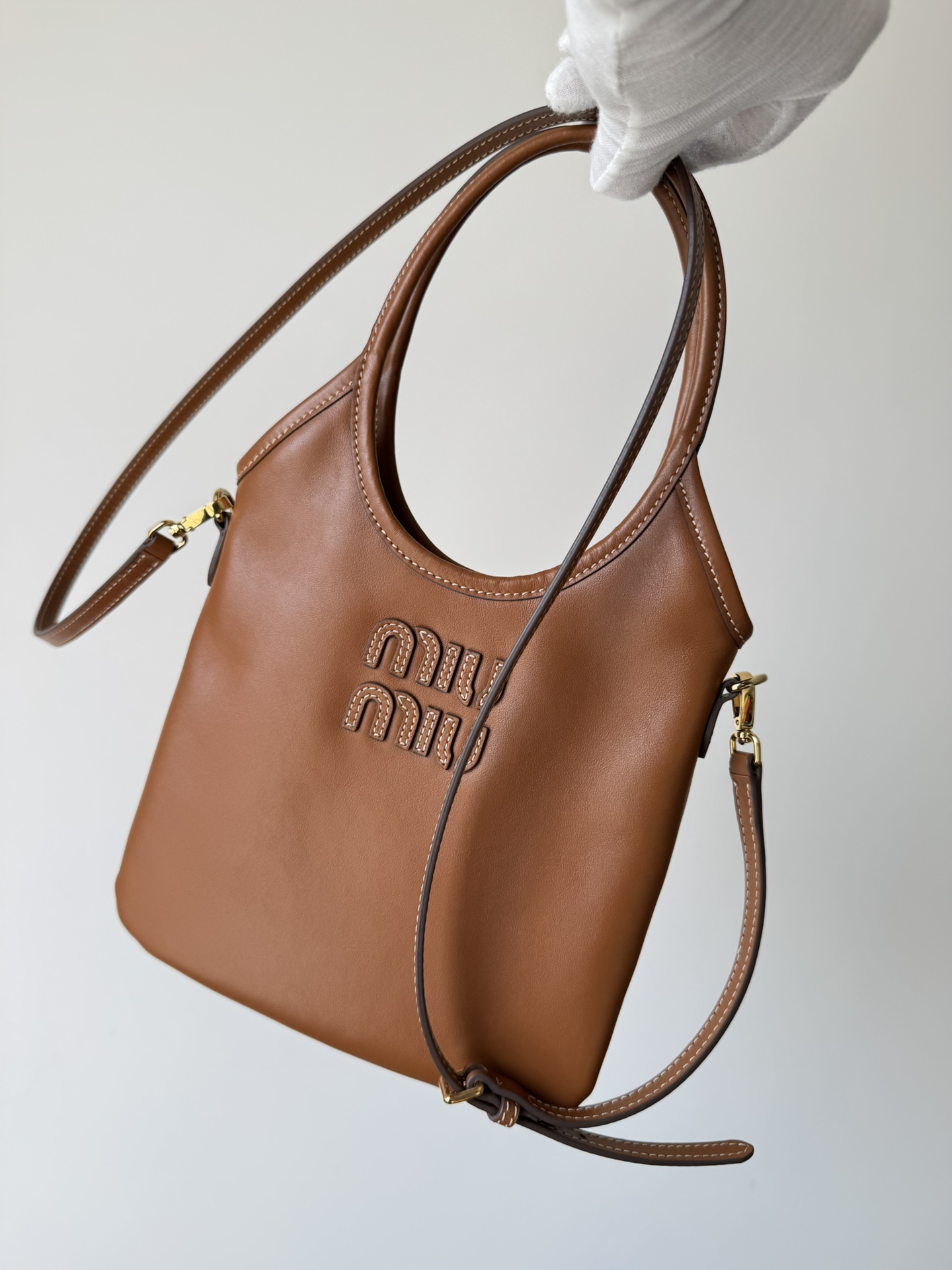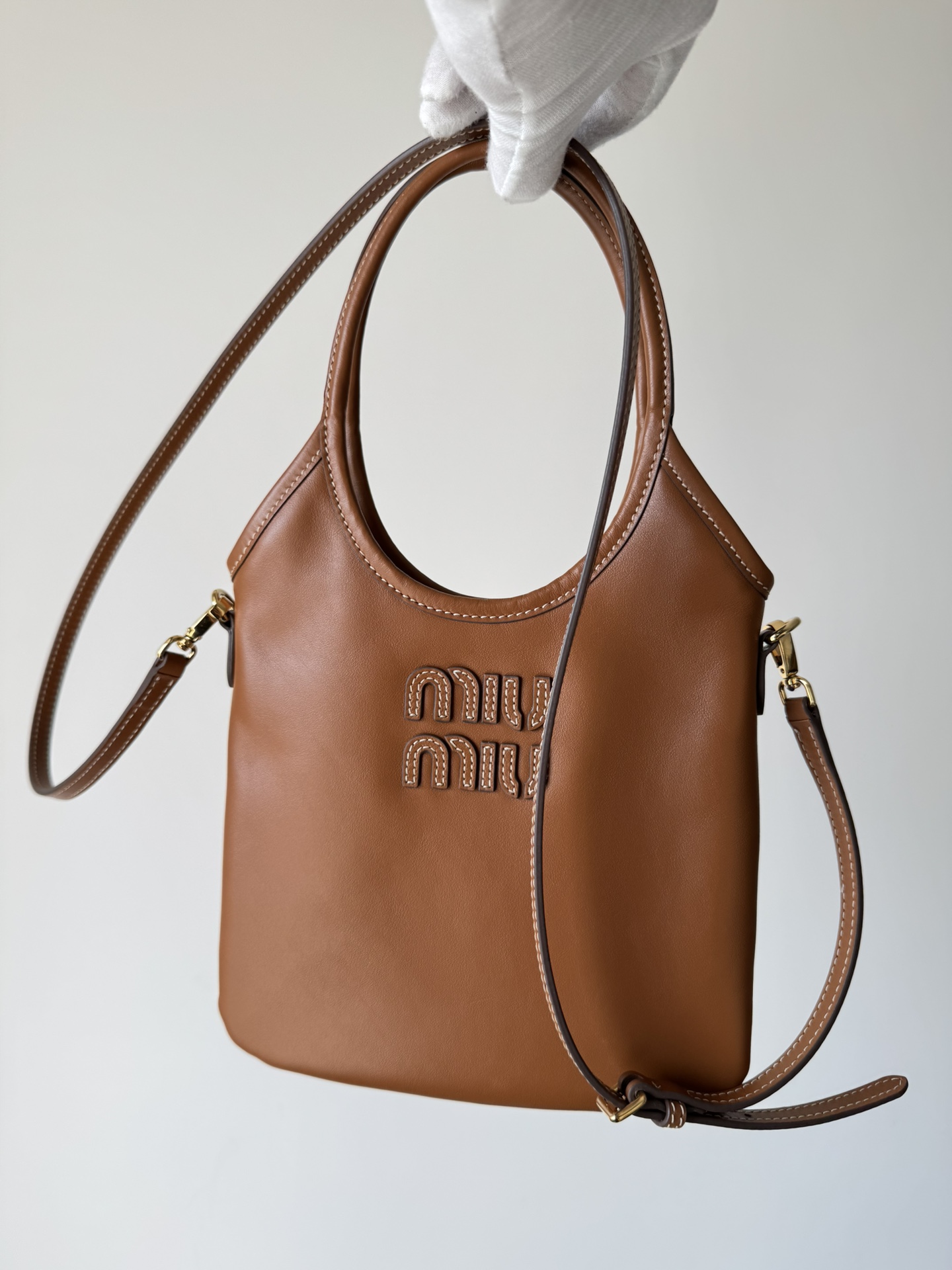 MIU MIU Ivy shoulder bag in cognac leather with logo detail and adjustable strap — soft and structured.