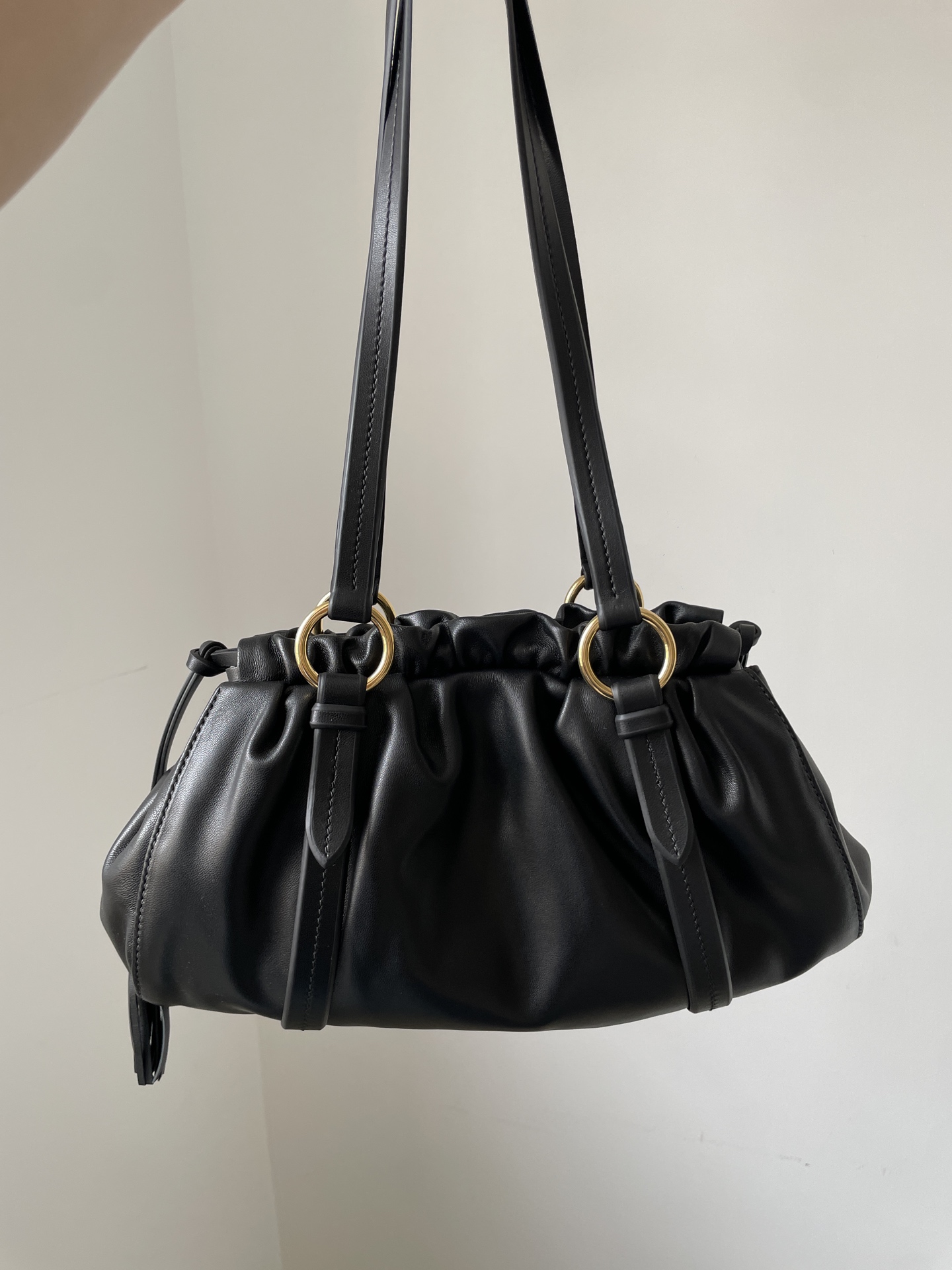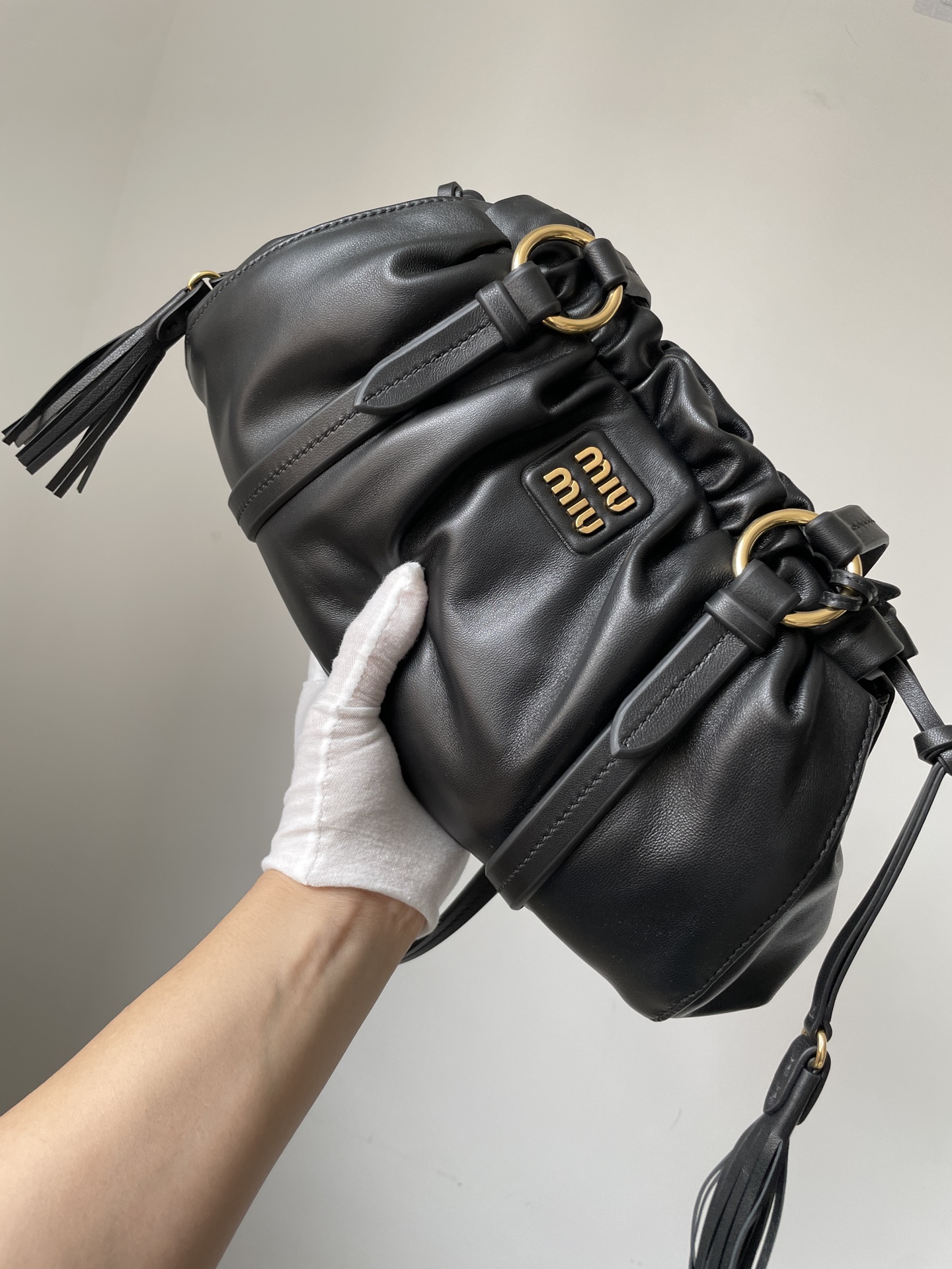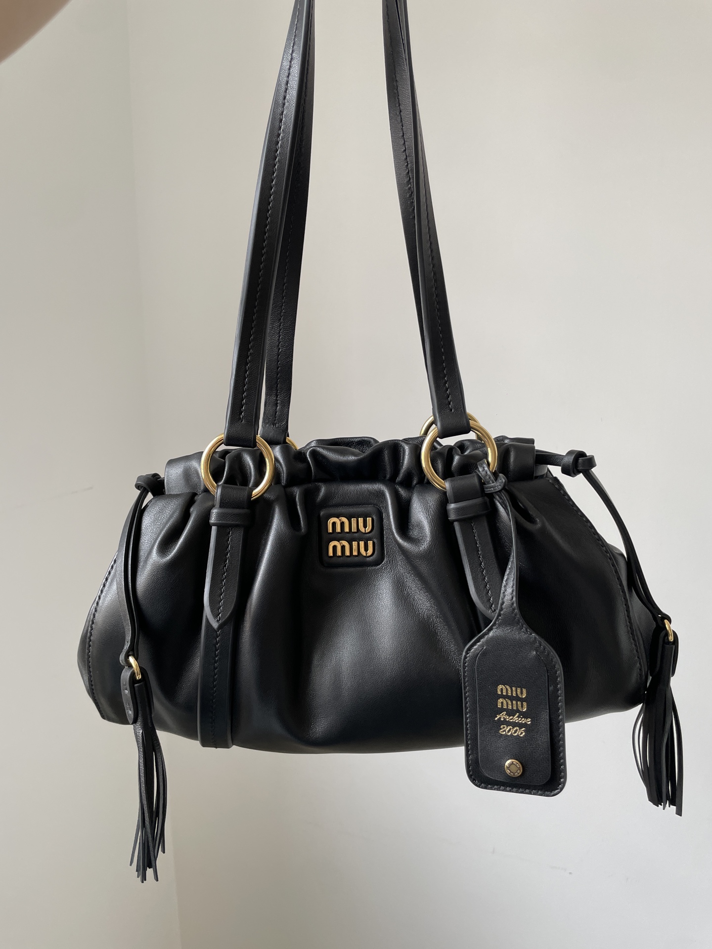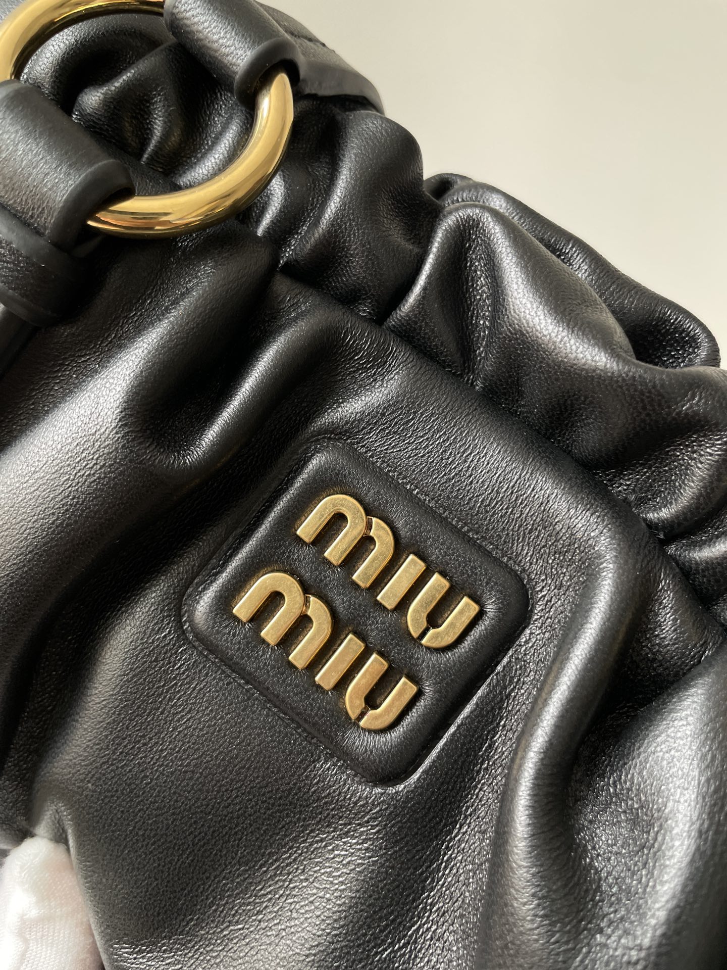 MIU MIU Joie bag in black nappa leather with drawstring closure and vintage gold hardware — stylish and compact.