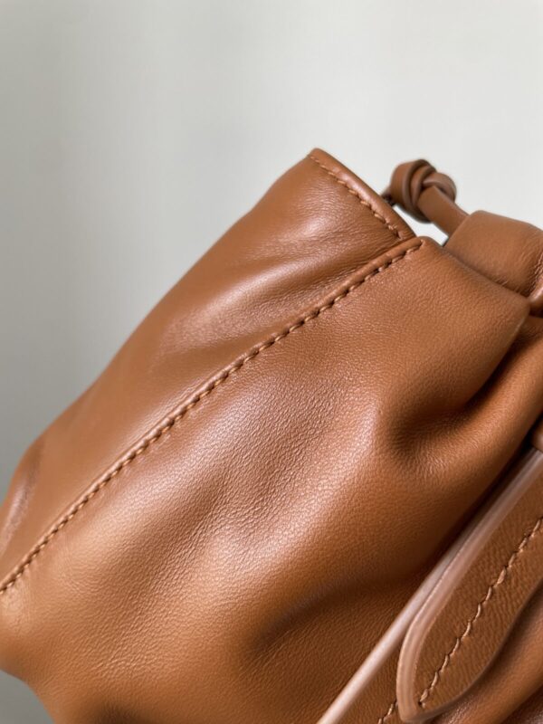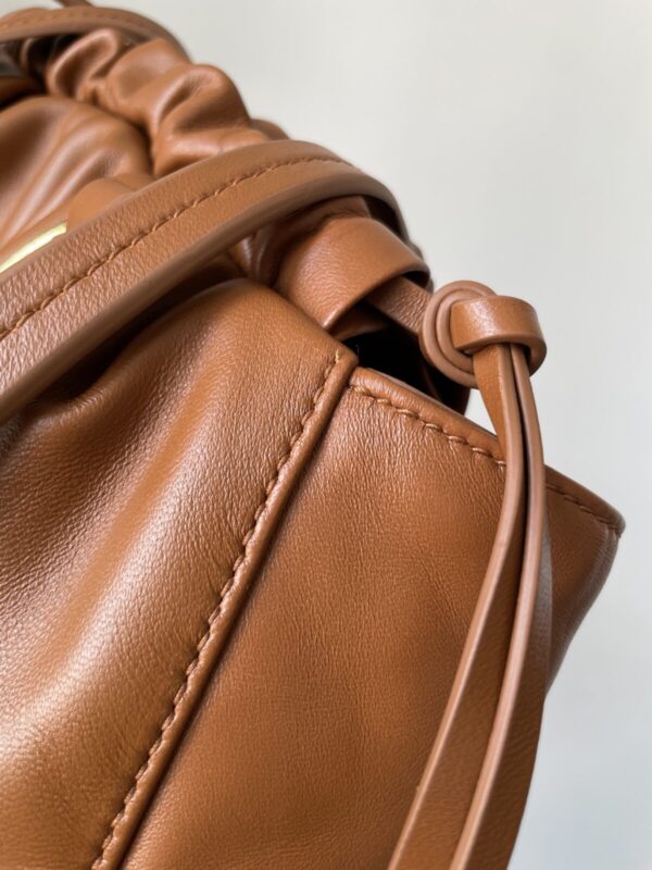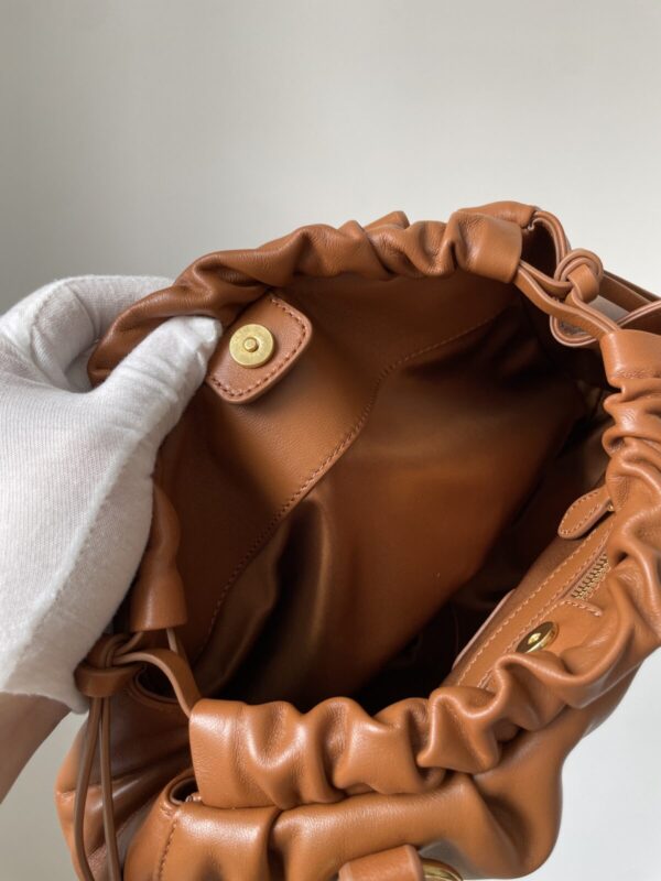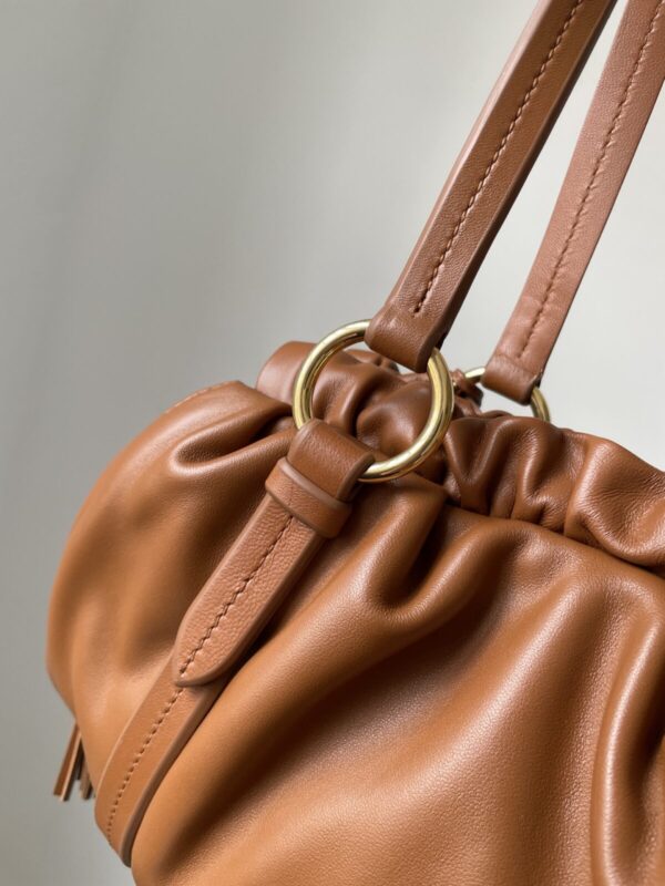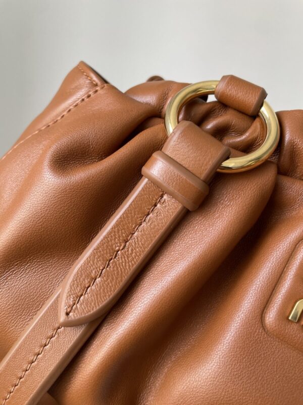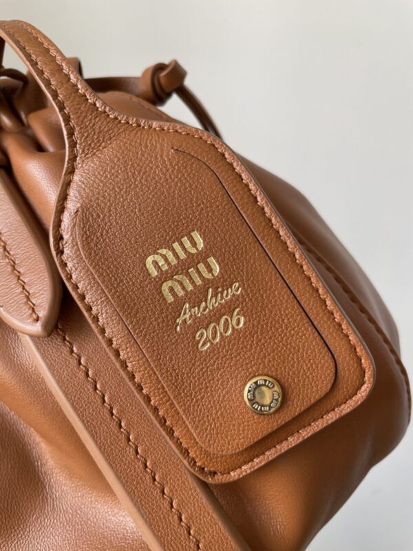 The MIU MIU Joie Shoulder Bag crafted from soft cognac nappa leather features magnetic closure, gold hardware, and versatile handle. Dimensions: 32×10.5×16cm.