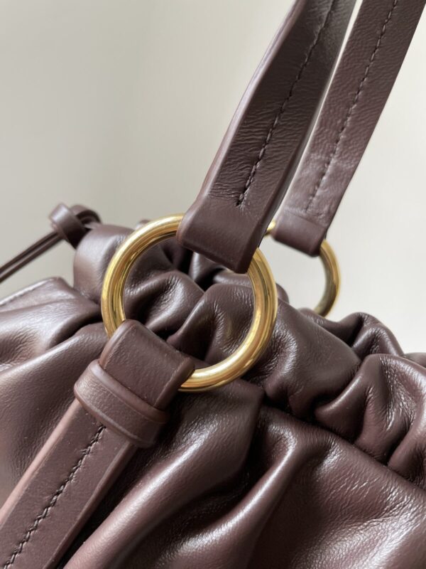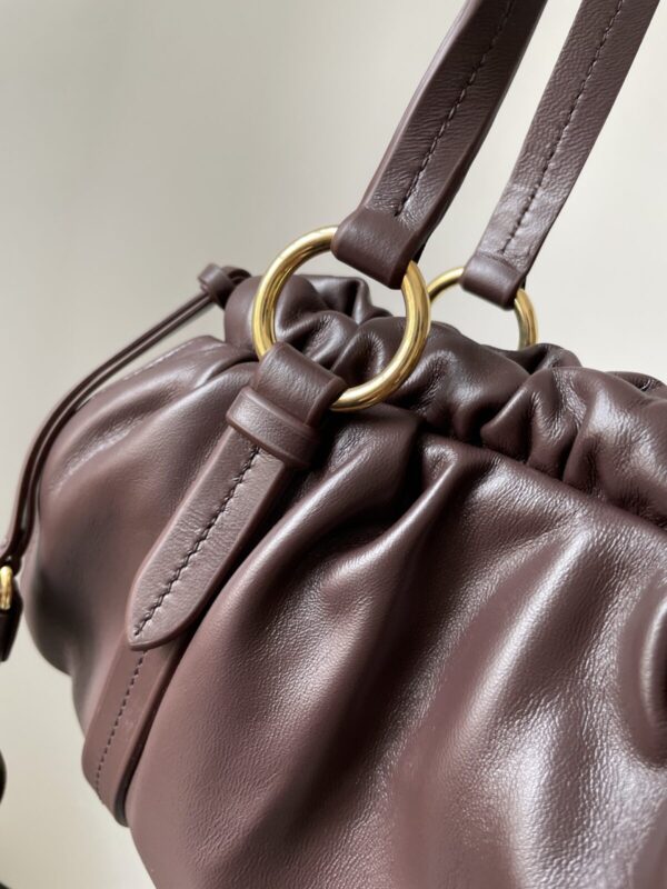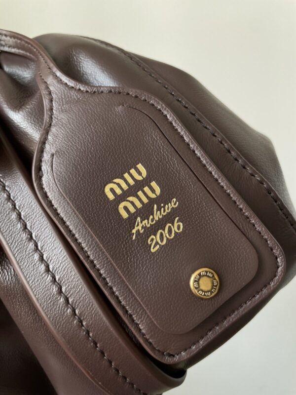 The MIU MIU Joie Nappa Leather Tote crafted in soft brown leather featuring a top handle and logo stamp. Dimensions: 32×10.5×16cm.