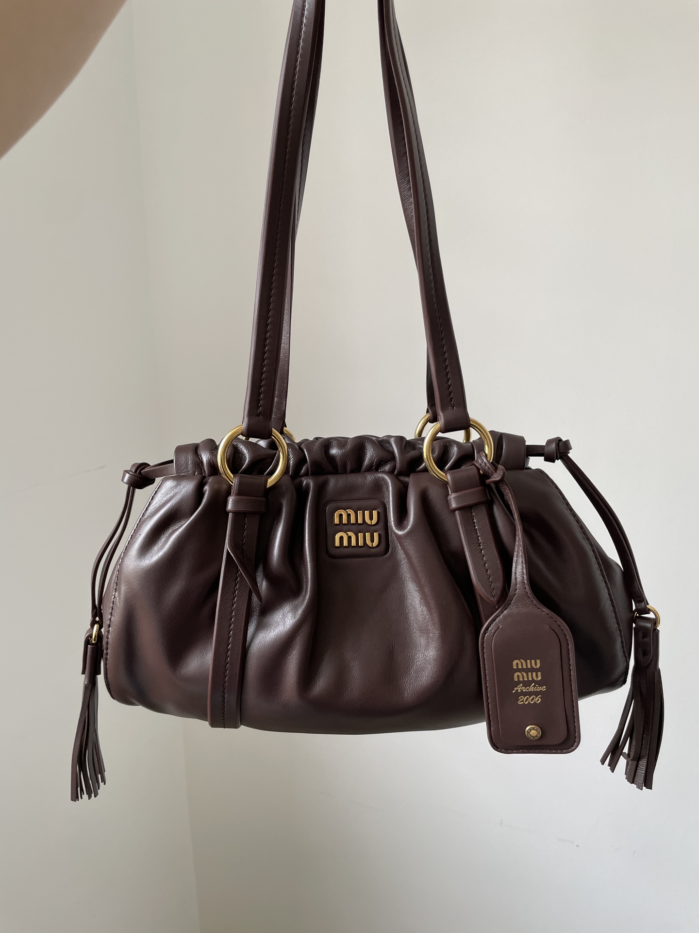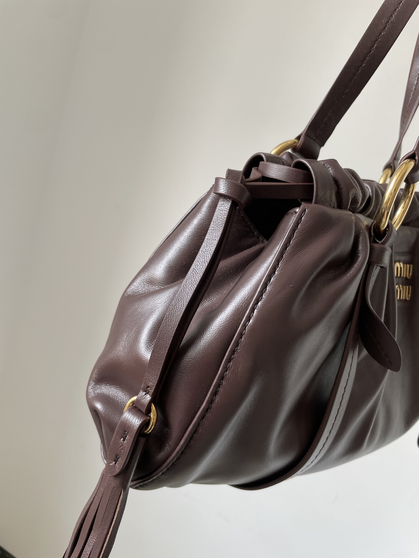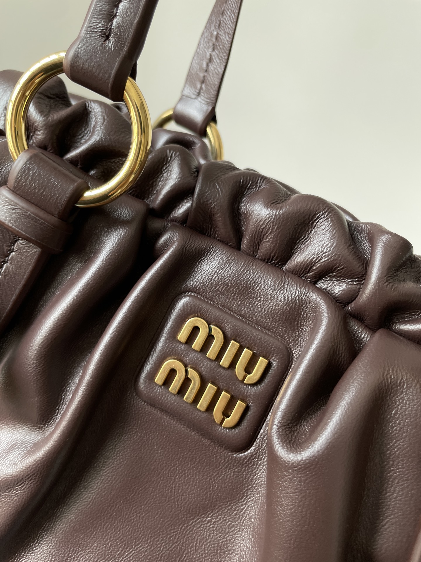 MIU MIU Joie tote in brown nappa leather with logo detail — timeless simplicity with luxurious feel.