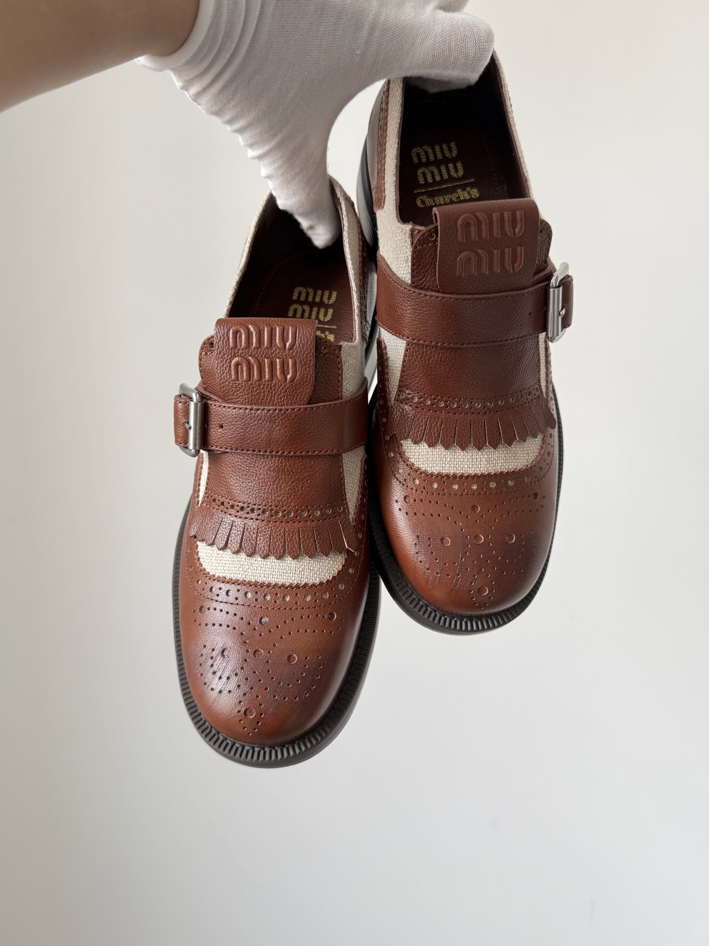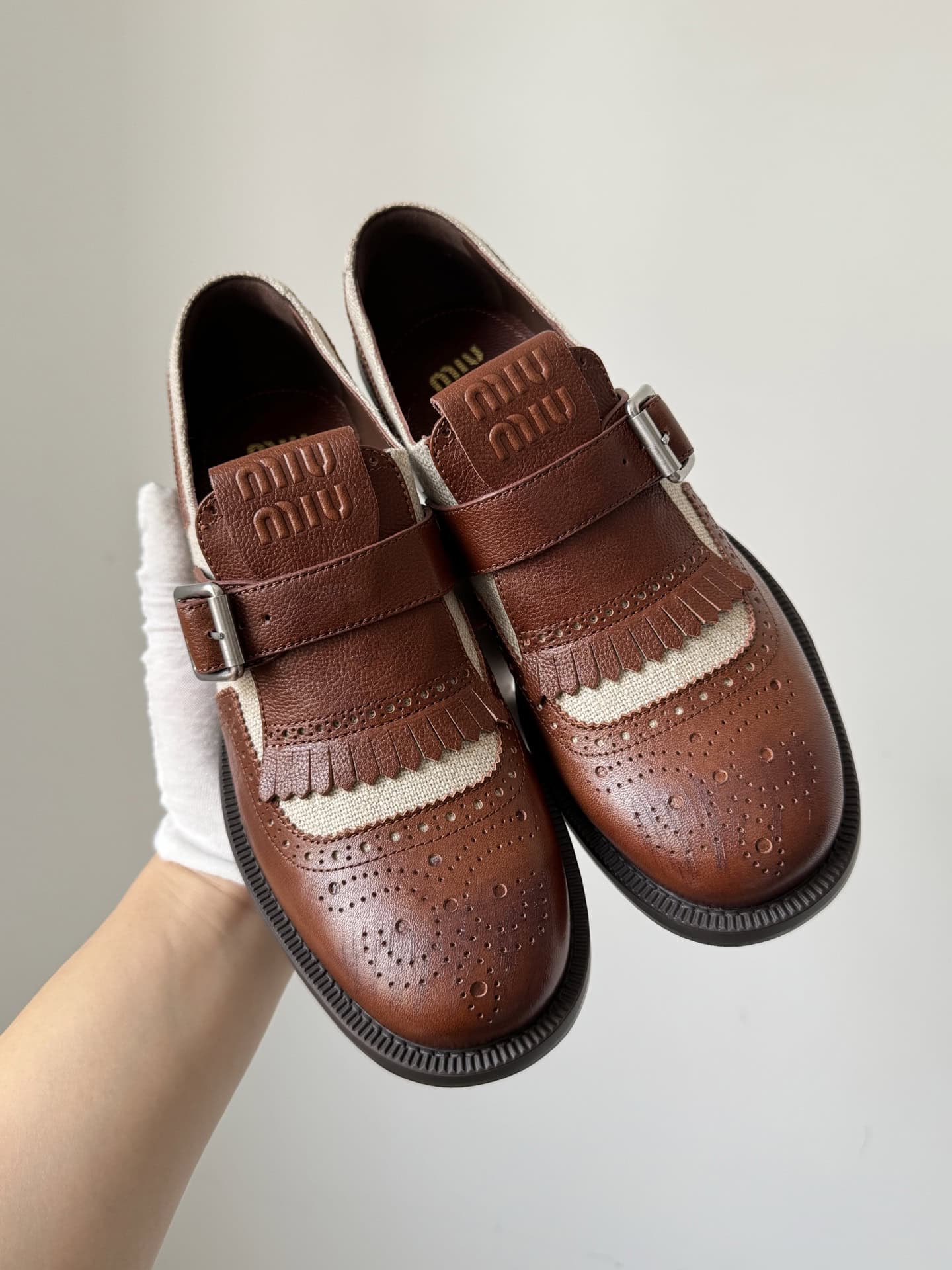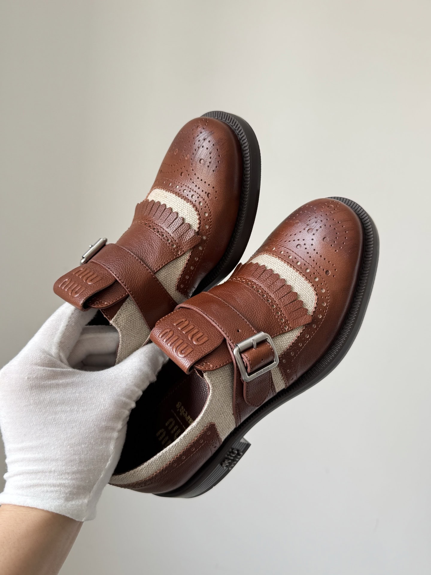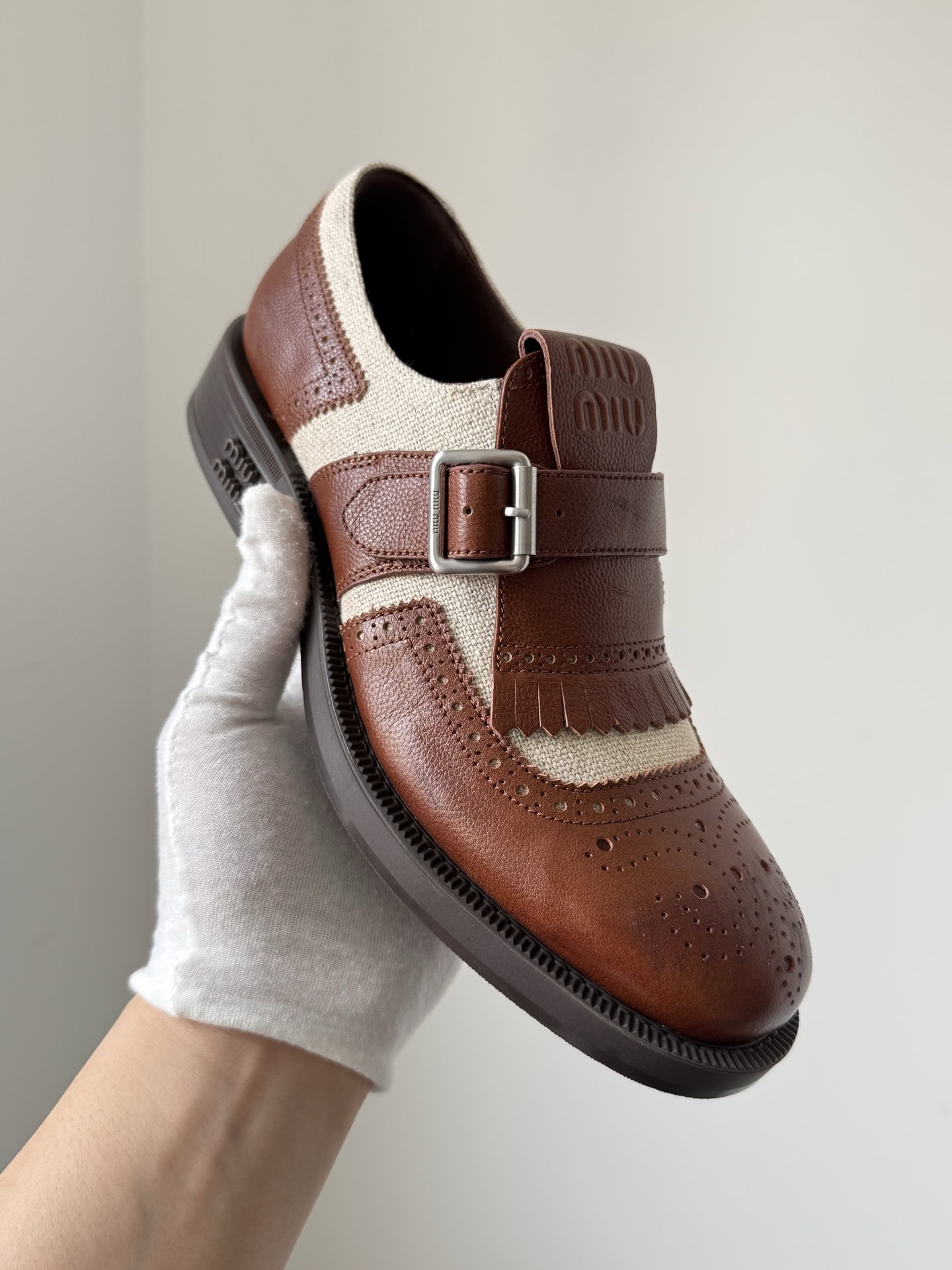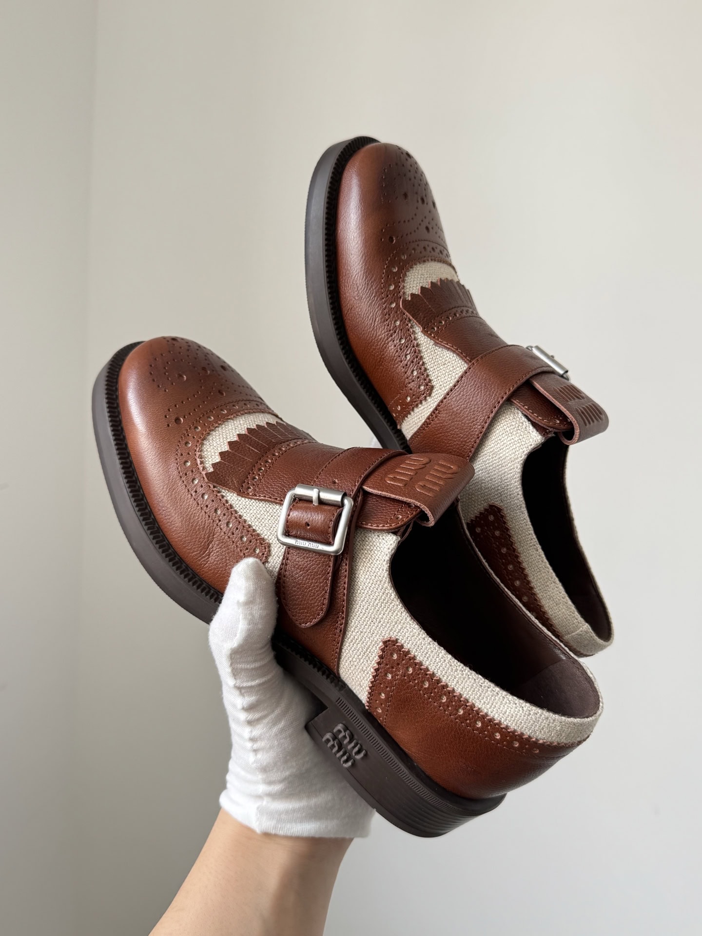 Miu Miu Leather Round Toe Buckle Dress Shoes Women Brown Gray crafted from premium materials with refined detailing, delivering sophistication, comfort, and timeless elegance for everyday wear.