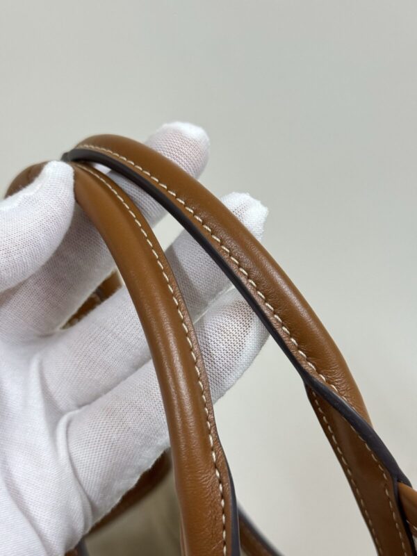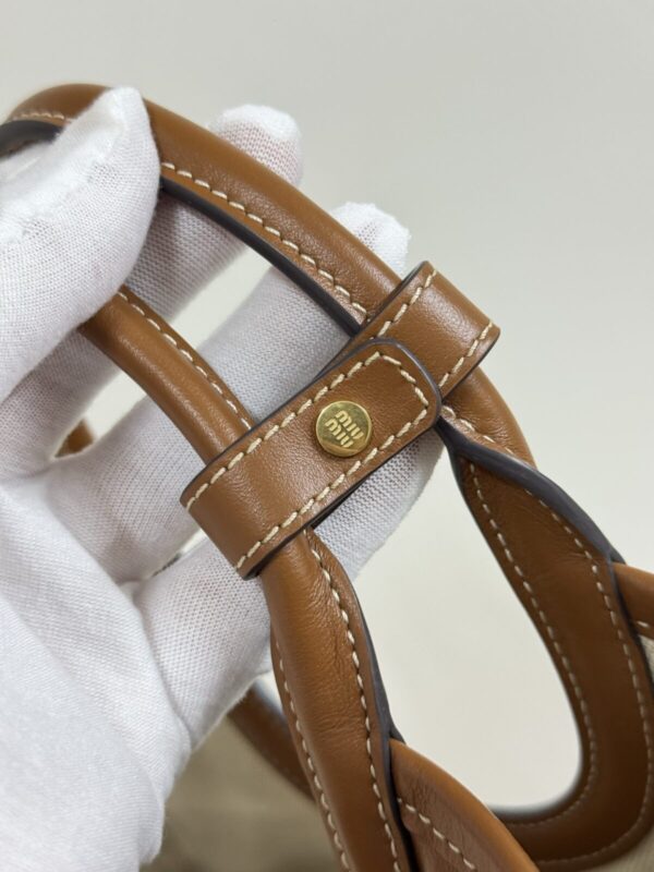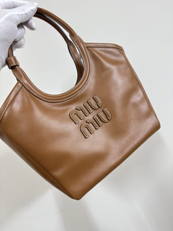 The MIU MIU Logo Shoulder Bag crafted from caramel brown leather featuring embossed logo, detachable strap, and structured body. Dimensions: 22×12×23.5cm.