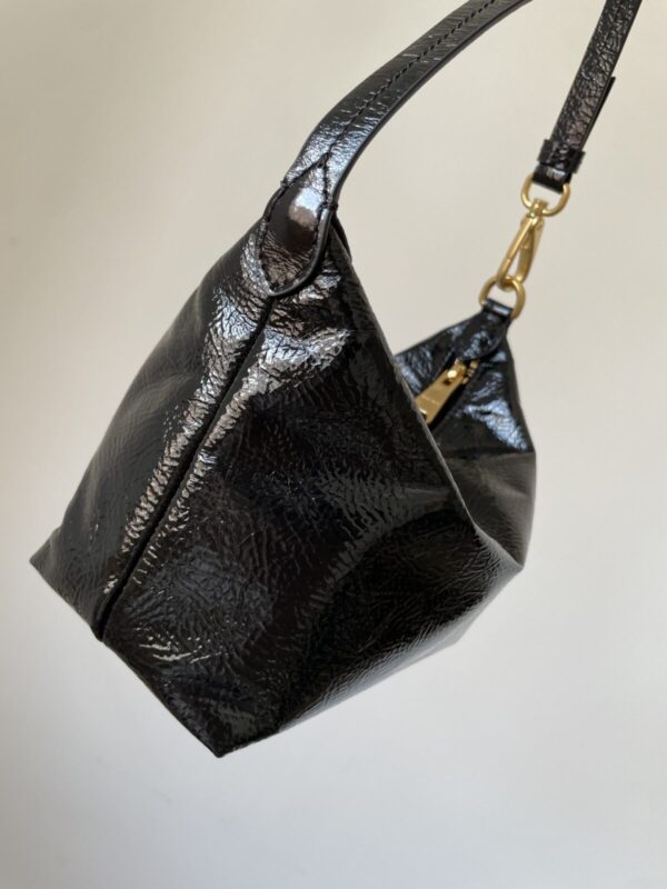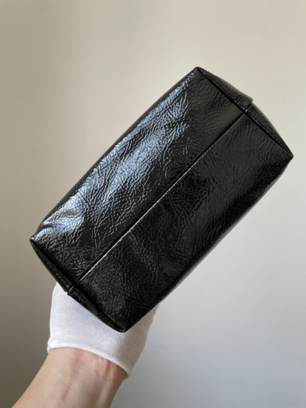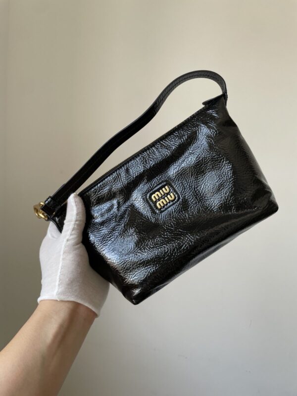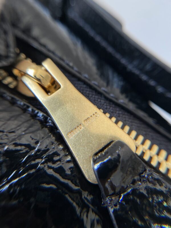 The MIU MIU Naplak Mini Handbag is crafted from glossy lambskin featuring metal logo plaque and zip closure. Dimensions: 18.5×10×14cm.