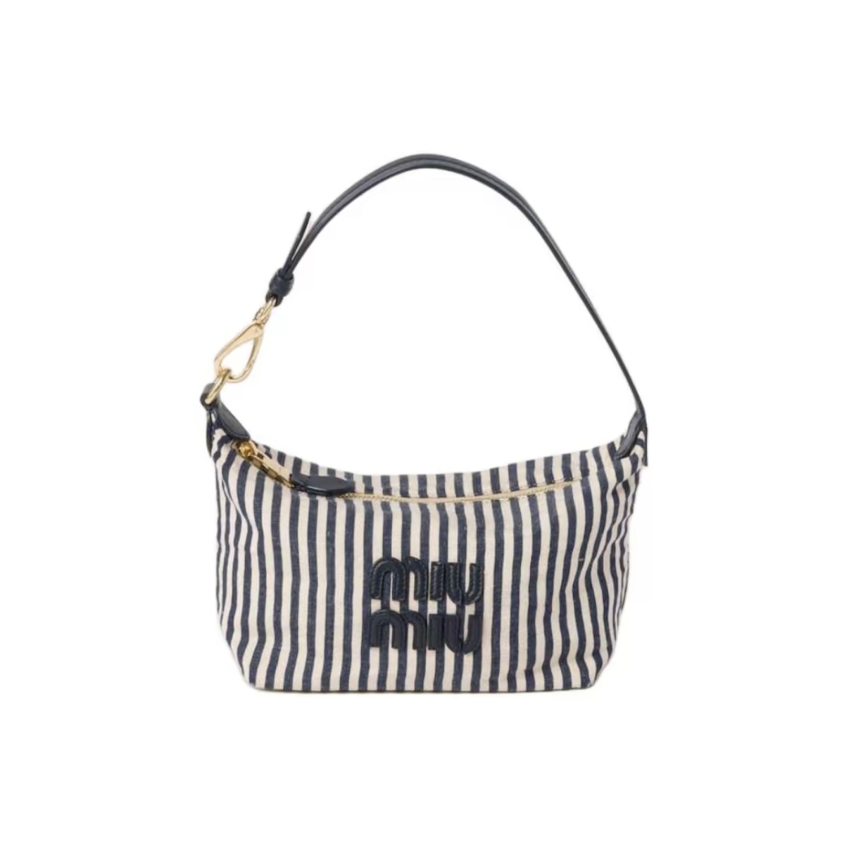 The MIU MIU Spirit Mini Bag crafted in dual-tone beige and blue fabric with zip closure and embroidered logo. Dimensions: 18.5×10×14cm.