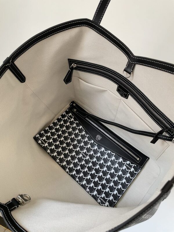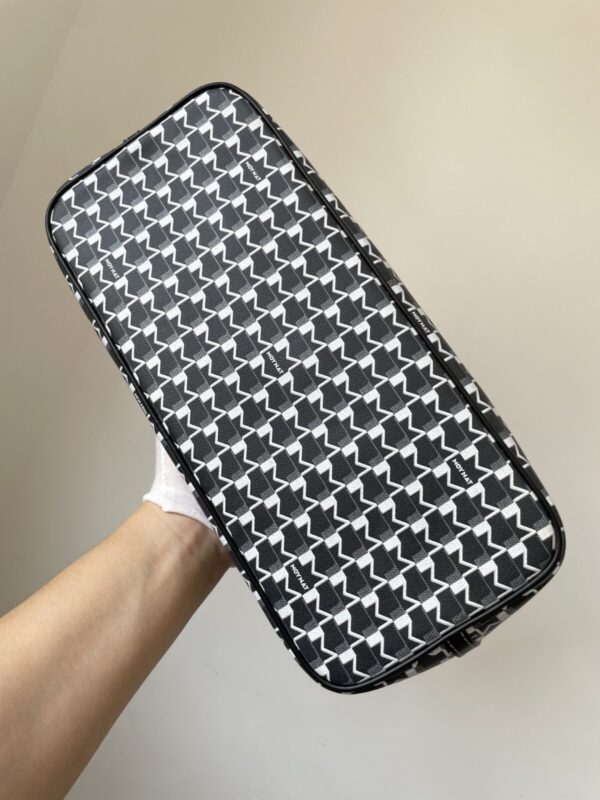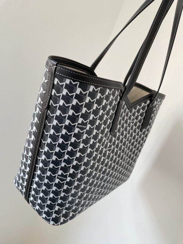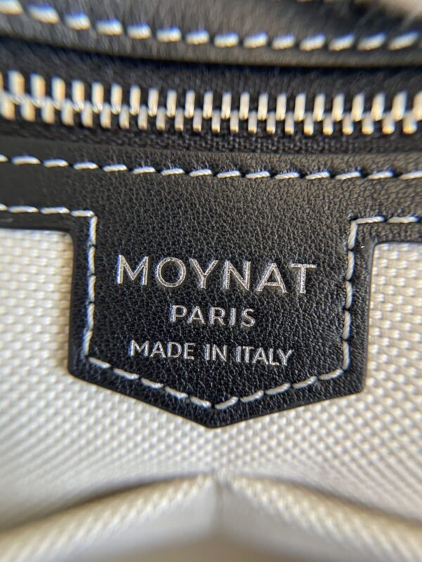 The Moynat Canvas 1920 Tote features signature M-lock hardware, detachable pouch, and leather edges. Dimensions: 39×12×24cm.