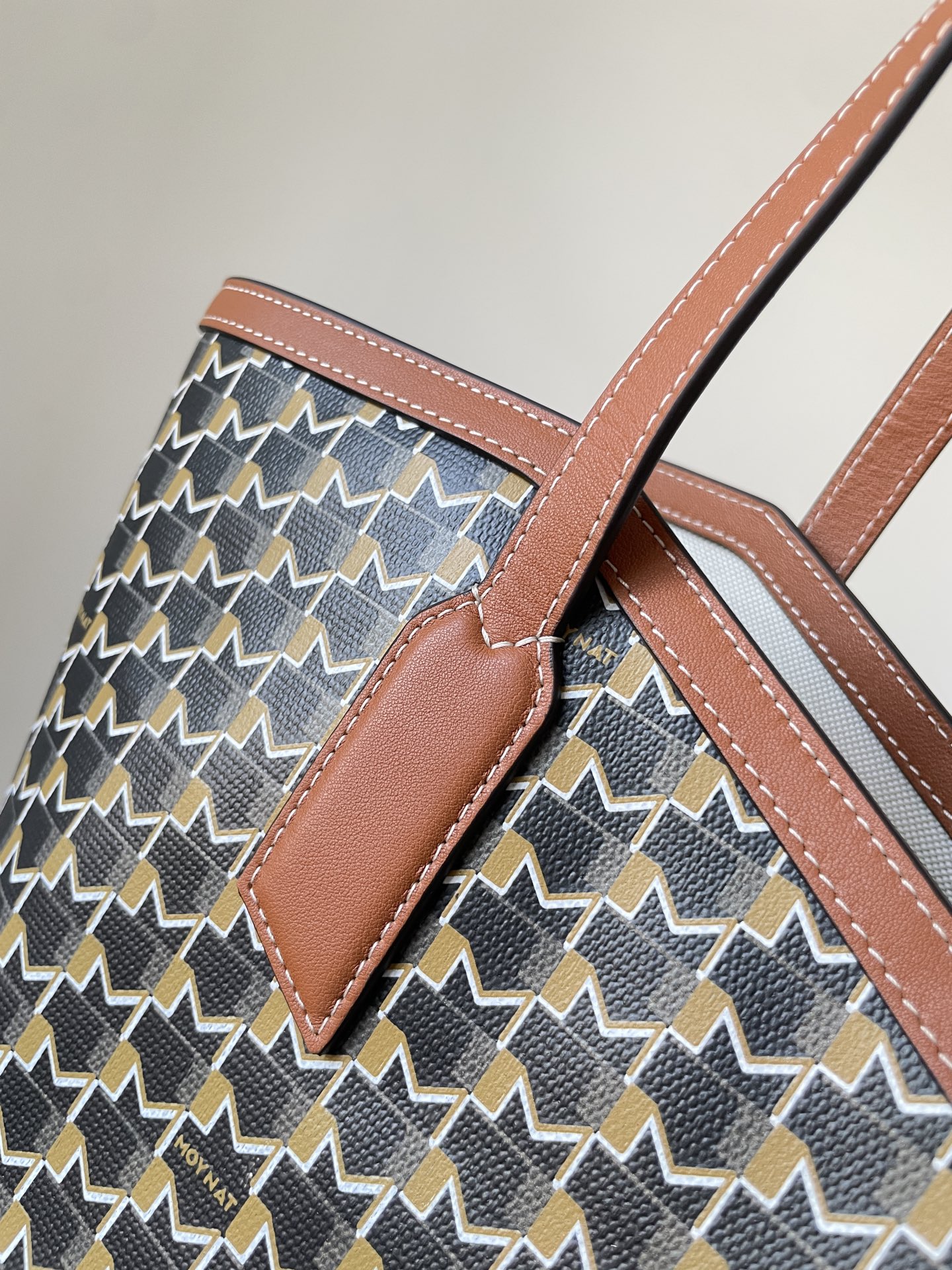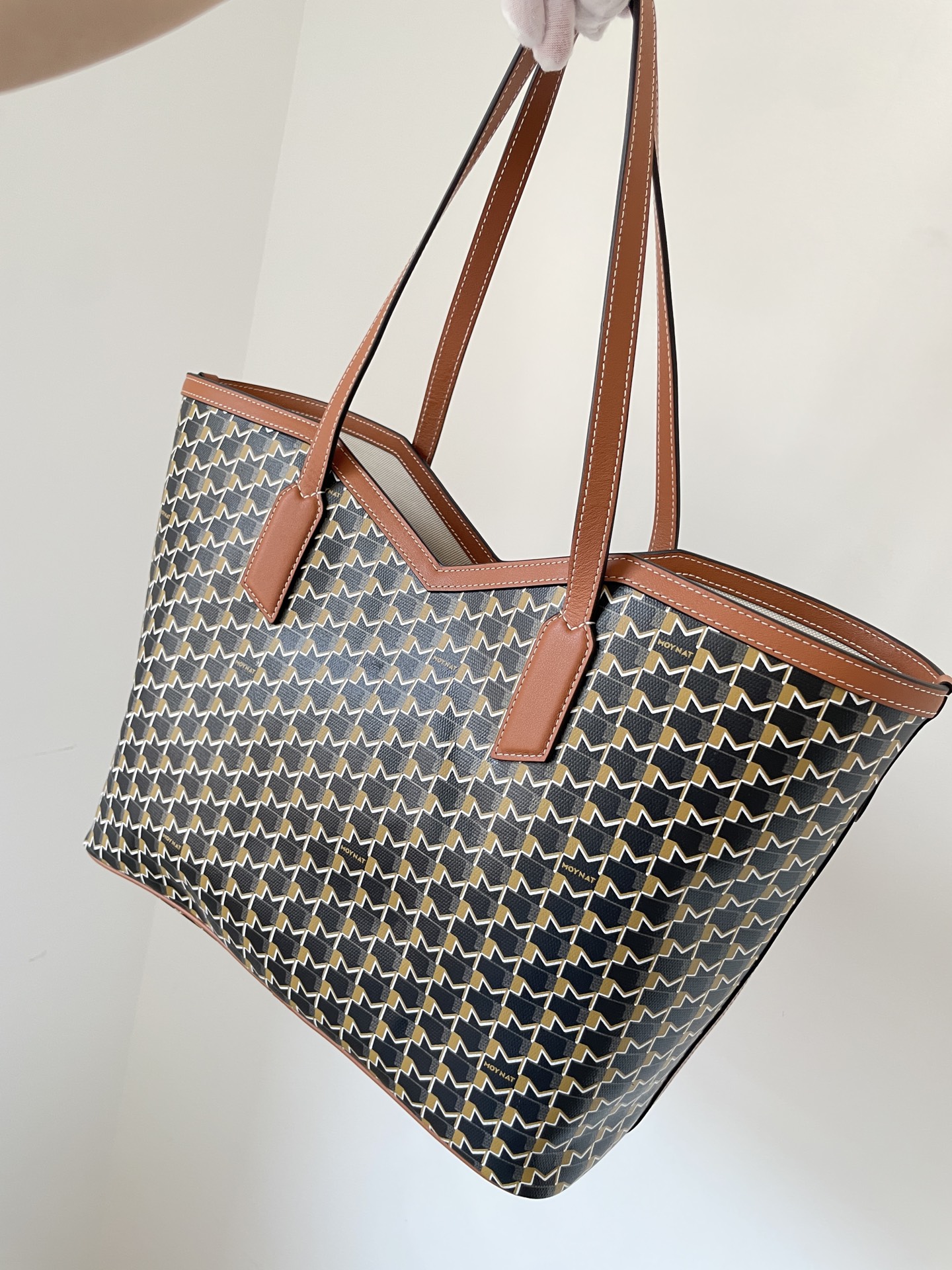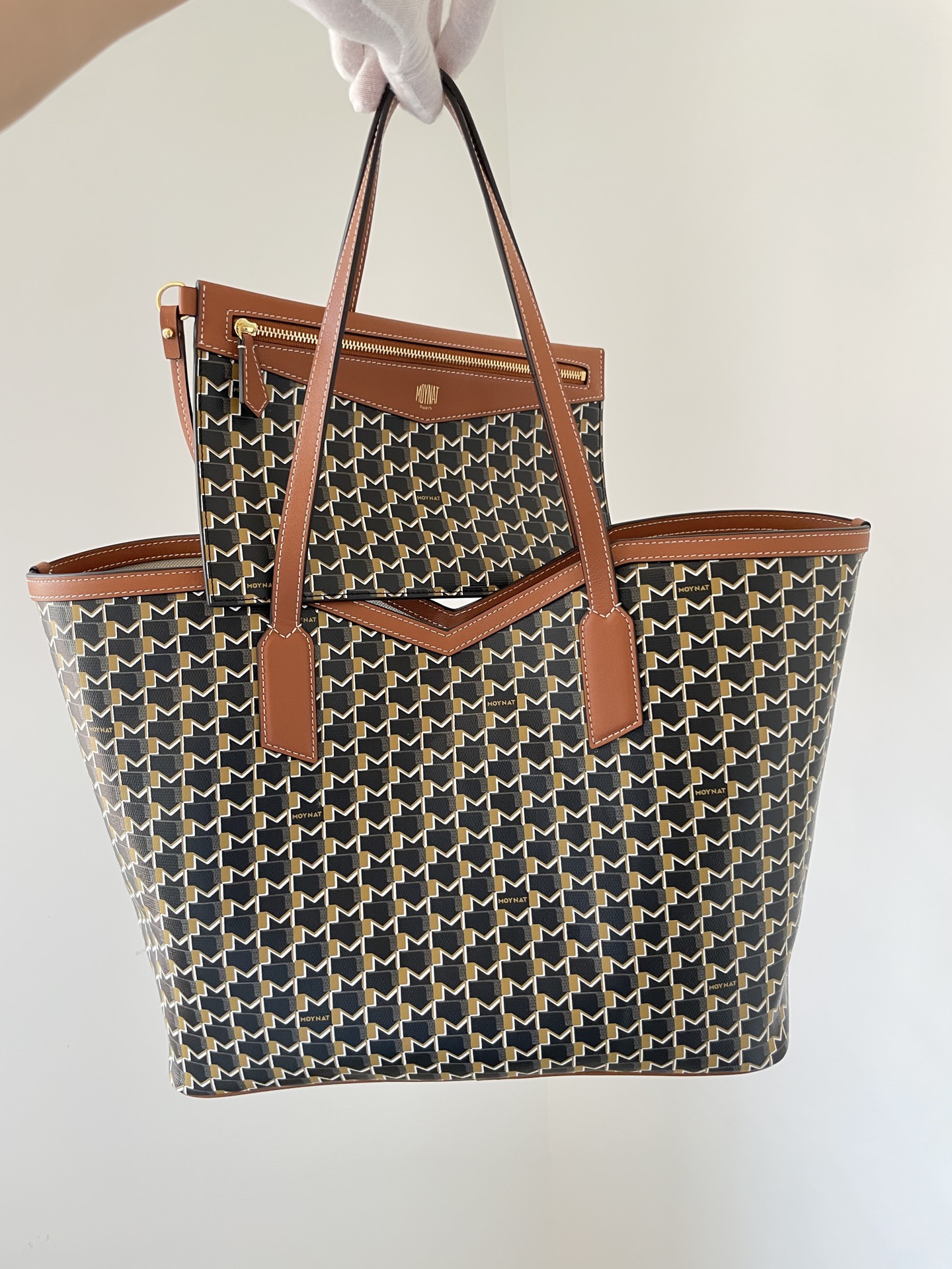 Moynat tote crafted from durable canvas with brown leather trim and detachable pouch — timeless and practical.