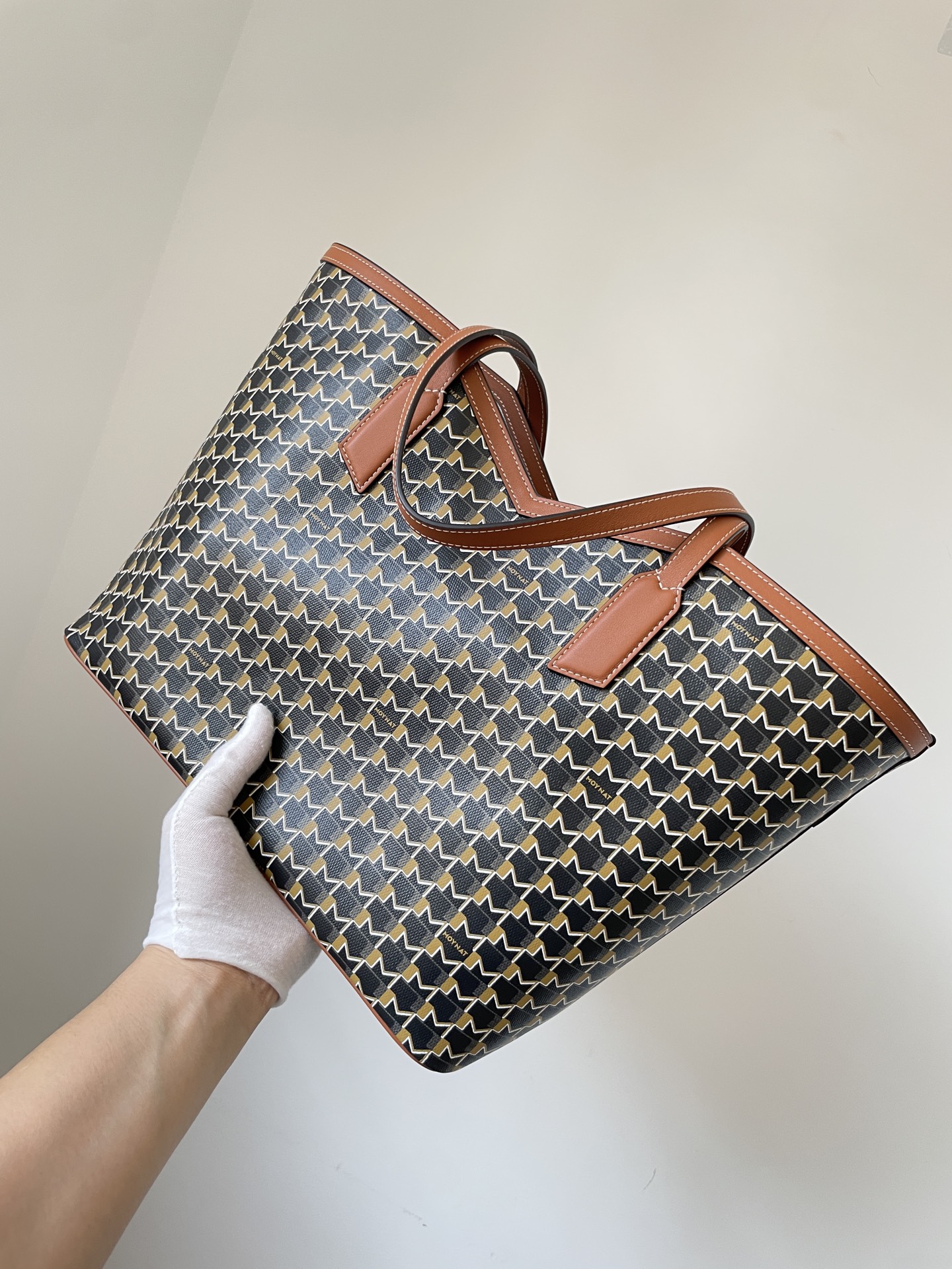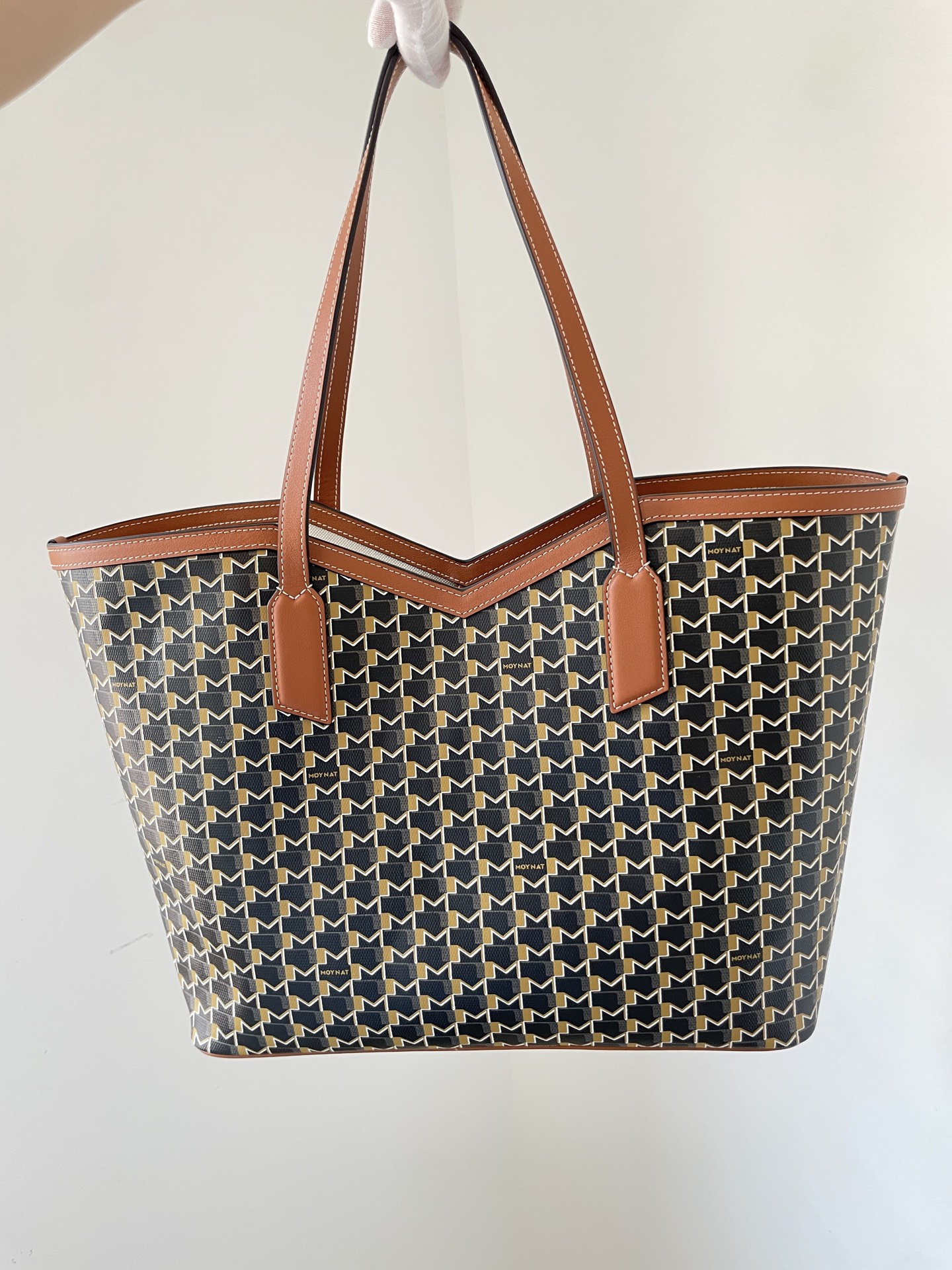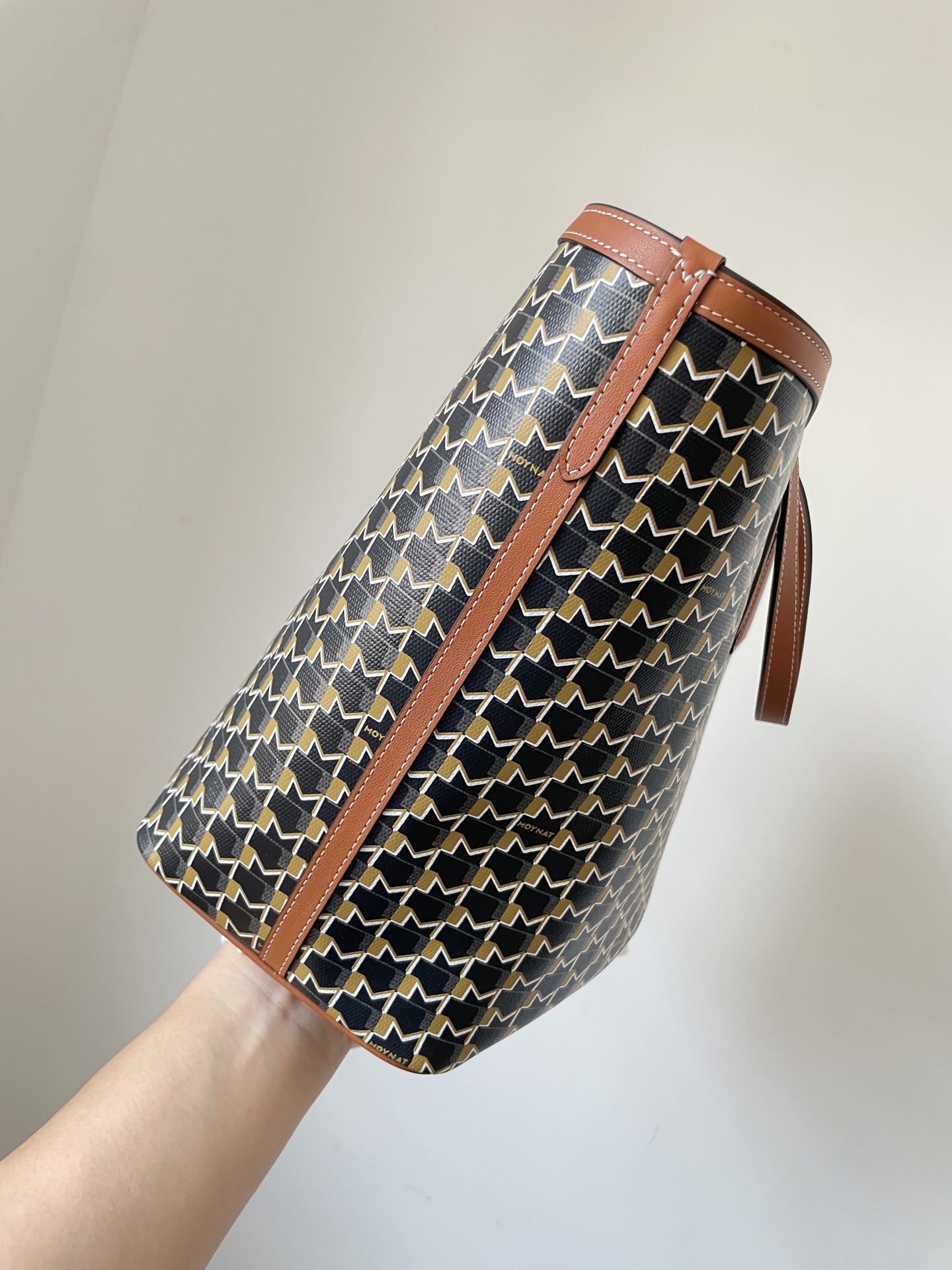 Moynat tote crafted from durable canvas with brown leather trim and detachable pouch — timeless and practical.