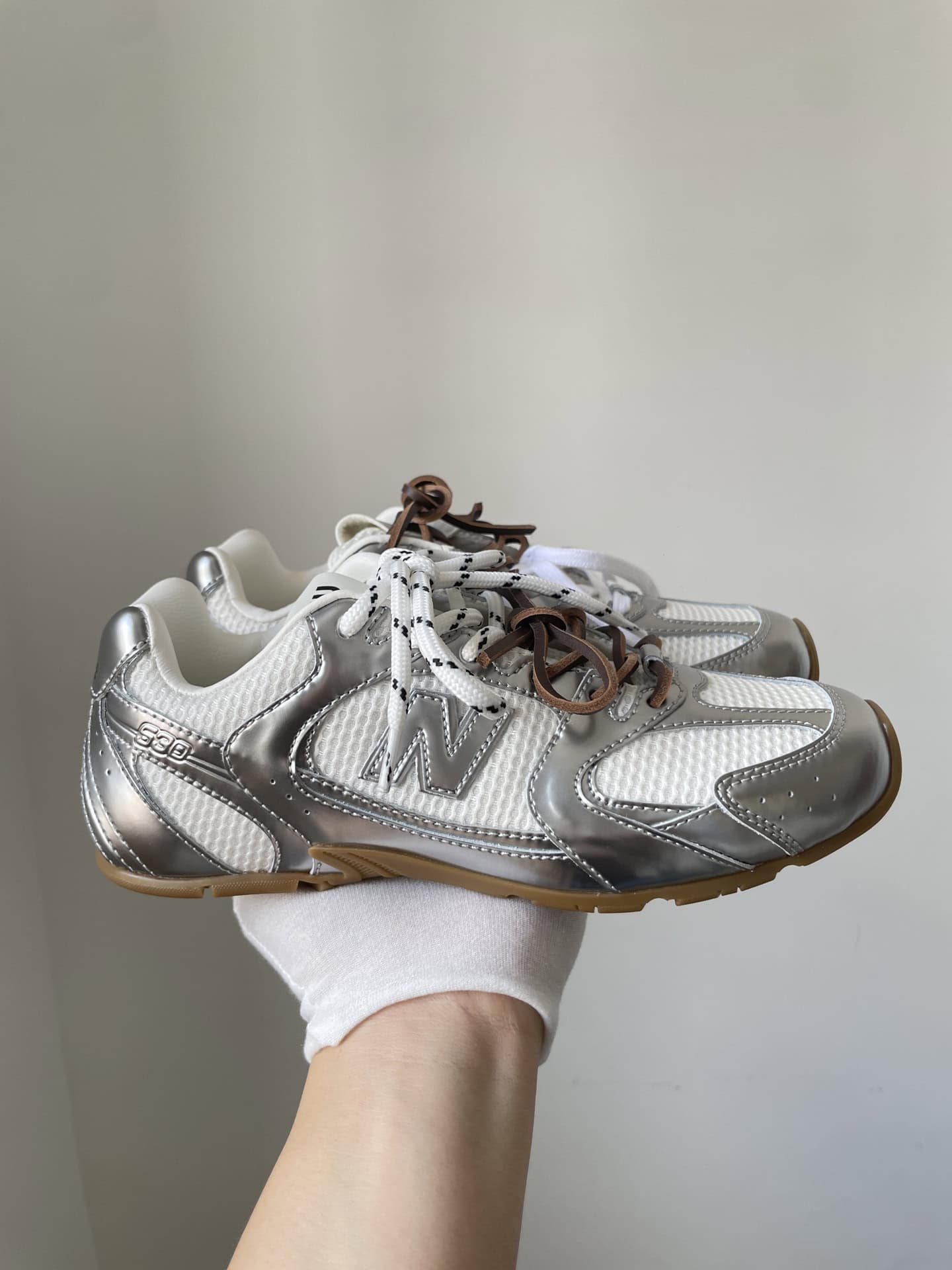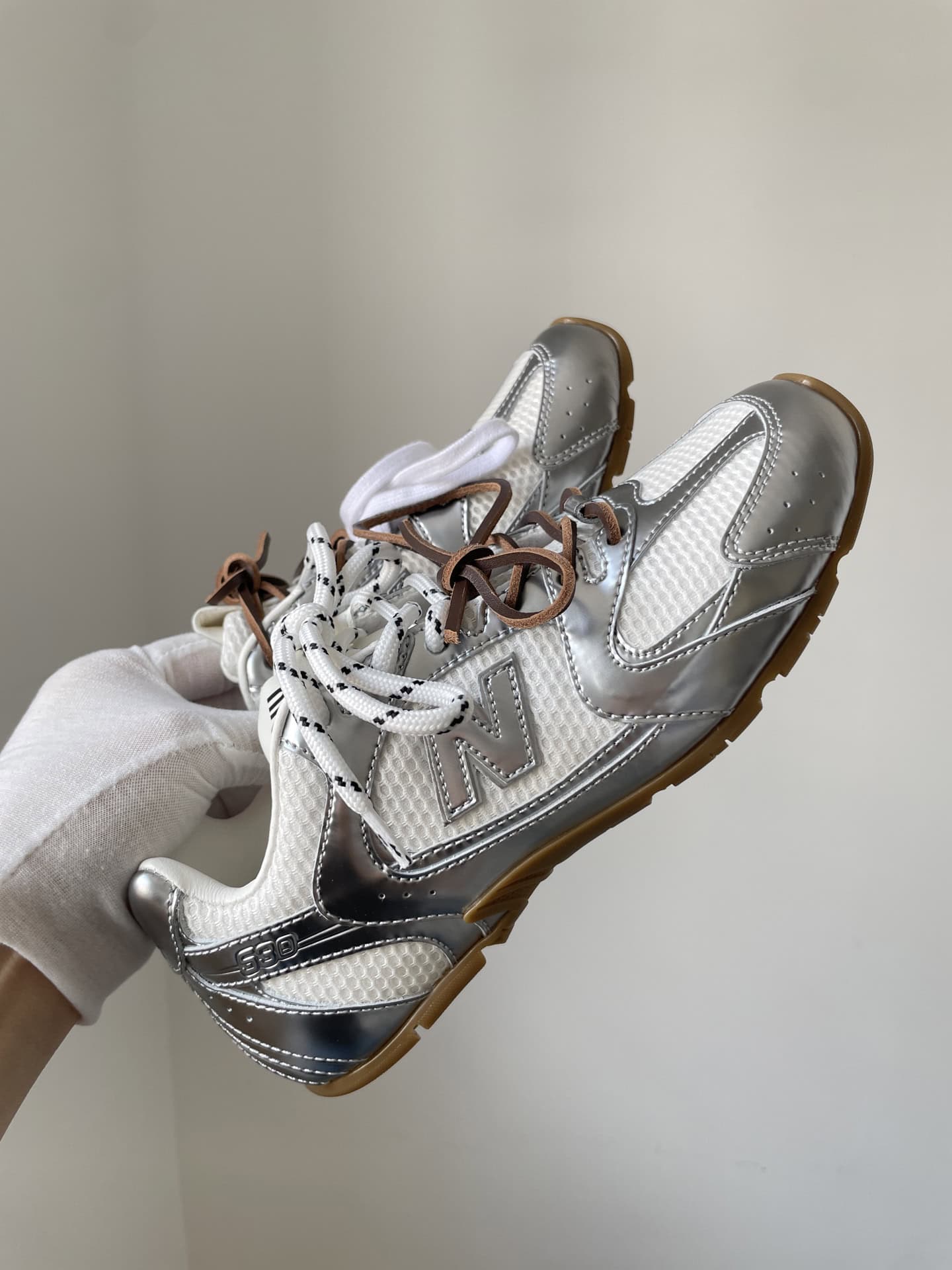 New Balance x Miu Miu NB 530 Lunar Silver Leather Lace-Up Trainers Women Silver crafted from premium materials with refined detailing, delivering sophistication, comfort, and timeless elegance for everyday wear.