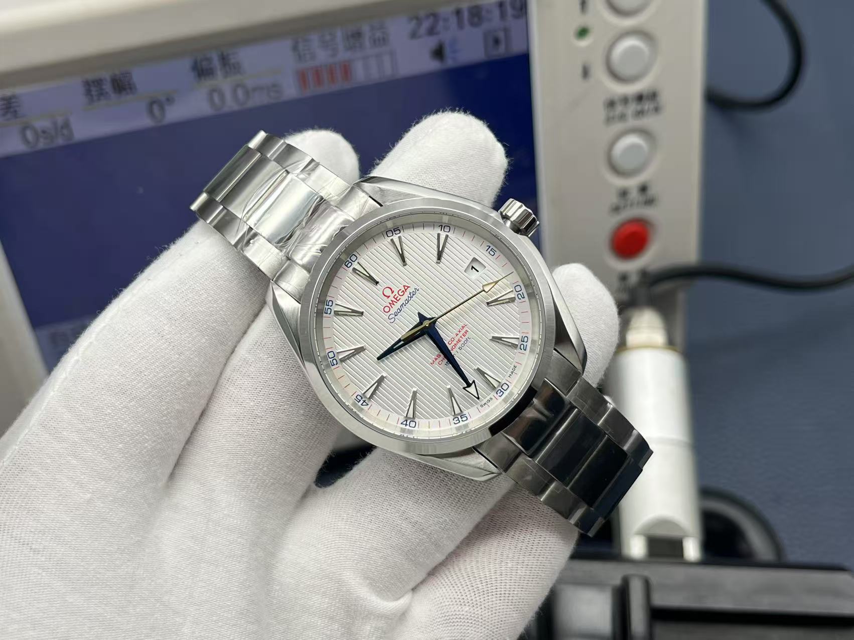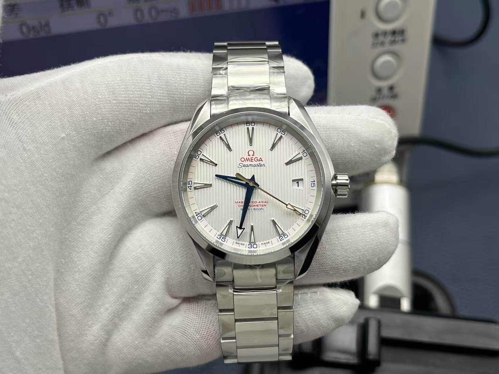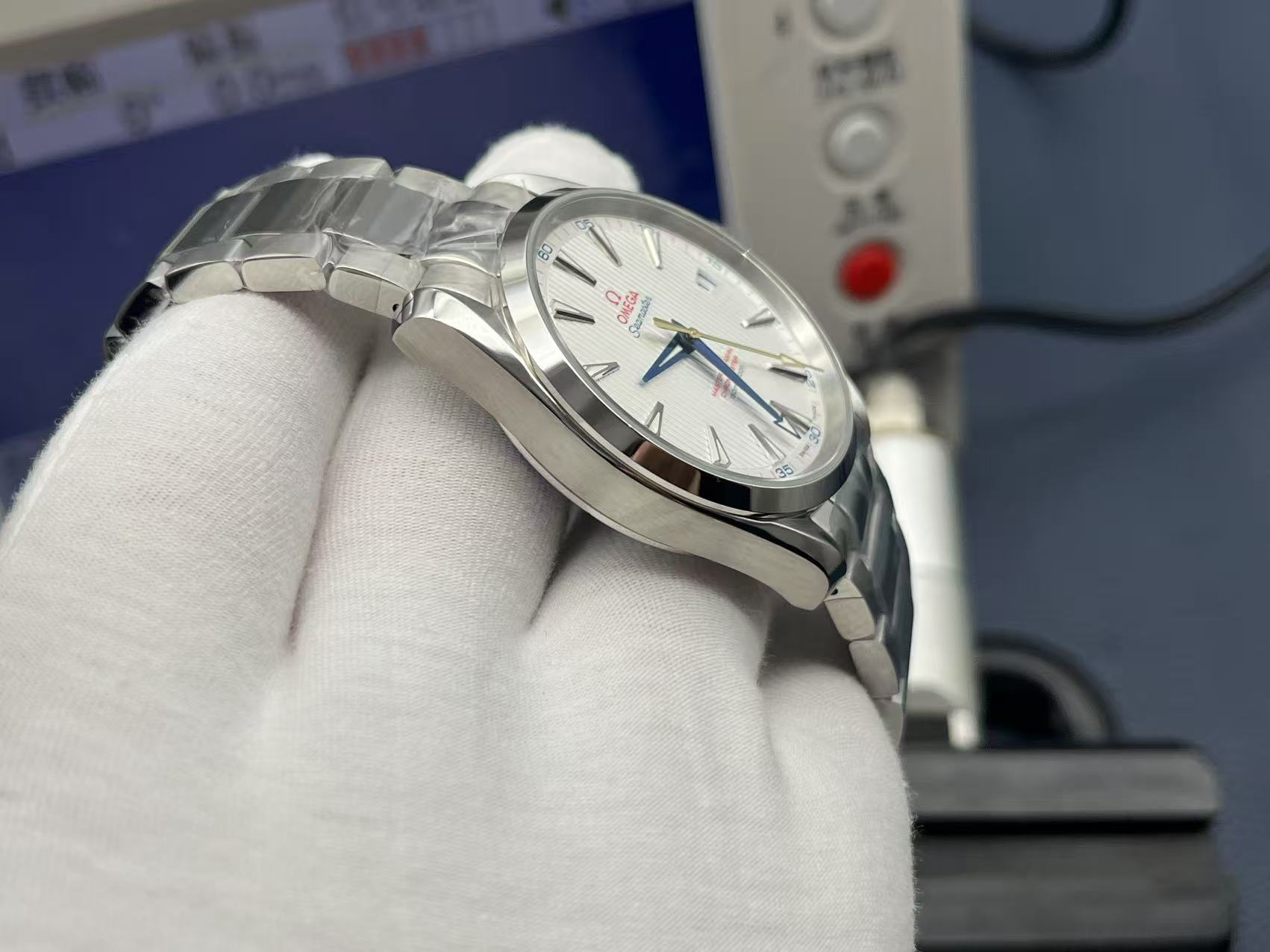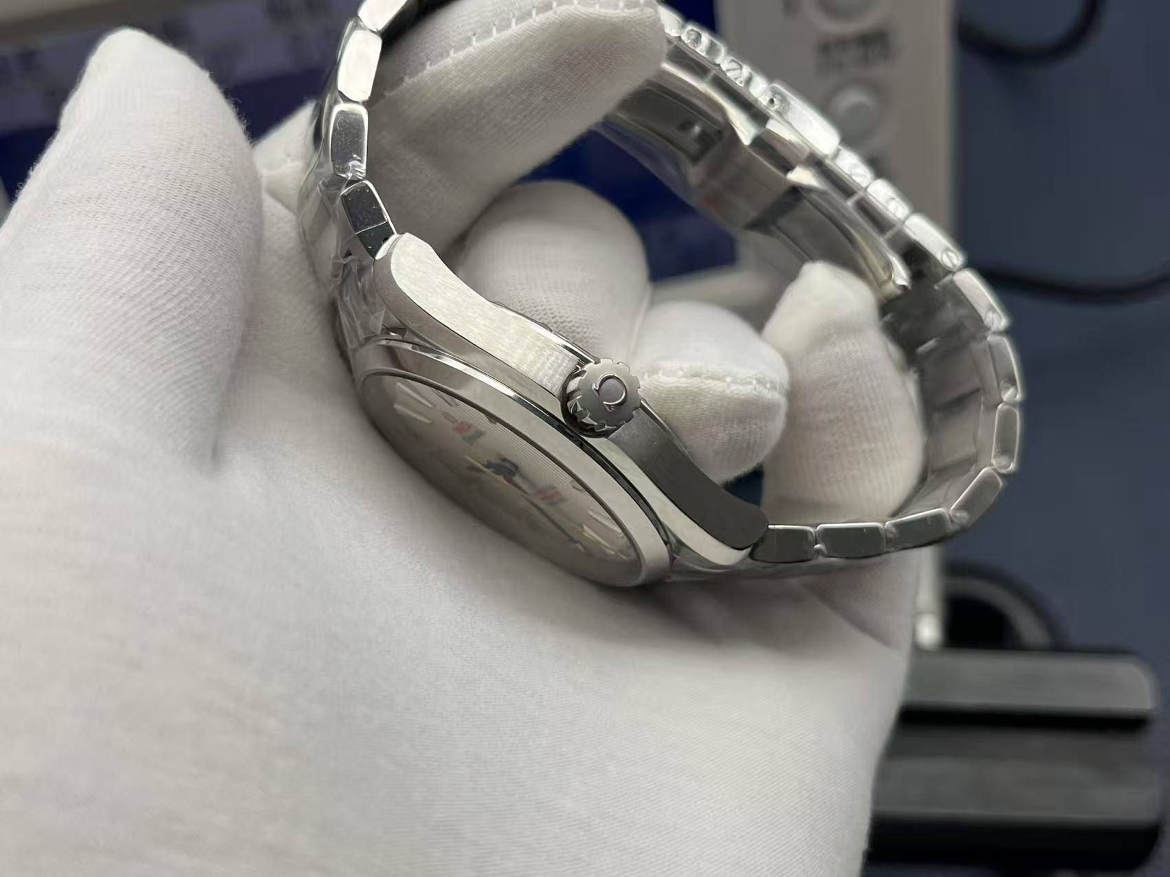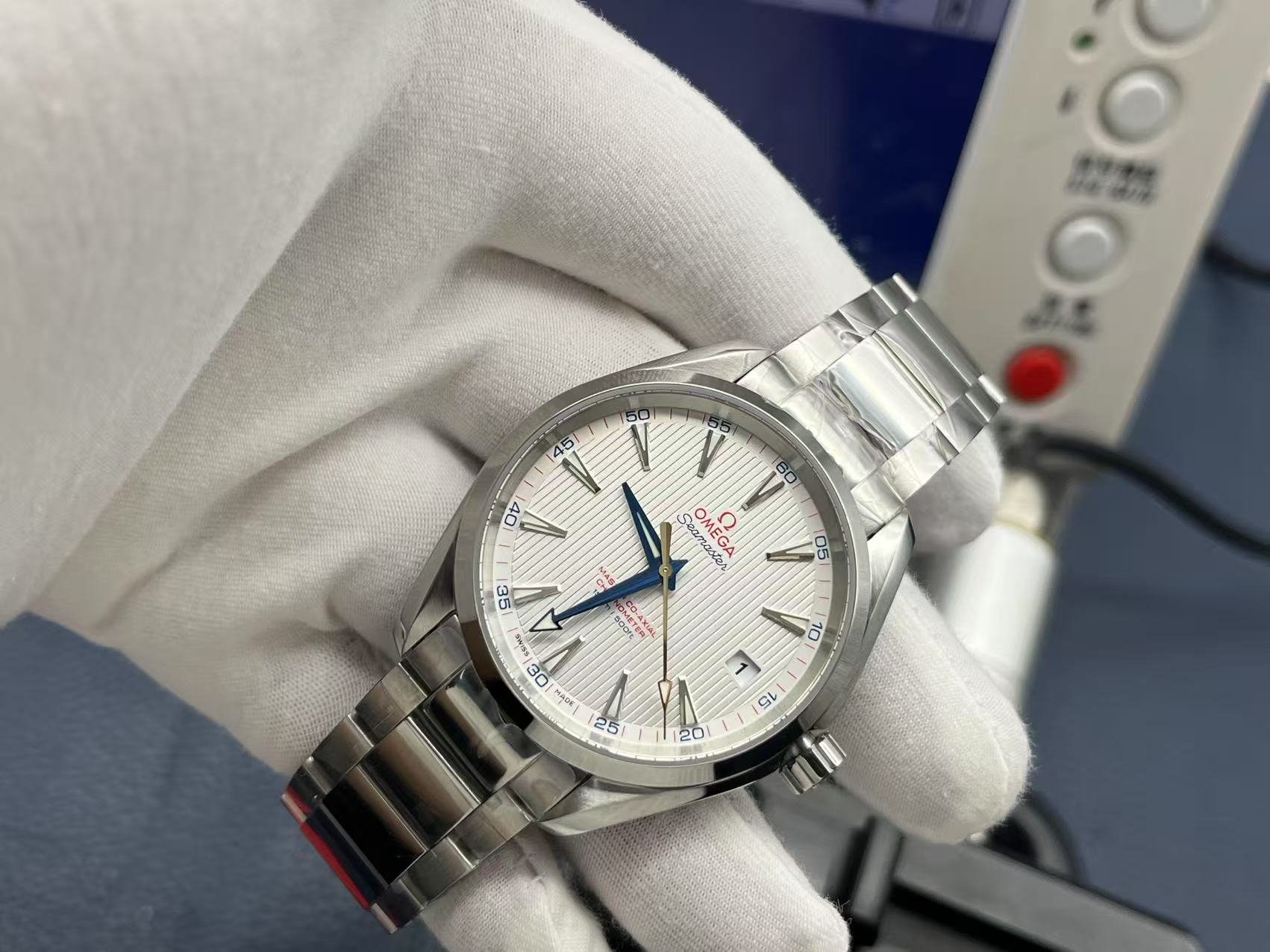 41.5mm stainless steel case, 13.5mm thickness. Sun‑brushed silver dial with horizontal teak pattern. Hands and indexes coated with white Super‑LumiNova. Sapphire crystal with anti‑reflective treatment. Transparent caseback showing Omega Calibre 8500, precise and stable. Bracelet with butterfly clasp. Elegant, versatile sports luxury watch.