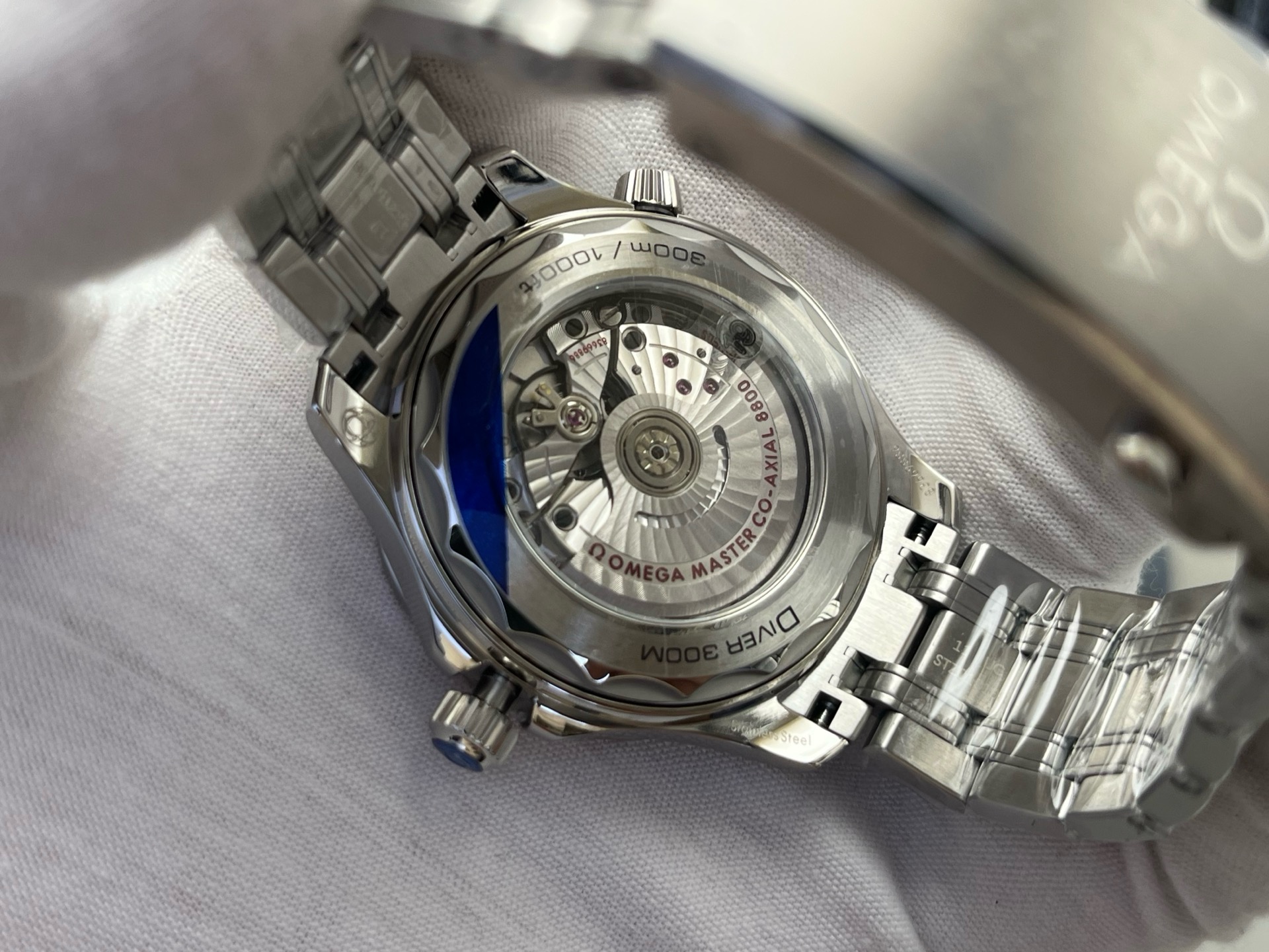 The OMEGA Seamaster Diver 300M 42mm is engineered with precision. It houses the VS 8800 automatic movement offering 54 hours of power reserve. The transparent caseback reveals its decorated movement, with all gears, screws, and jewels fully functional. The stainless steel construction and domed sapphire crystal ensure durability, while the professional diving features deliver exceptional underwater performance.
