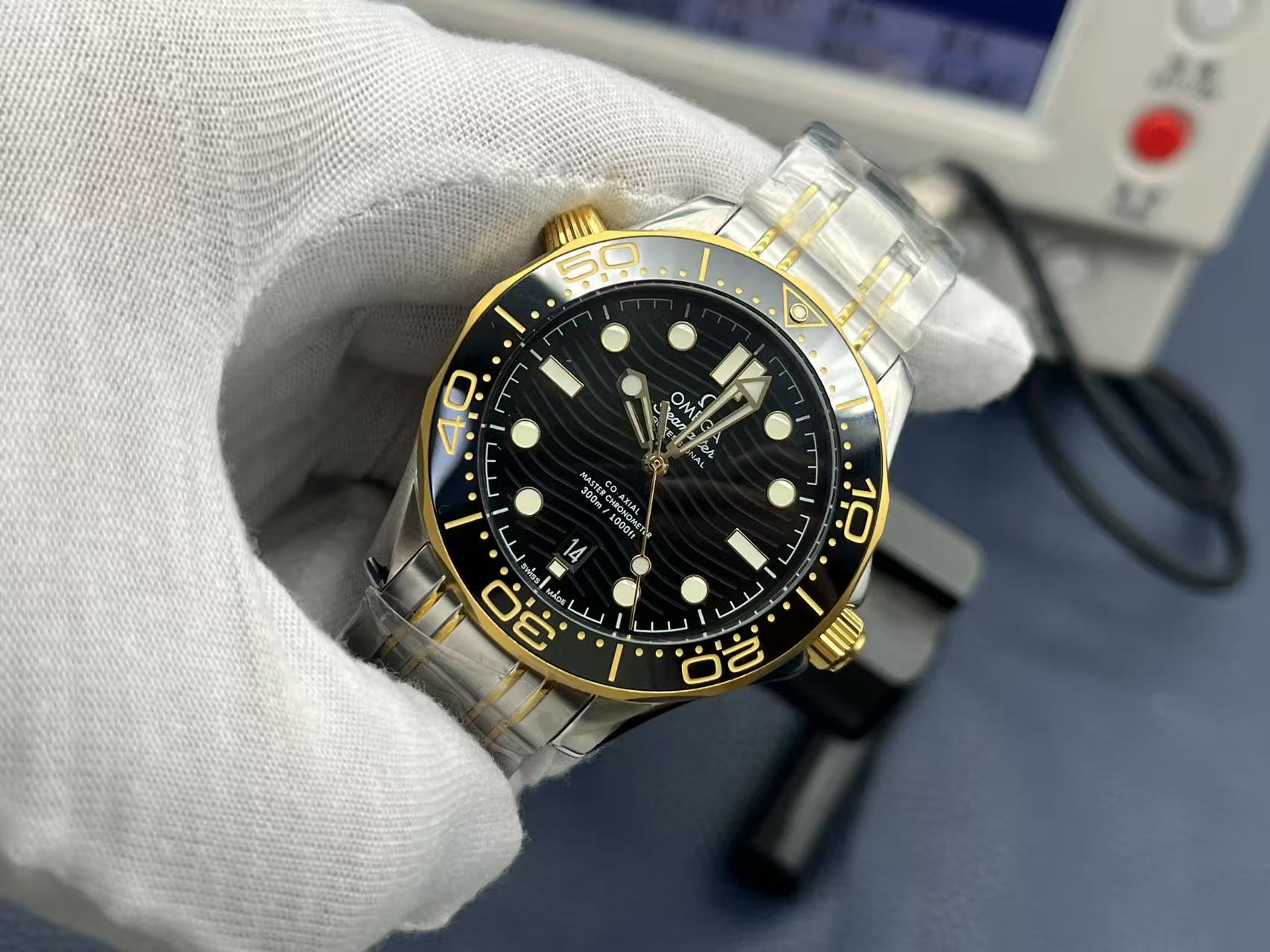 Hand‑polished sapphire crystal glass, scratch‑resistant. Equipped with VS custom 8800 movement, 72h power reserve. Polished ceramic dial with wave pattern, transparent caseback, anti‑magnetic. Unidirectional ceramic bezel with white enamel diving scale. Steel case and bracelet with folding clasp. Super‑LumiNova on hands and hour markers. Professional helium escape valve and 300m waterproof performance.
